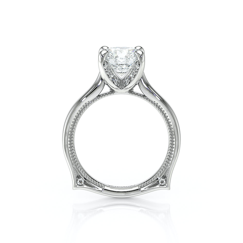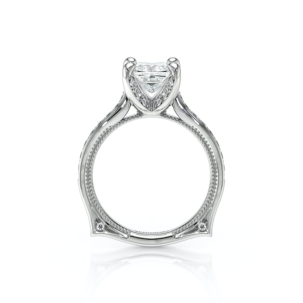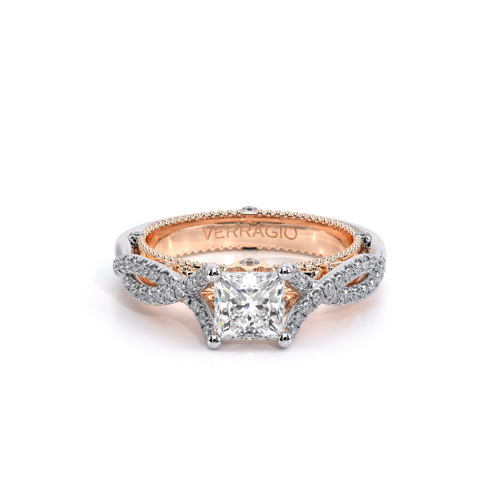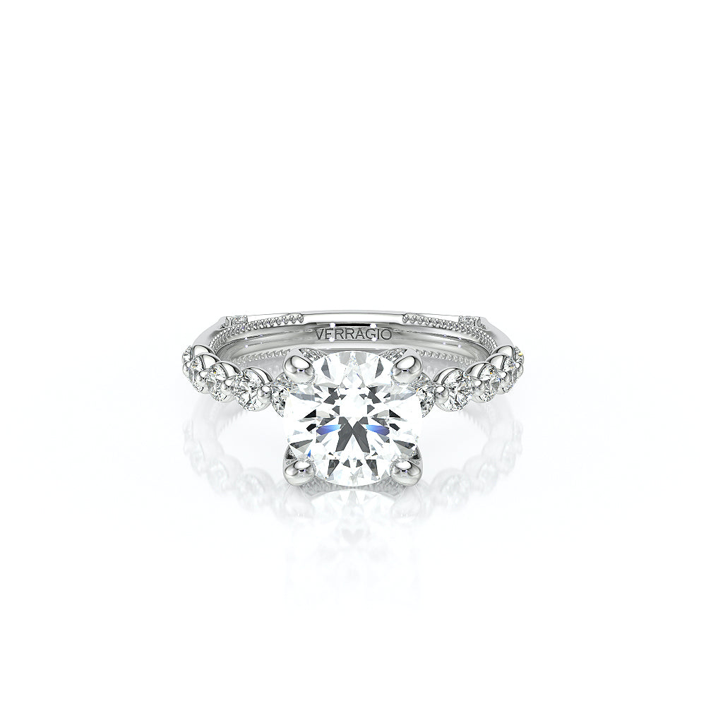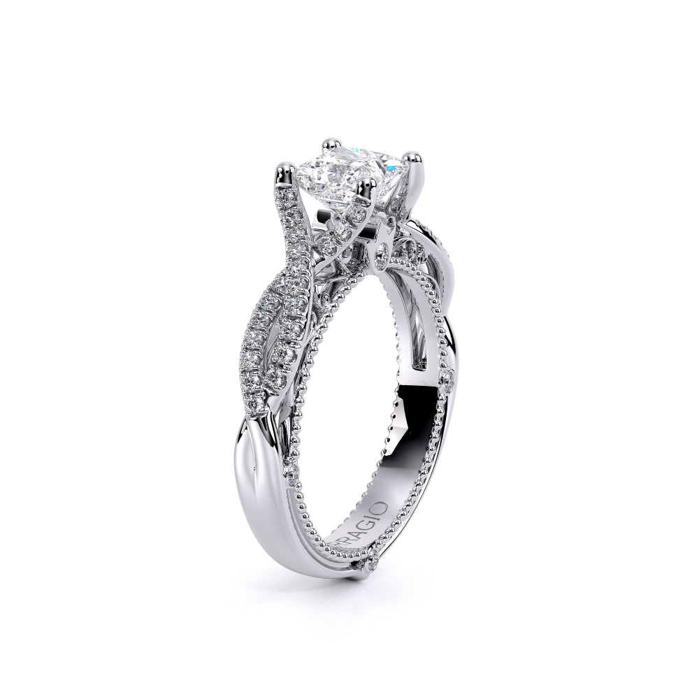 VENETIAN-5003 engagement ring from the Venetian Collection, features a pave' set diamond twisted shank showcasing handcrafted lace and Verragio signature beading. This beautiful vintage four-prong setting gives an illusion of a floating center stone and can accommodate almost any diamond cut desired.