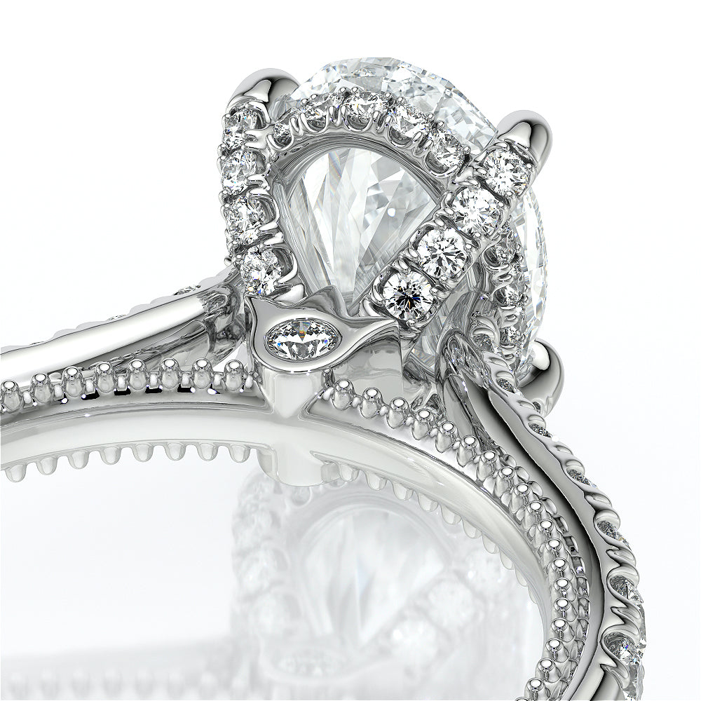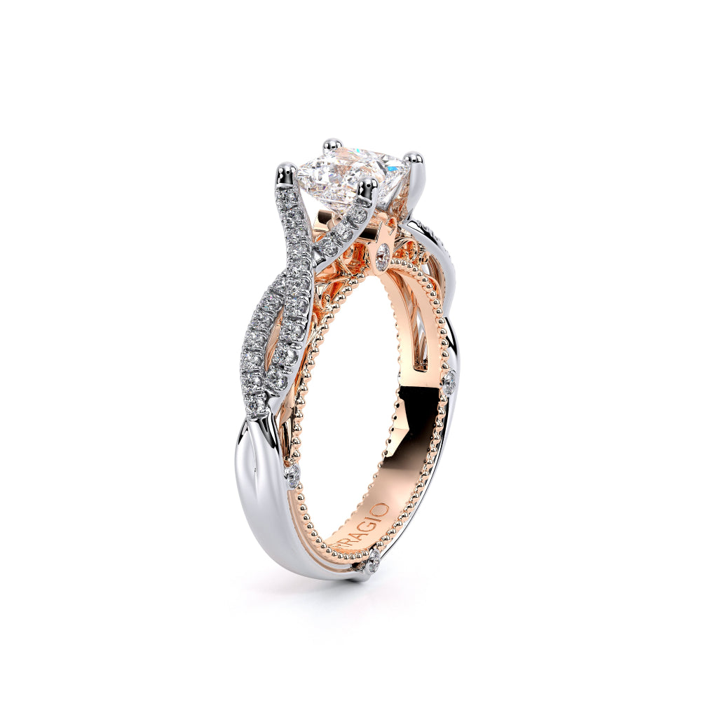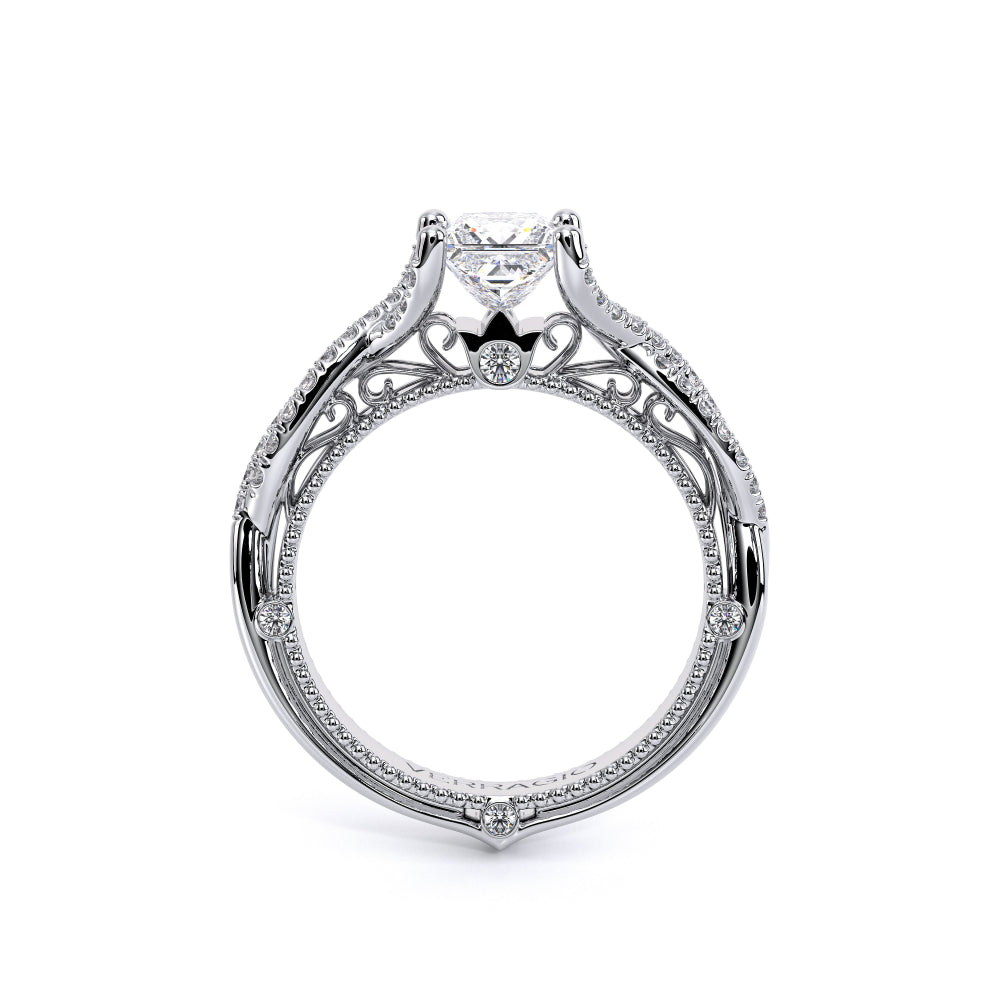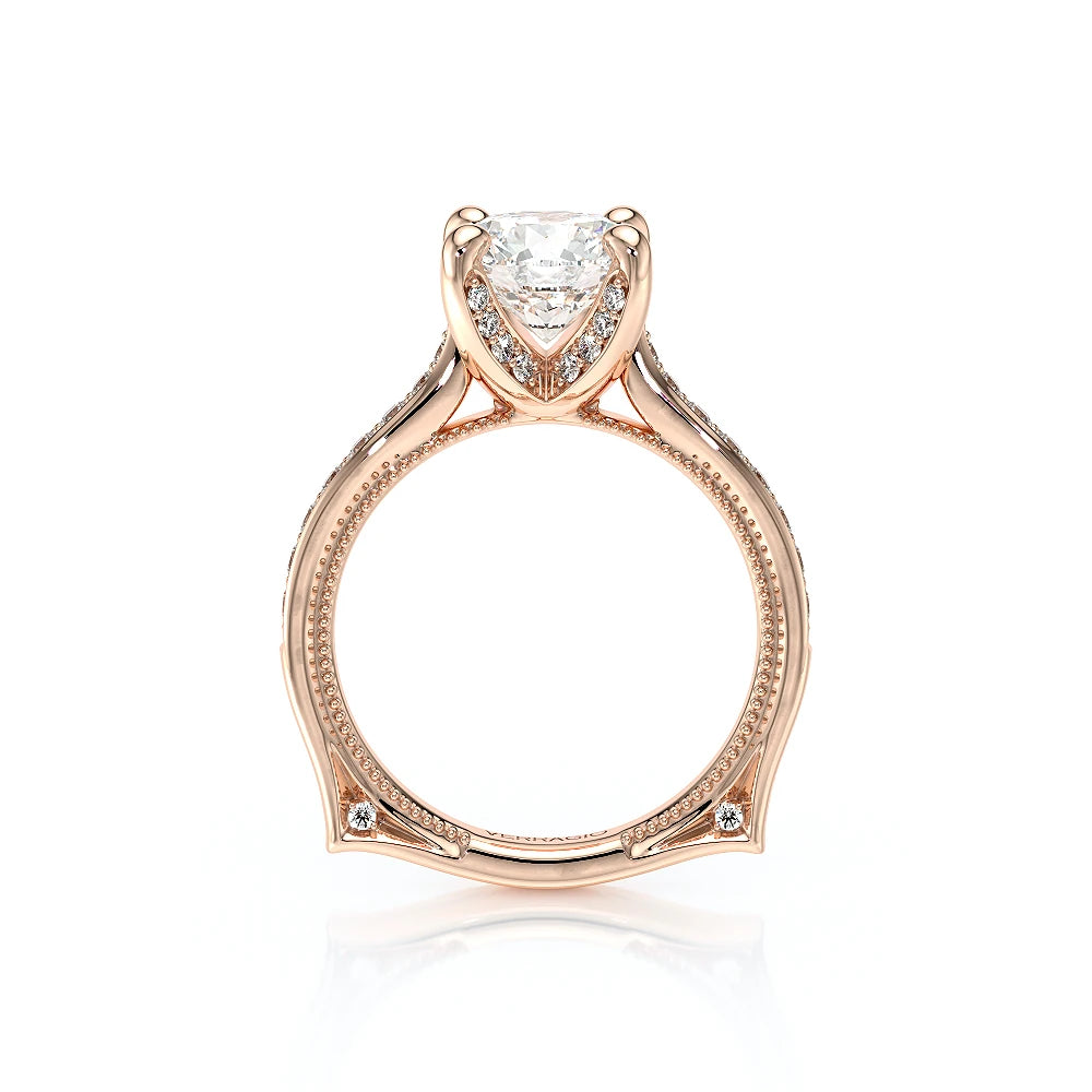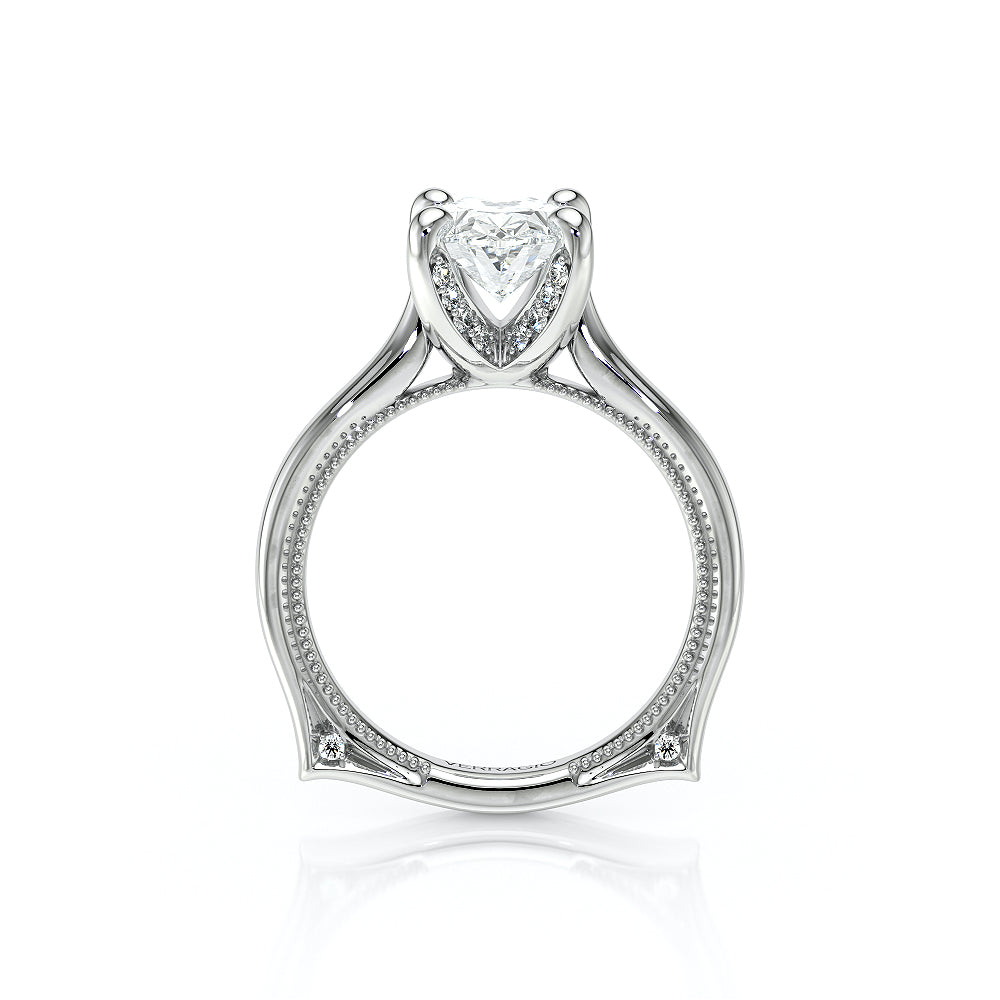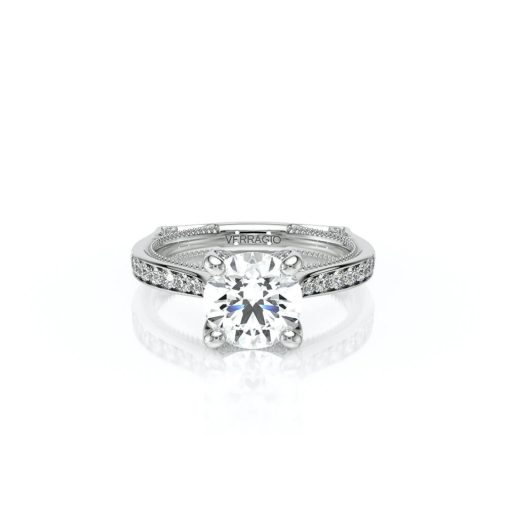 VENETIAN-5003 engagement ring from the Venetian Collection, features a pave' set diamond twisted shank showcasing handcrafted lace and Verragio signature beading. This beautiful vintage four-prong setting gives an illusion of a floating center stone and can accommodate almost any diamond cut desired.