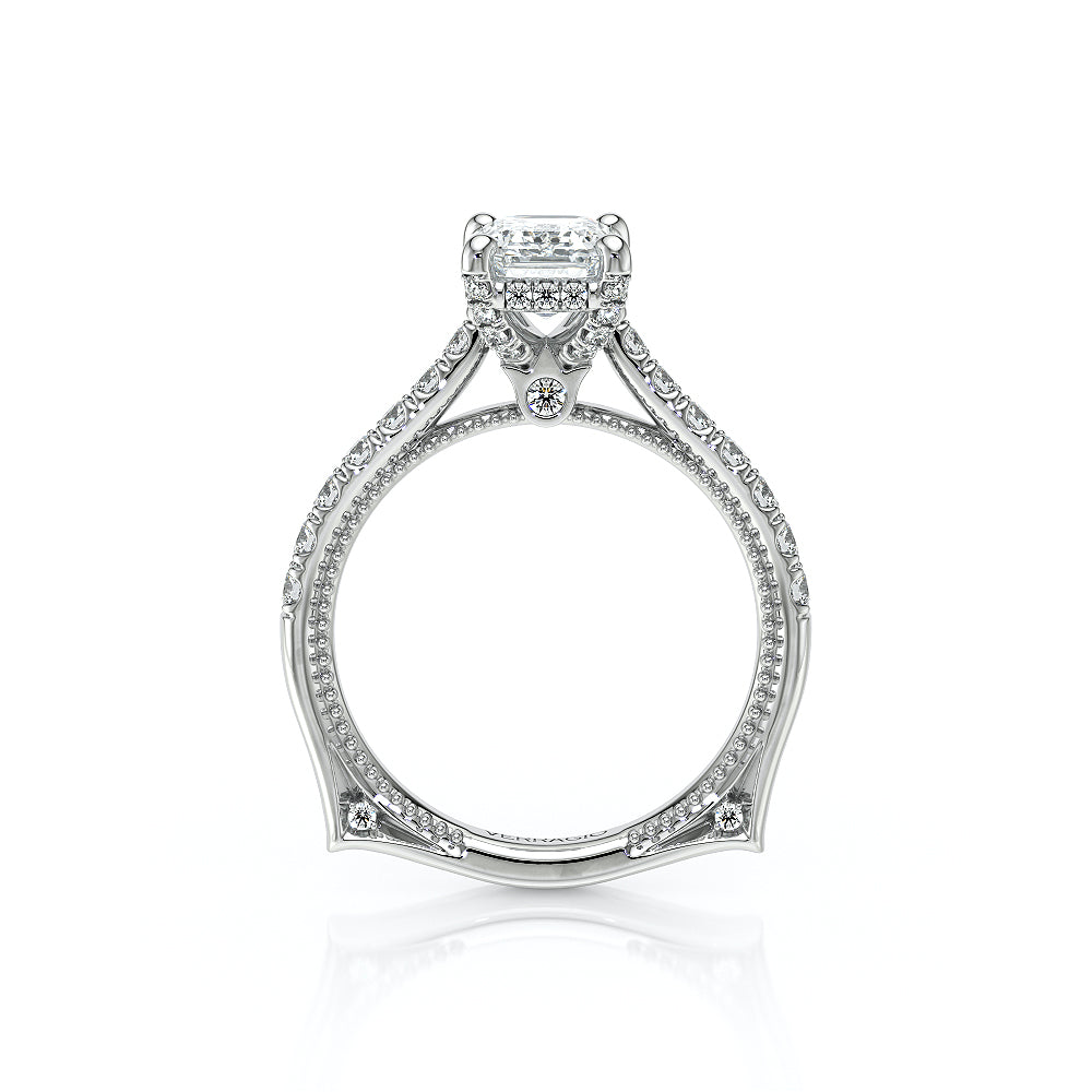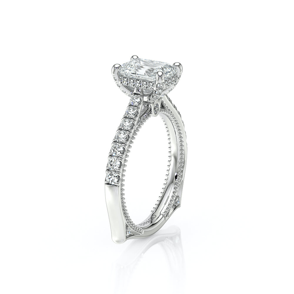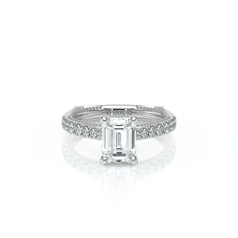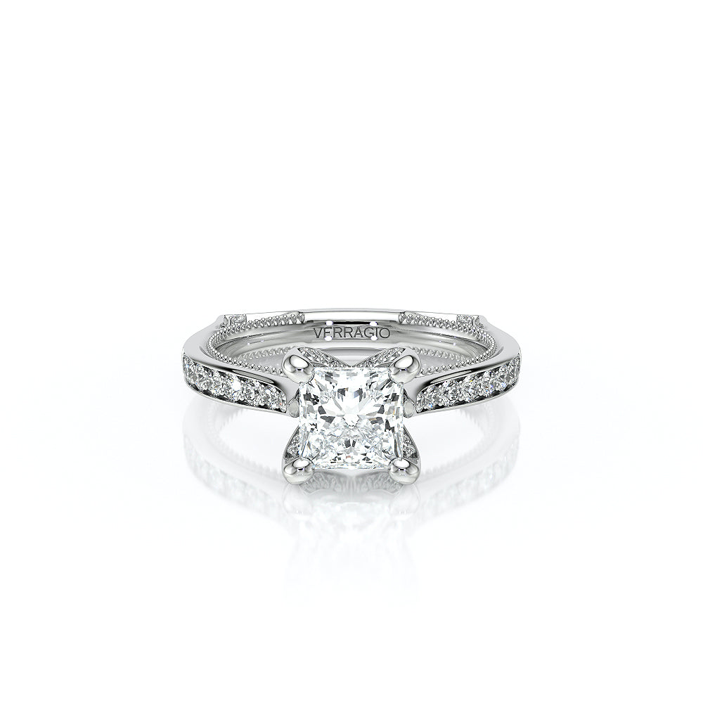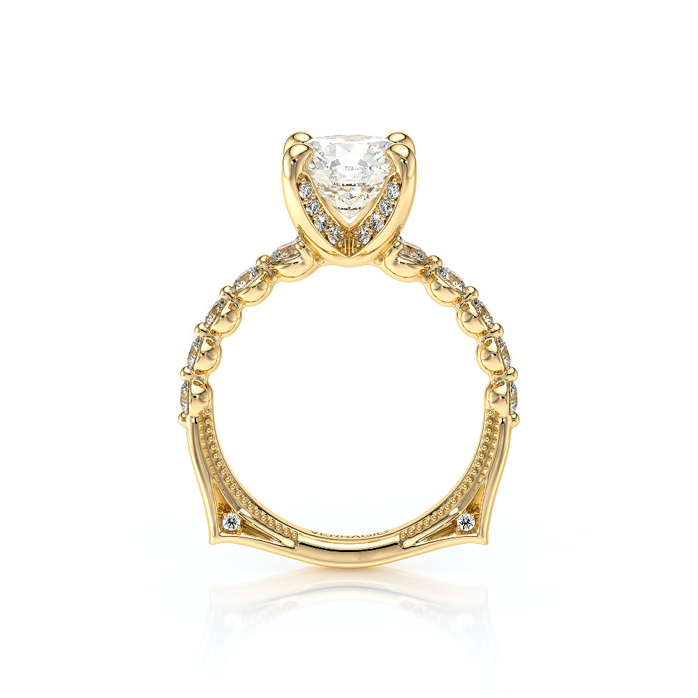 VENETIAN-5003 engagement ring from the Venetian Collection, features a pave' set diamond twisted shank showcasing handcrafted lace and Verragio signature beading. This beautiful vintage four-prong setting gives an illusion of a floating center stone and can accommodate almost any diamond cut desired.