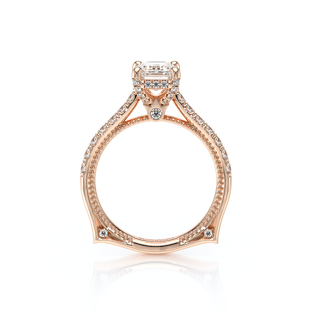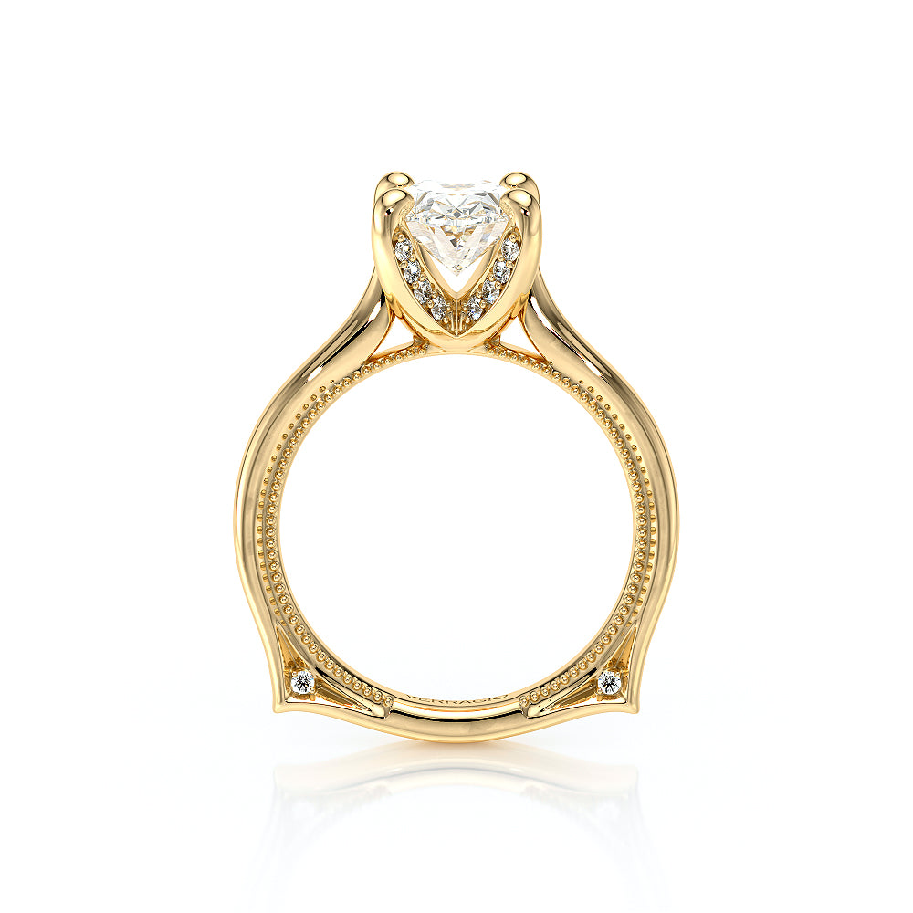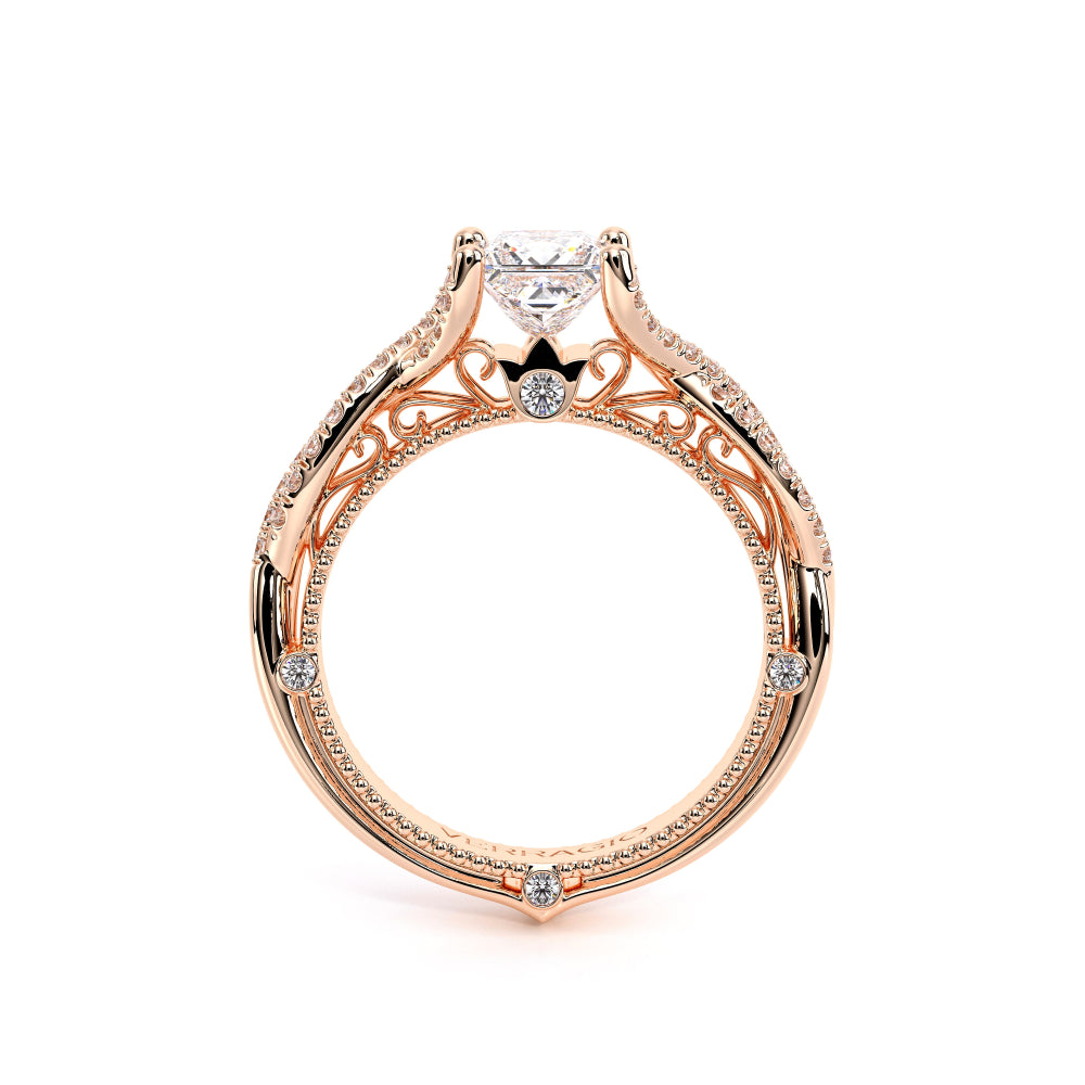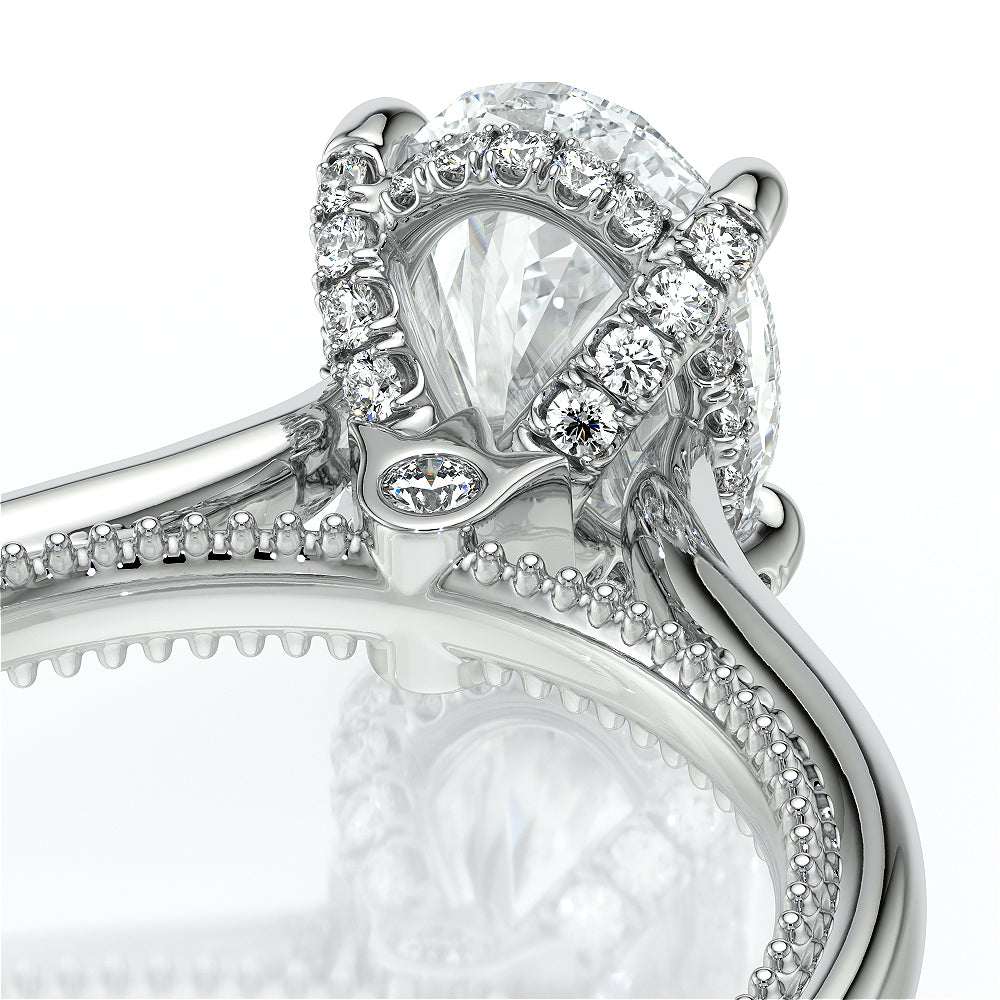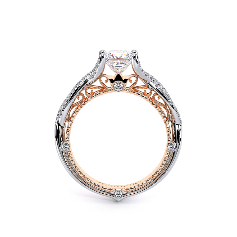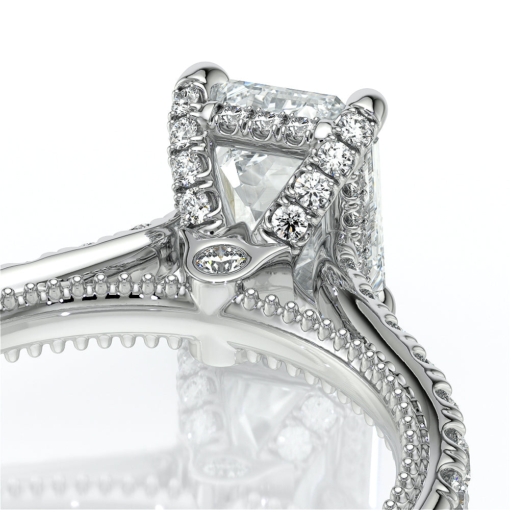 VENETIAN-5003 engagement ring from the Venetian Collection, features a pave' set diamond twisted shank showcasing handcrafted lace and Verragio signature beading. This beautiful vintage four-prong setting gives an illusion of a floating center stone and can accommodate almost any diamond cut desired.