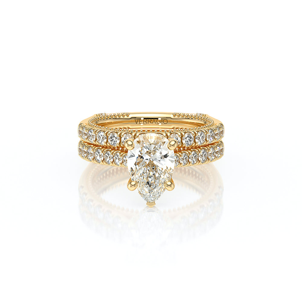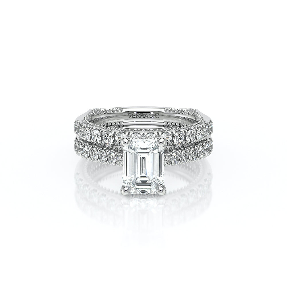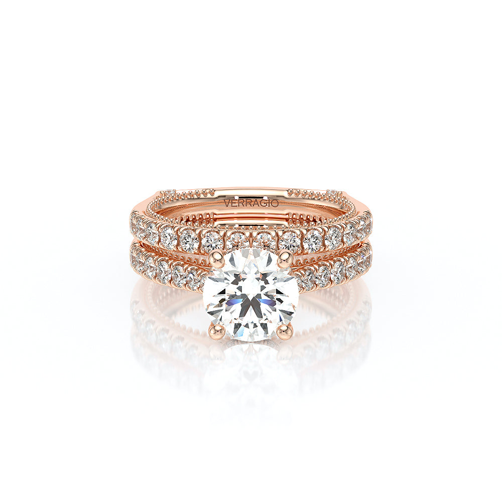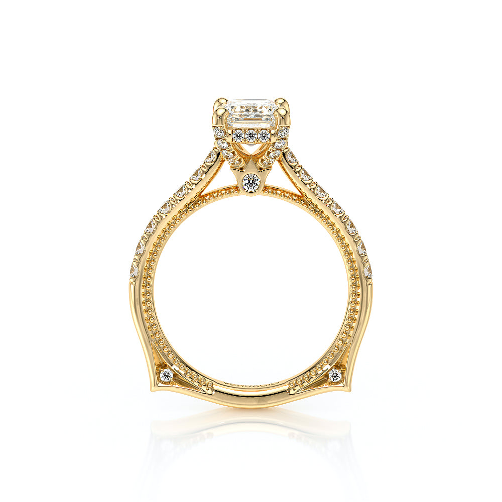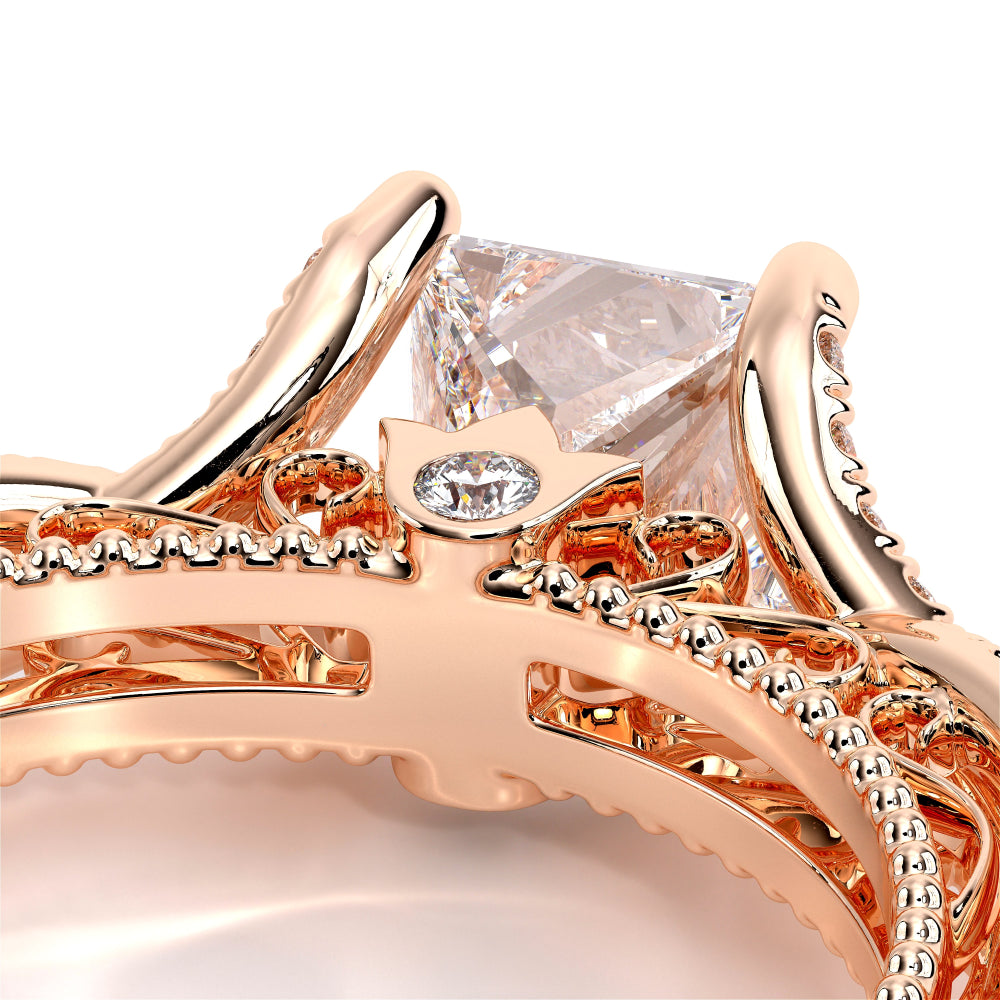 VENETIAN-5003 engagement ring from the Venetian Collection, features a pave' set diamond twisted shank showcasing handcrafted lace and Verragio signature beading. This beautiful vintage four-prong setting gives an illusion of a floating center stone and can accommodate almost any diamond cut desired.