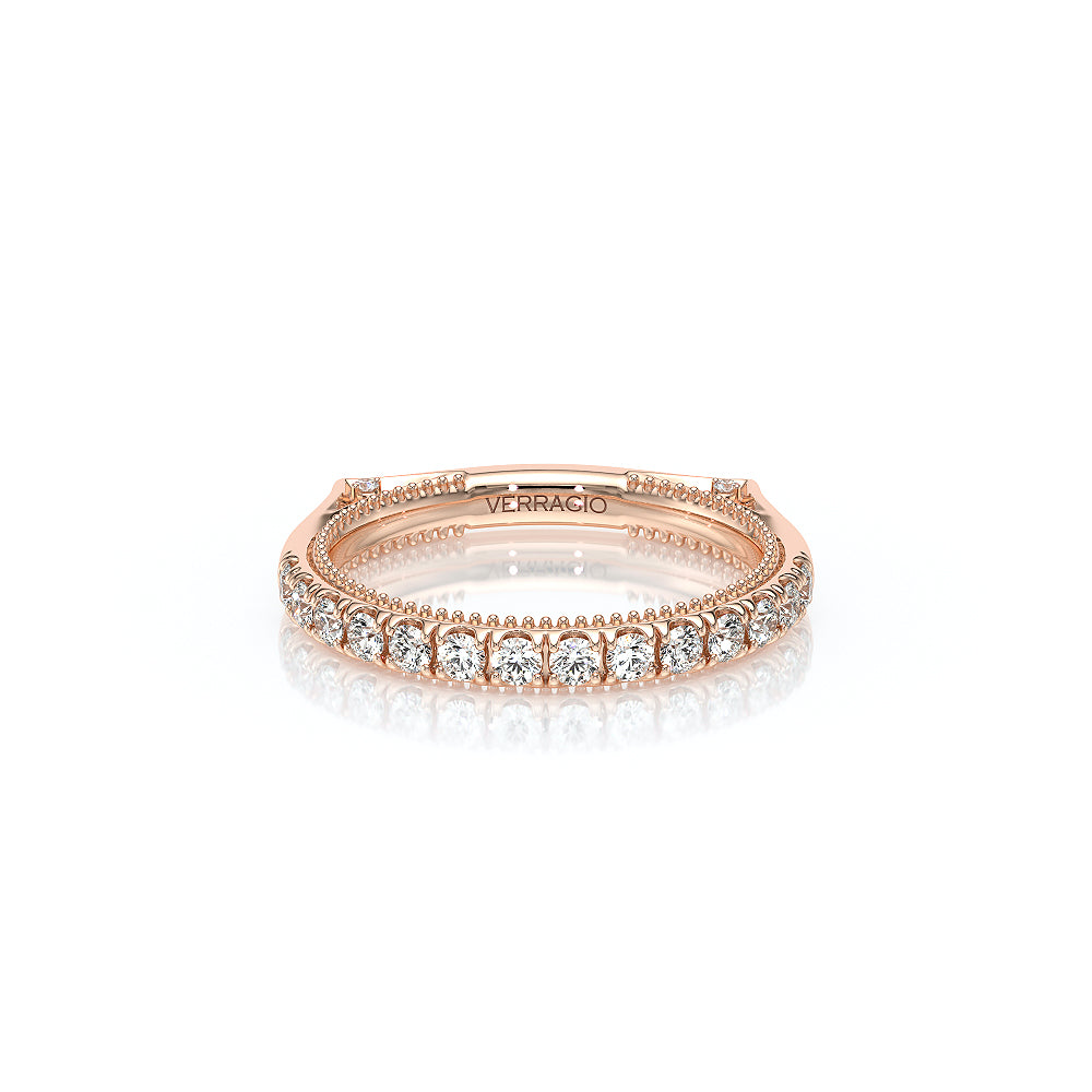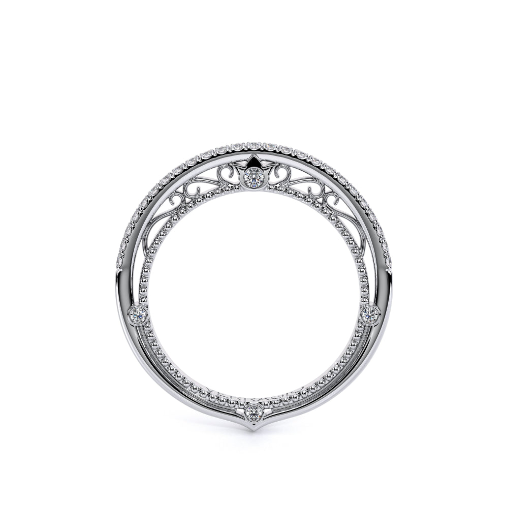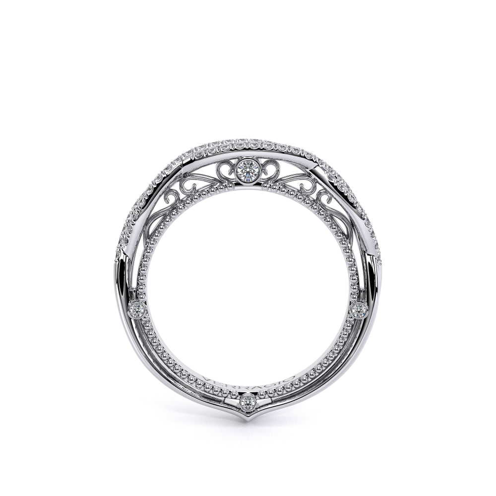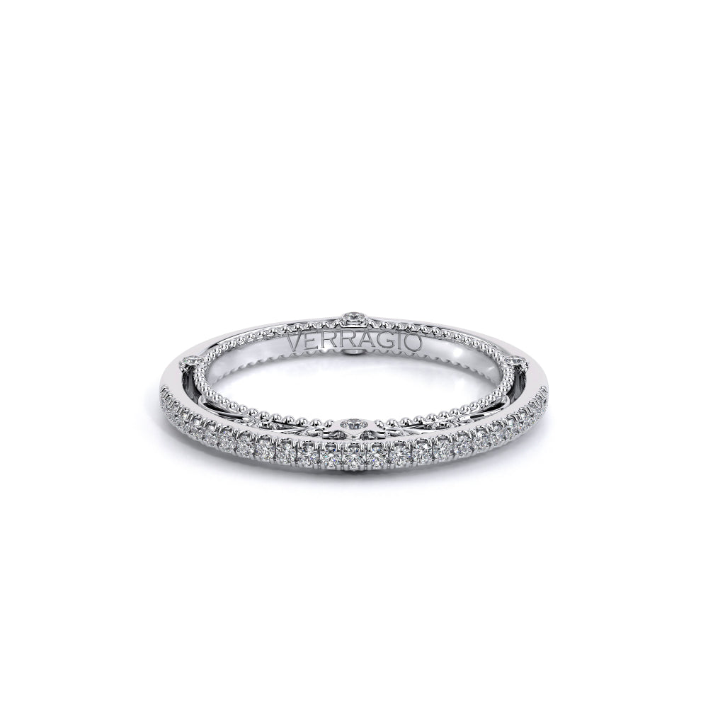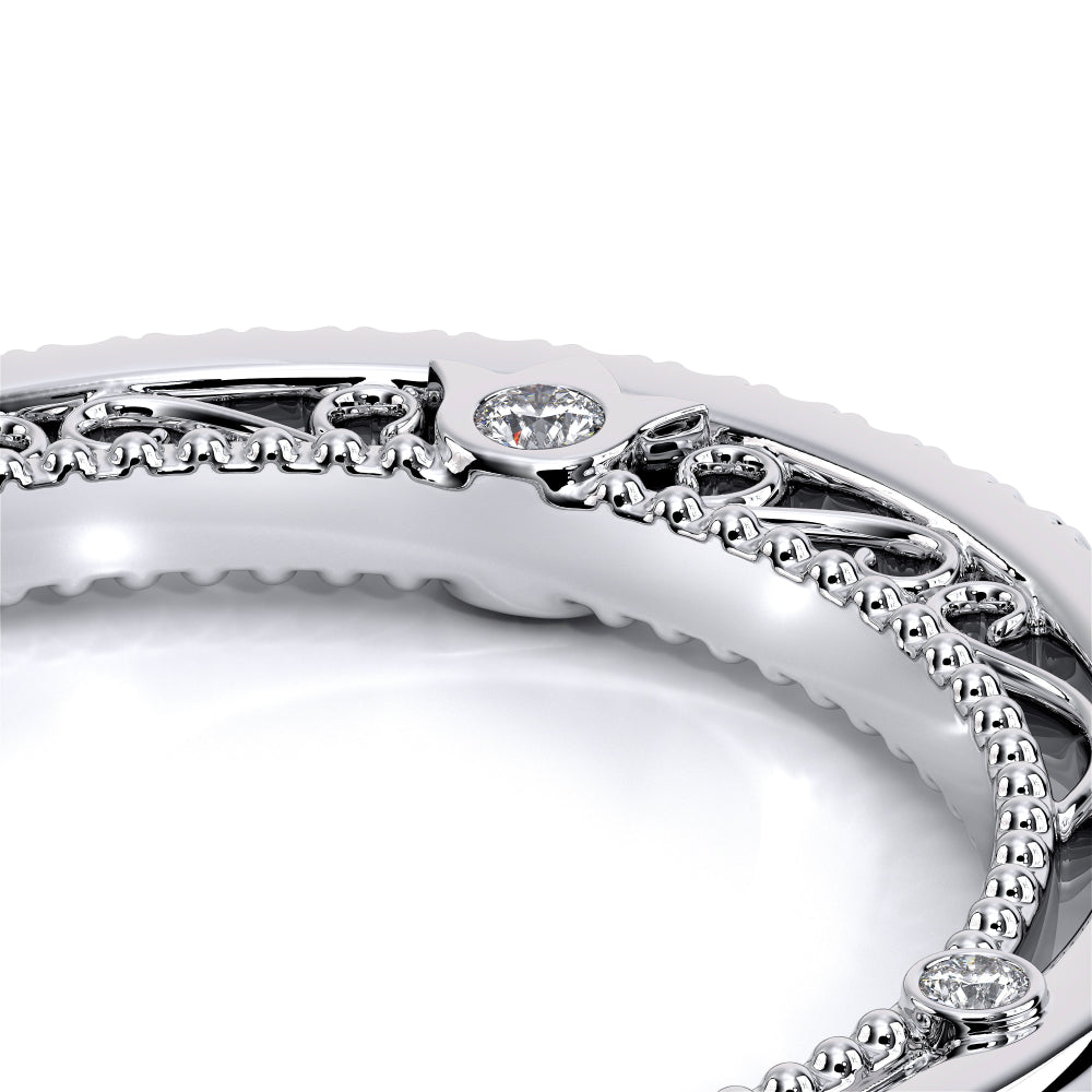 VENETIAN-5003WSB from the Venetian Collection, features an intricate straight band set with round brilliant diamonds. The inner profile showcases a beautiful handcrafted lace and our signature beading. Make it yours in two-tone or all one color to match your Verragio engagement.