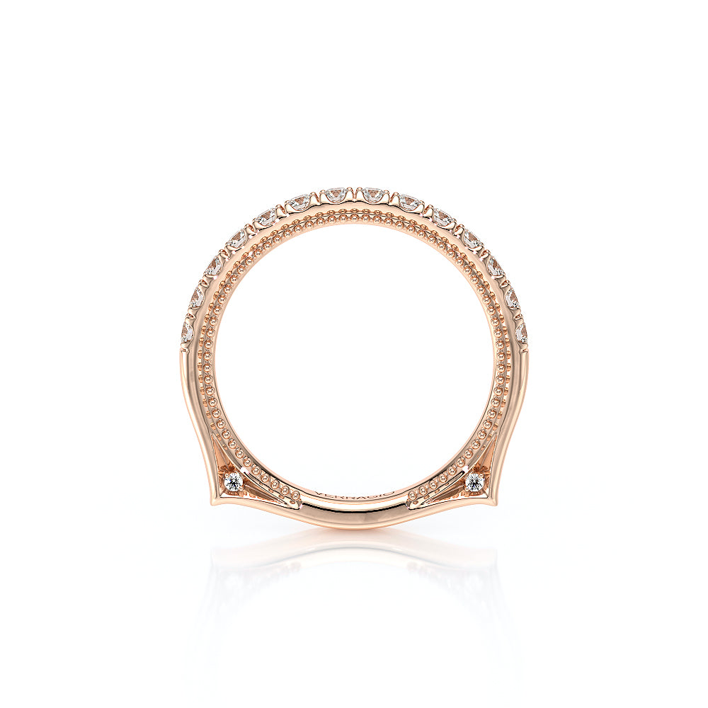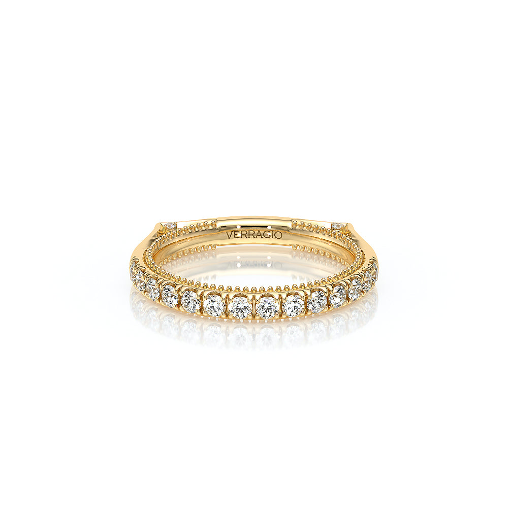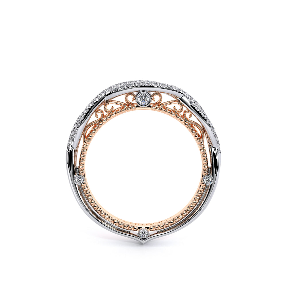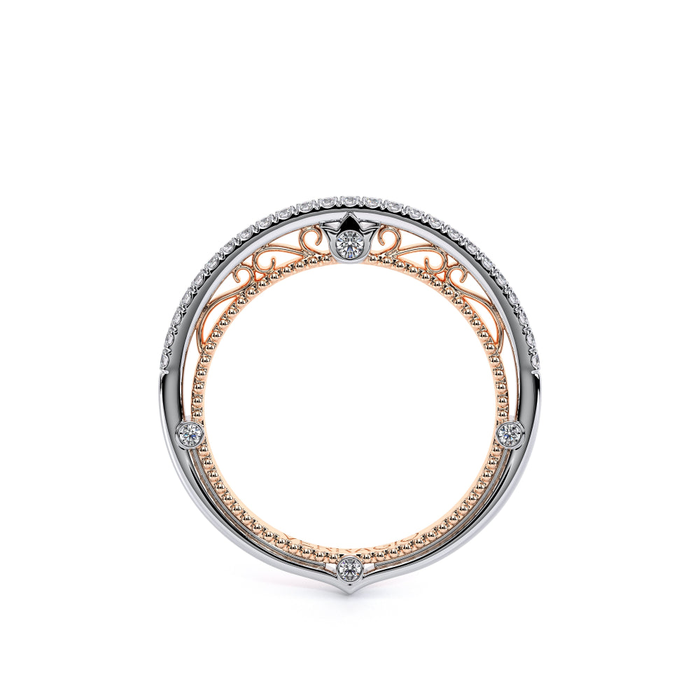 VENETIAN-5003WSB from the Venetian Collection, features an intricate straight band set with round brilliant diamonds. The inner profile showcases a beautiful handcrafted lace and our signature beading. Make it yours in two-tone or all one color to match your Verragio engagement.