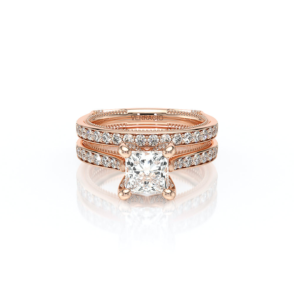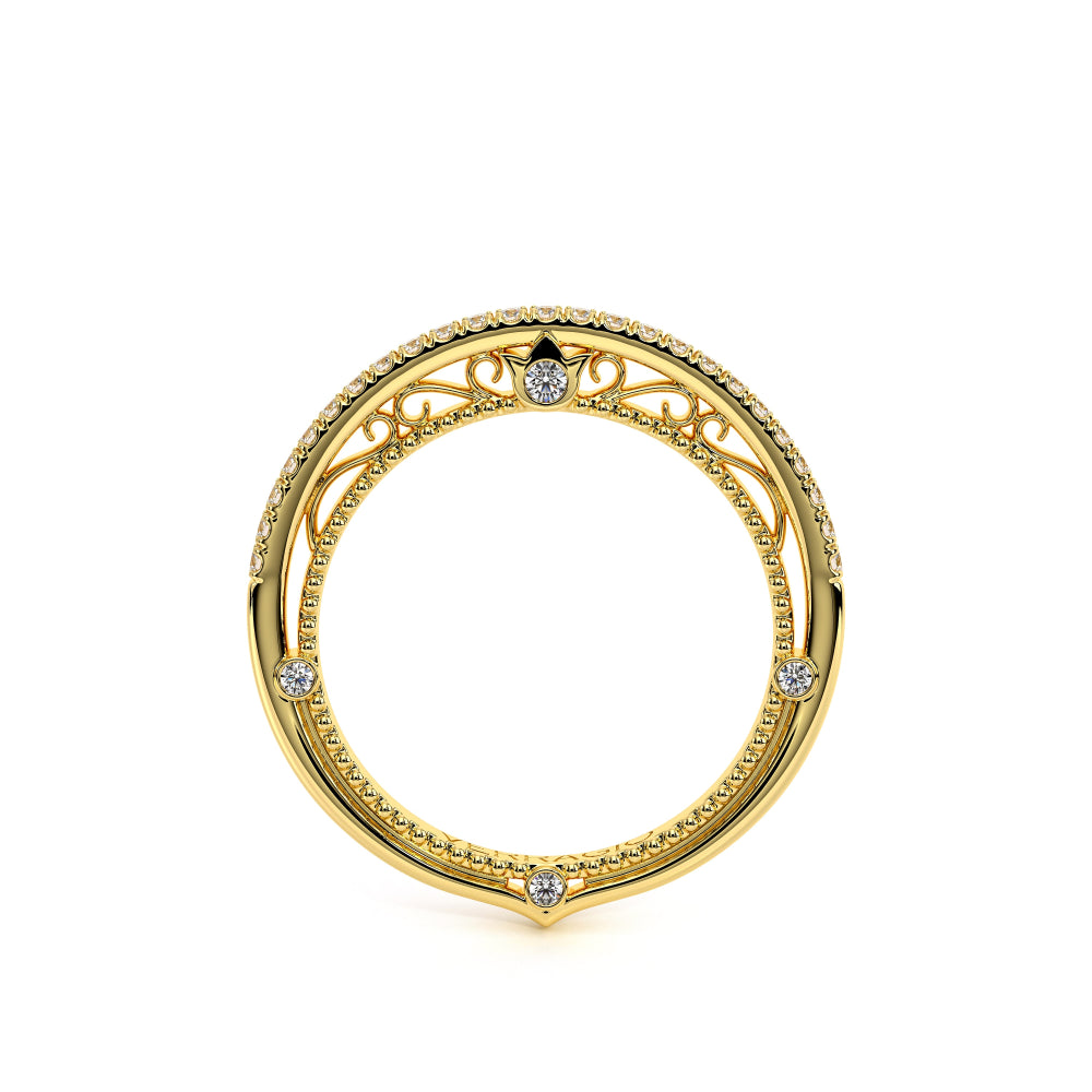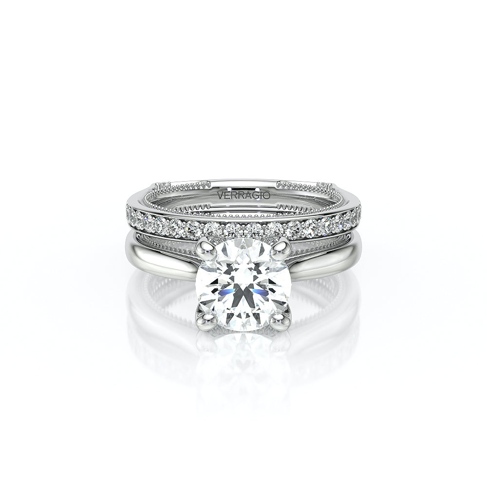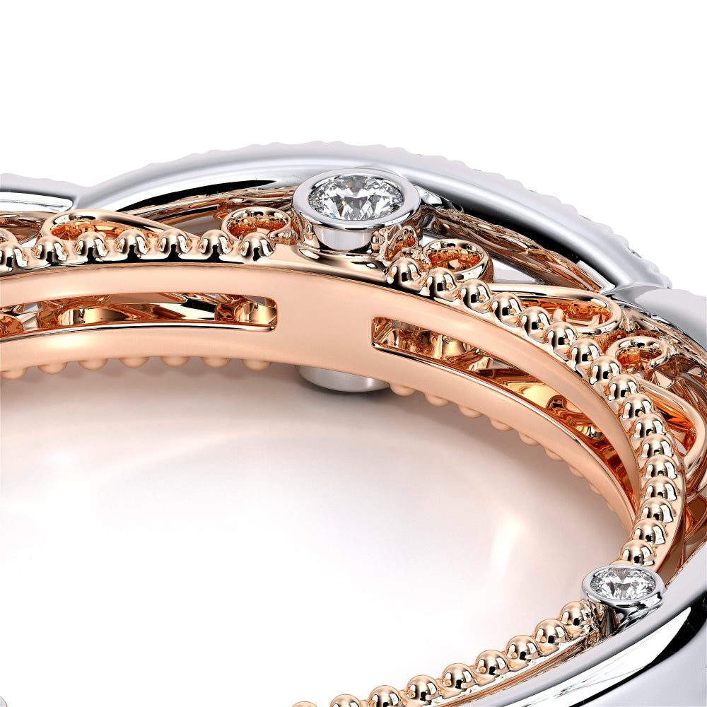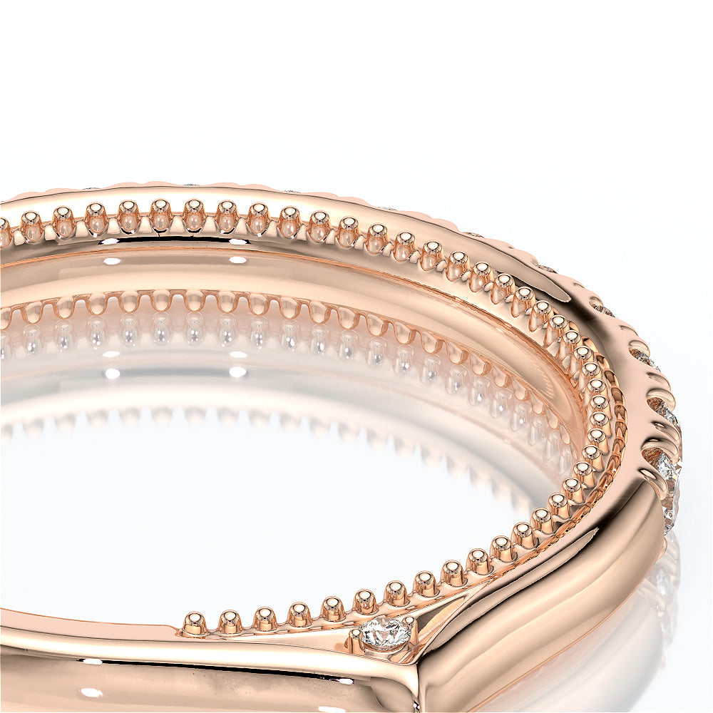 VENETIAN-5003WSB from the Venetian Collection, features an intricate straight band set with round brilliant diamonds. The inner profile showcases a beautiful handcrafted lace and our signature beading. Make it yours in two-tone or all one color to match your Verragio engagement.