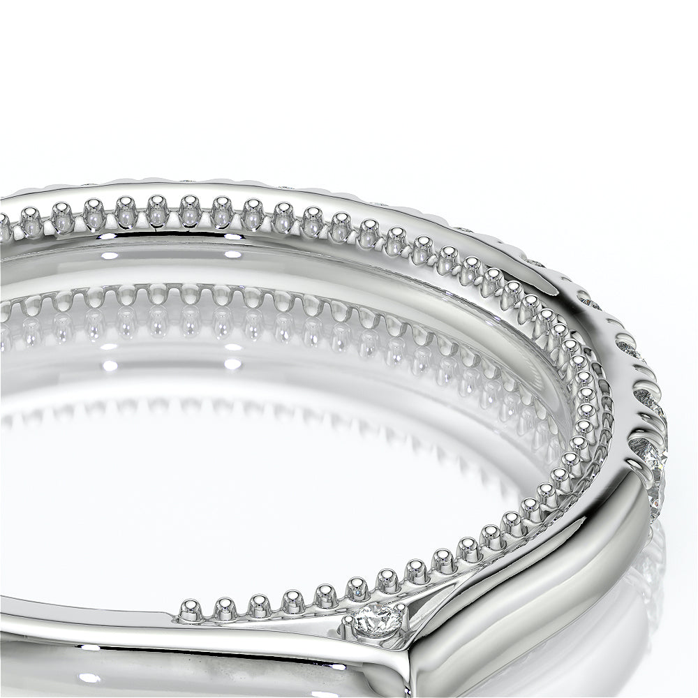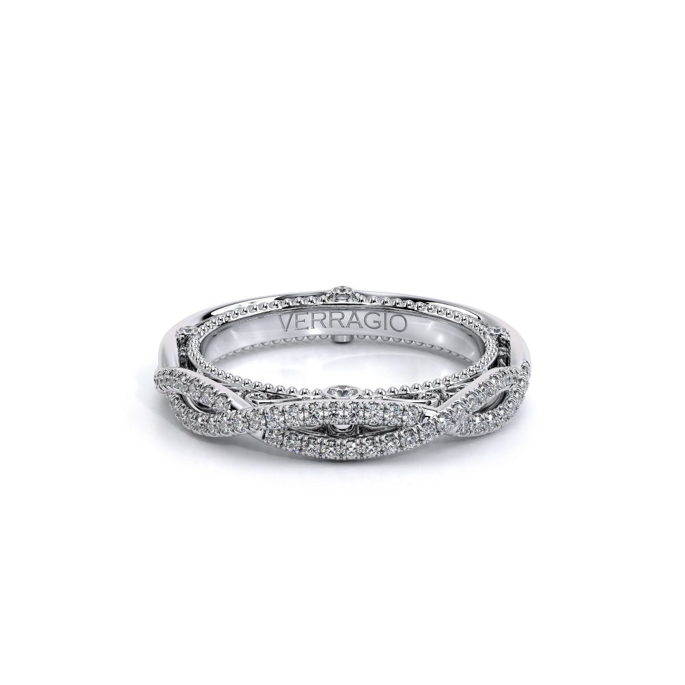 VENETIAN-5003W from the Venetian Collection, features a twisted band encrusted with round brilliant diamonds. The inside profile is beautifully laced with three bezel set round diamonds on each side infused with our signature beading. Compliment your Verragio engagement ring by choosing either a twisted or a straight band.
