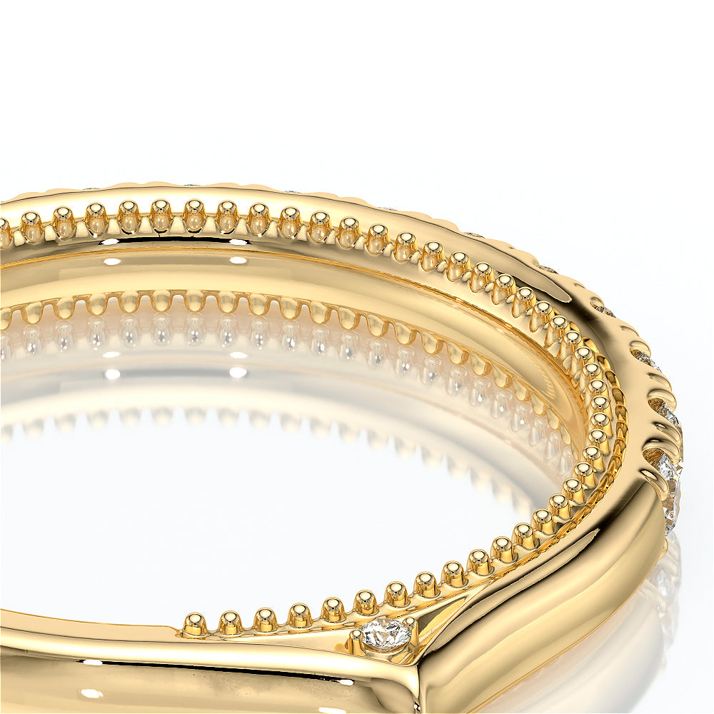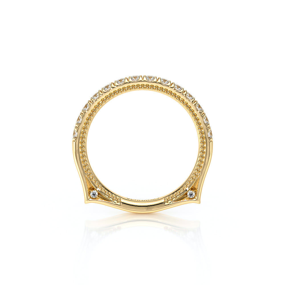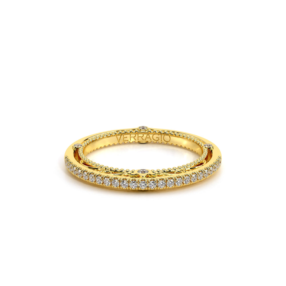 The VNG-2207W is a timeless wedding band featuring channel-set diamonds along the shank, accented by Verragio's signature beading and two elegant bezels, offering a sophisticated complement to any engagement ring or a graceful stand-alone design.