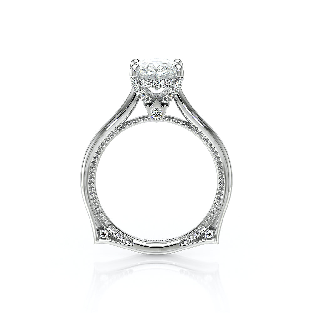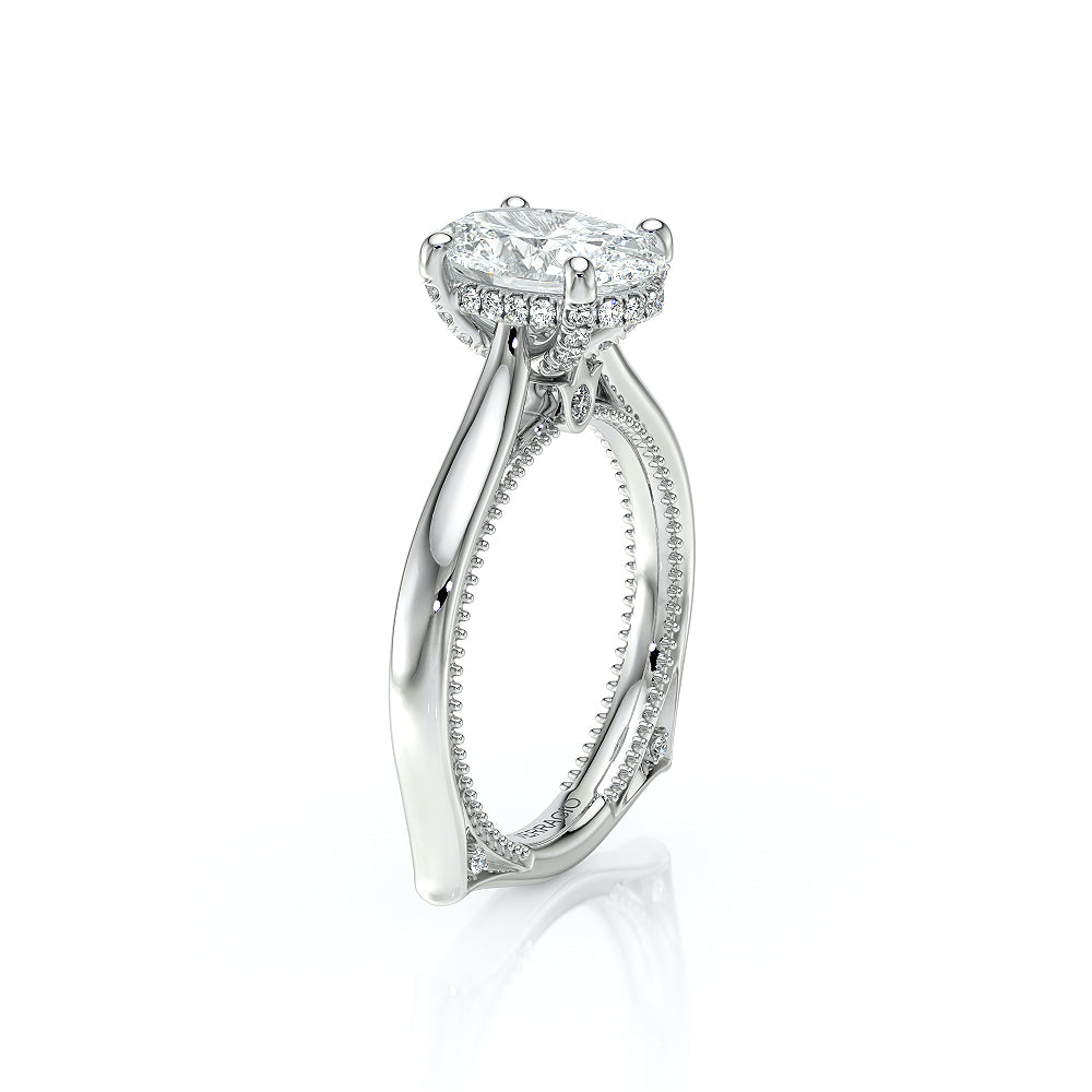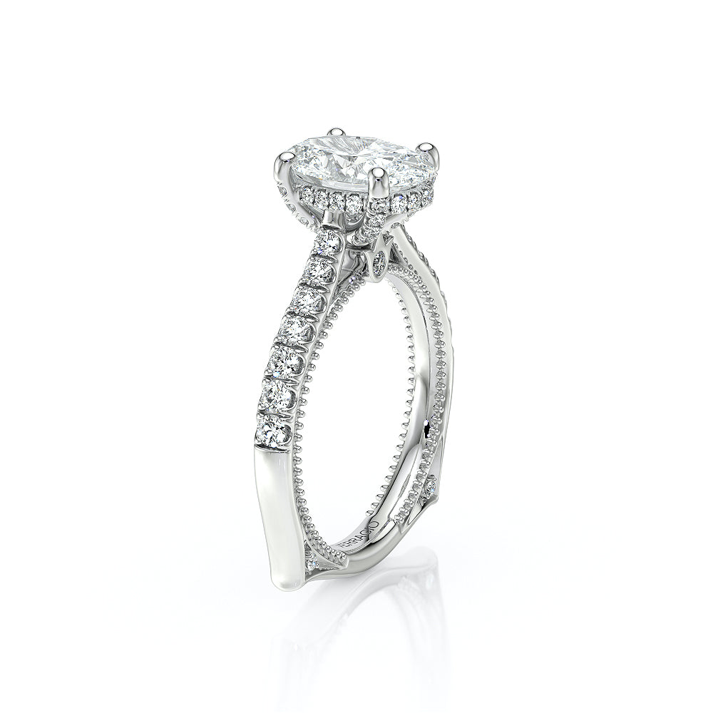 The VNG-2207OV pairs its euro-style design with an oval-shaped center stone setting, complemented by two bezels, signature Verragio beading, and two rows of diamonds on each side of the prong for an exquisite finish.