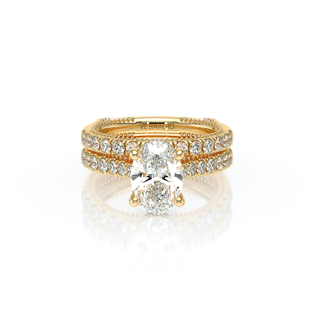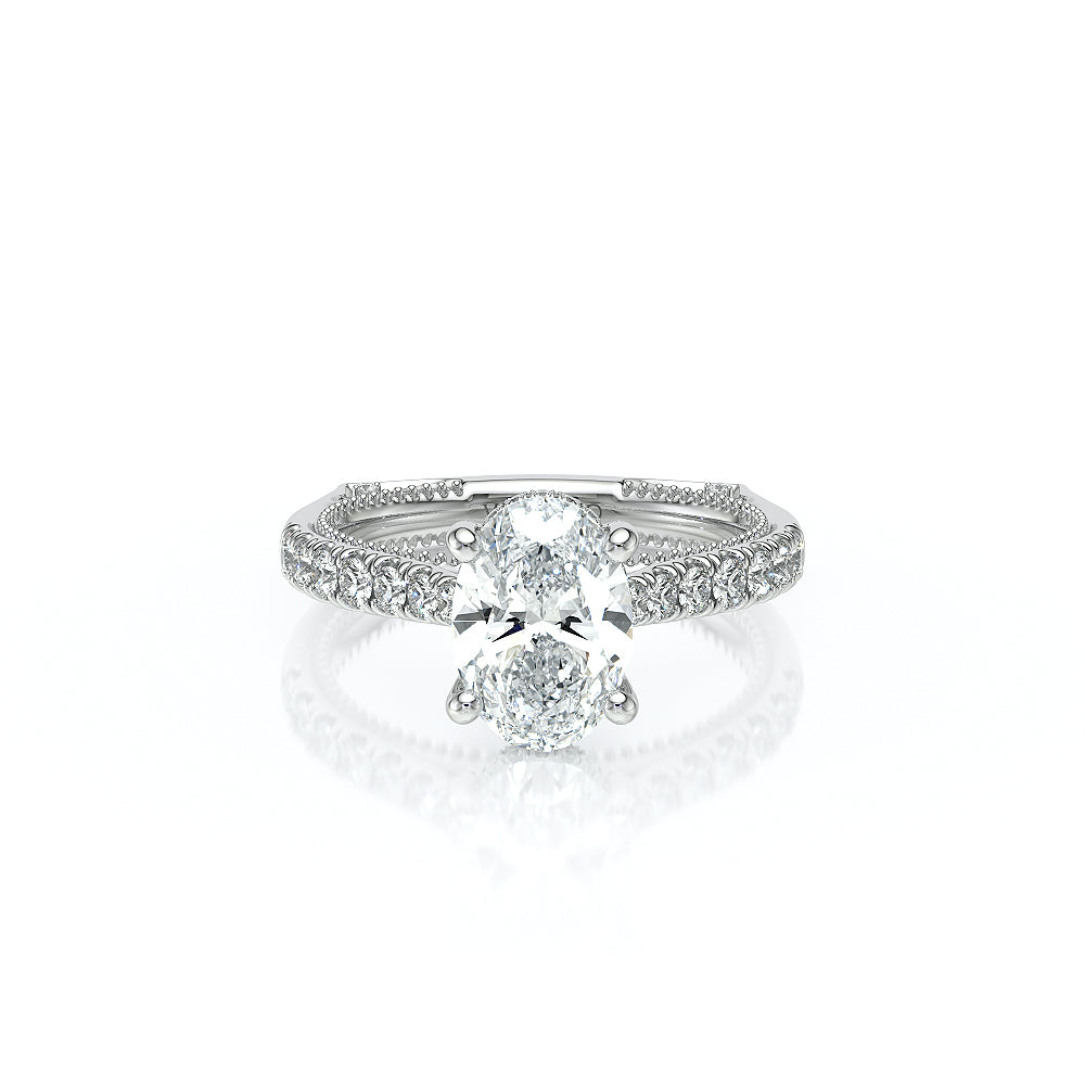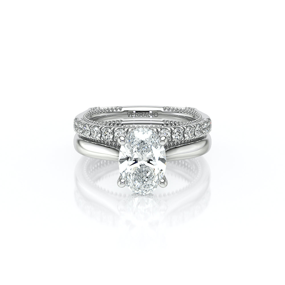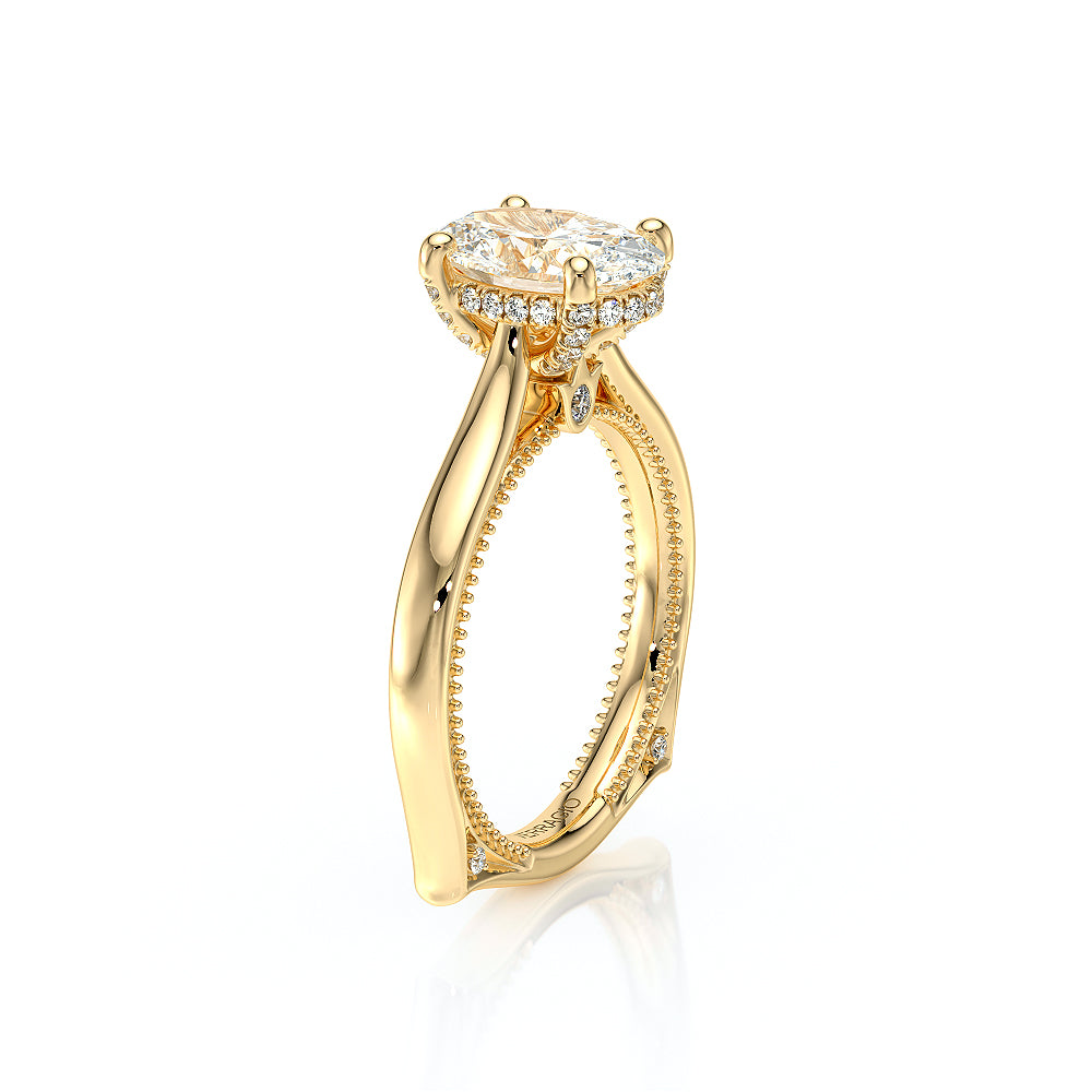 The VNG-2207OV pairs its euro-style design with an oval-shaped center stone setting, complemented by two bezels, signature Verragio beading, and two rows of diamonds on each side of the prong for an exquisite finish.