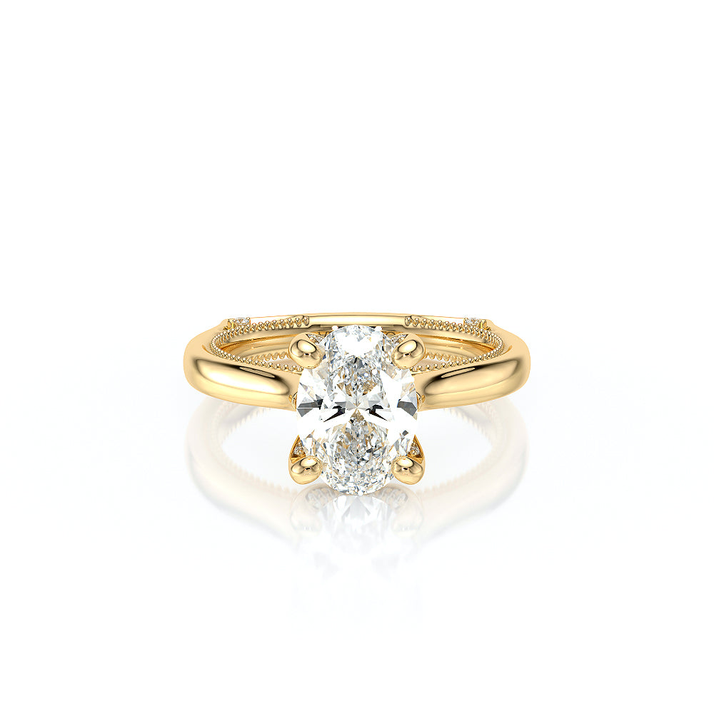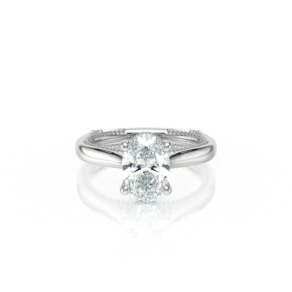 The VNG-2208OV-S is a solitaire setting tailored for an oval center stone, featuring diamond accents on the prongs and bridge for a sophisticated design.