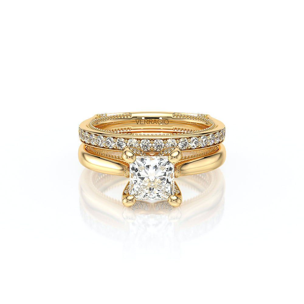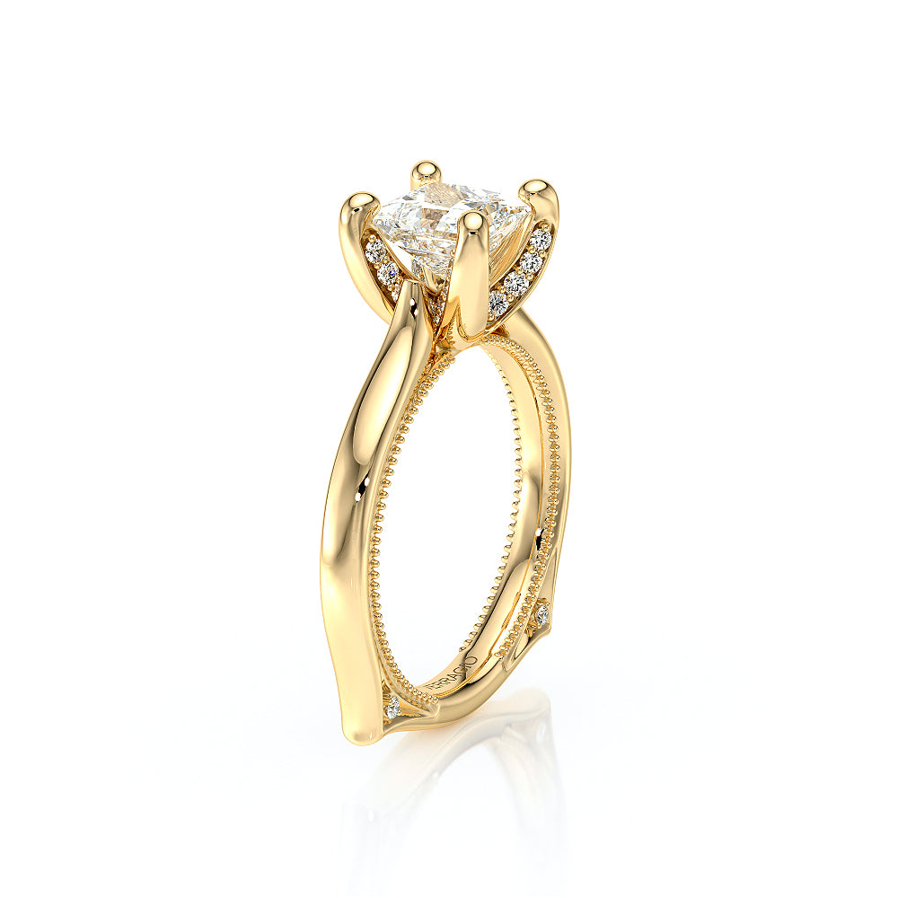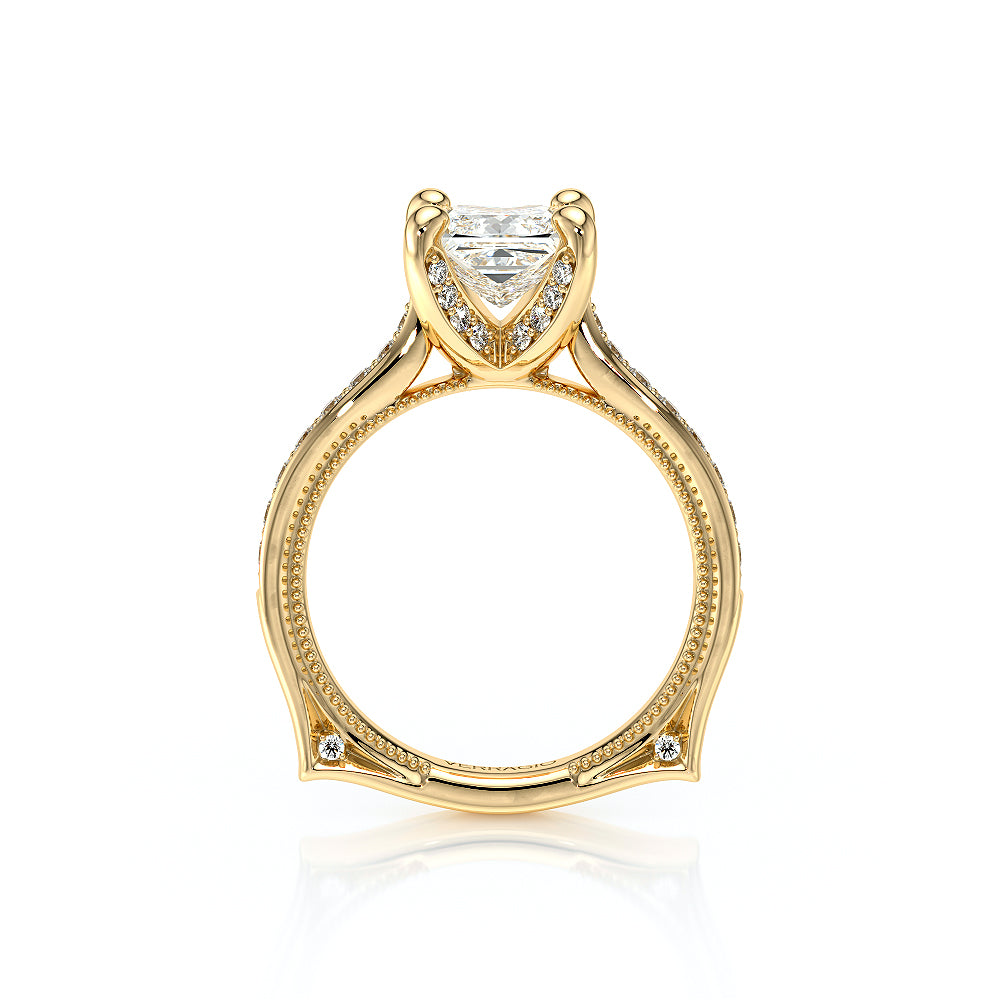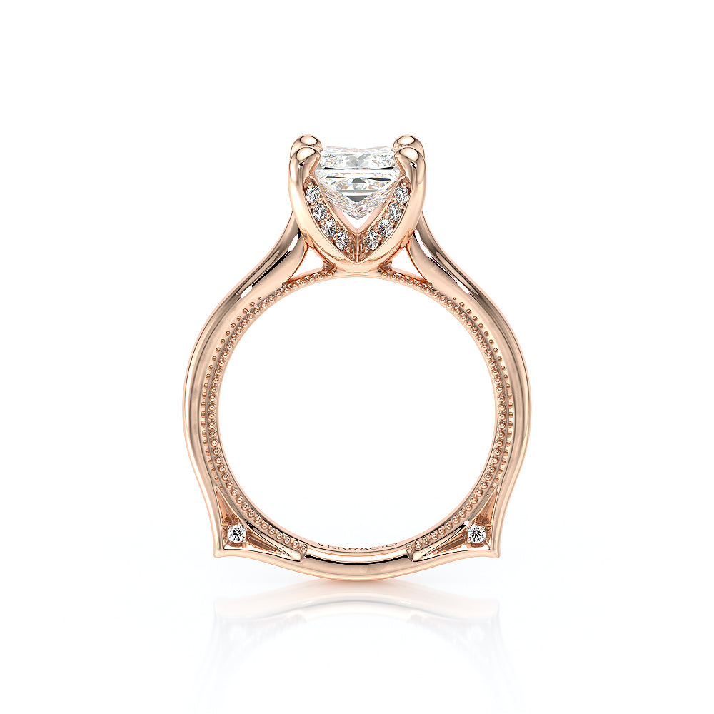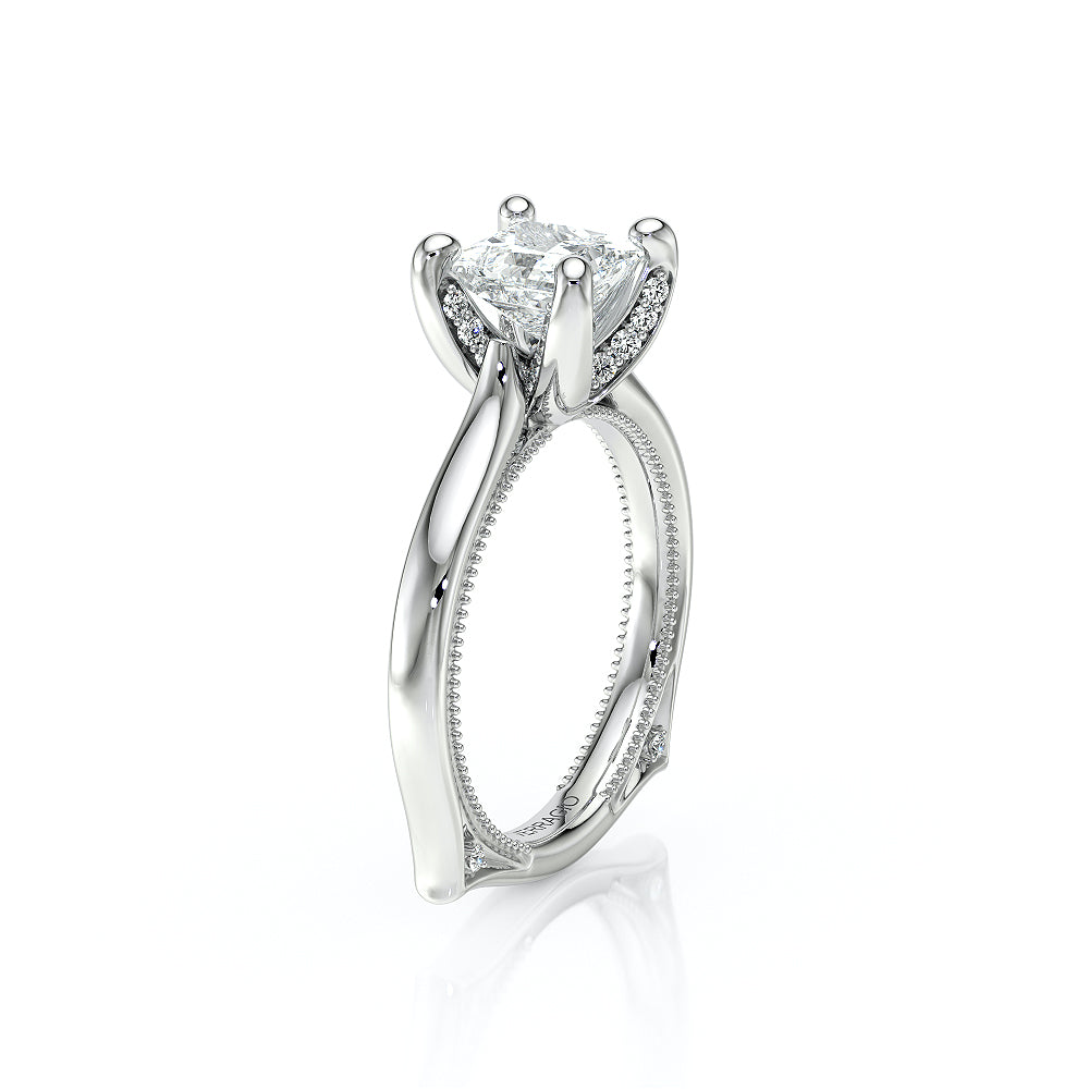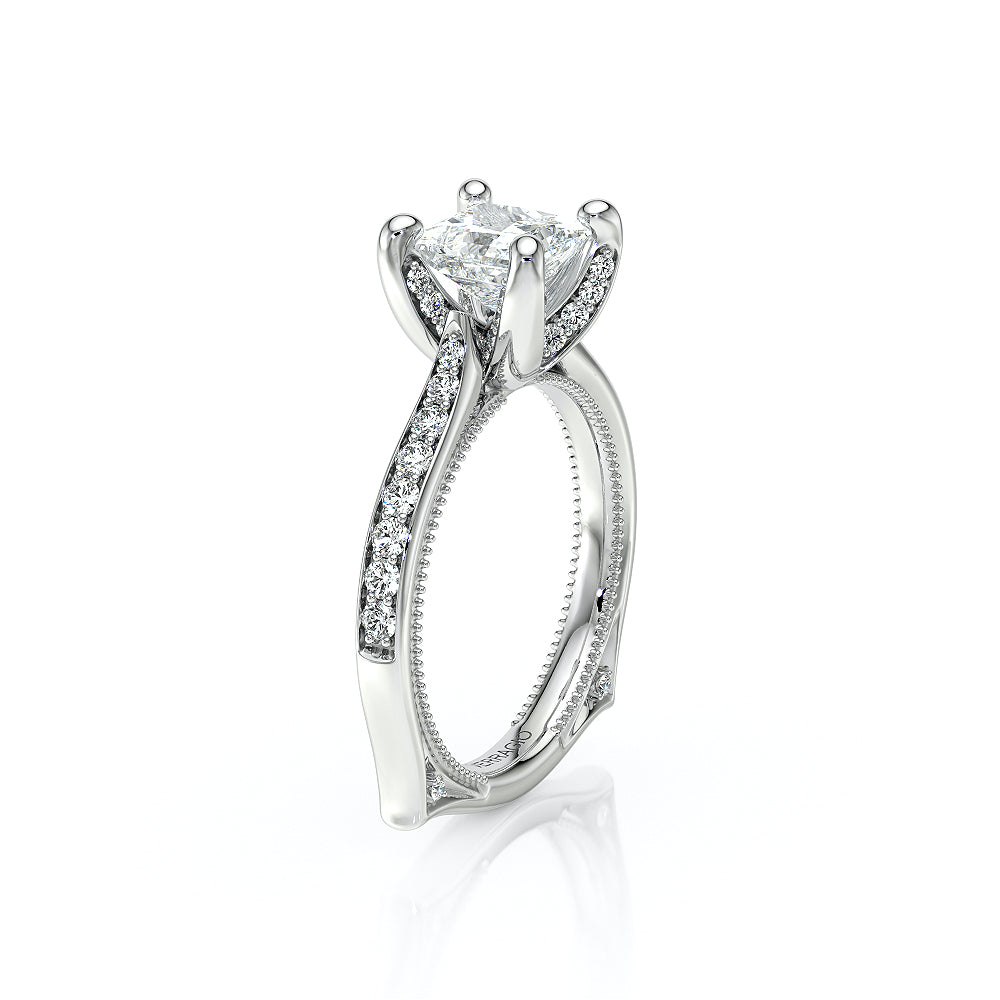 The VNG-2208PS-S is designed for a princess-cut center stone, featuring a solitaire design with diamond-accented prongs and bridge for a clean and timeless look.