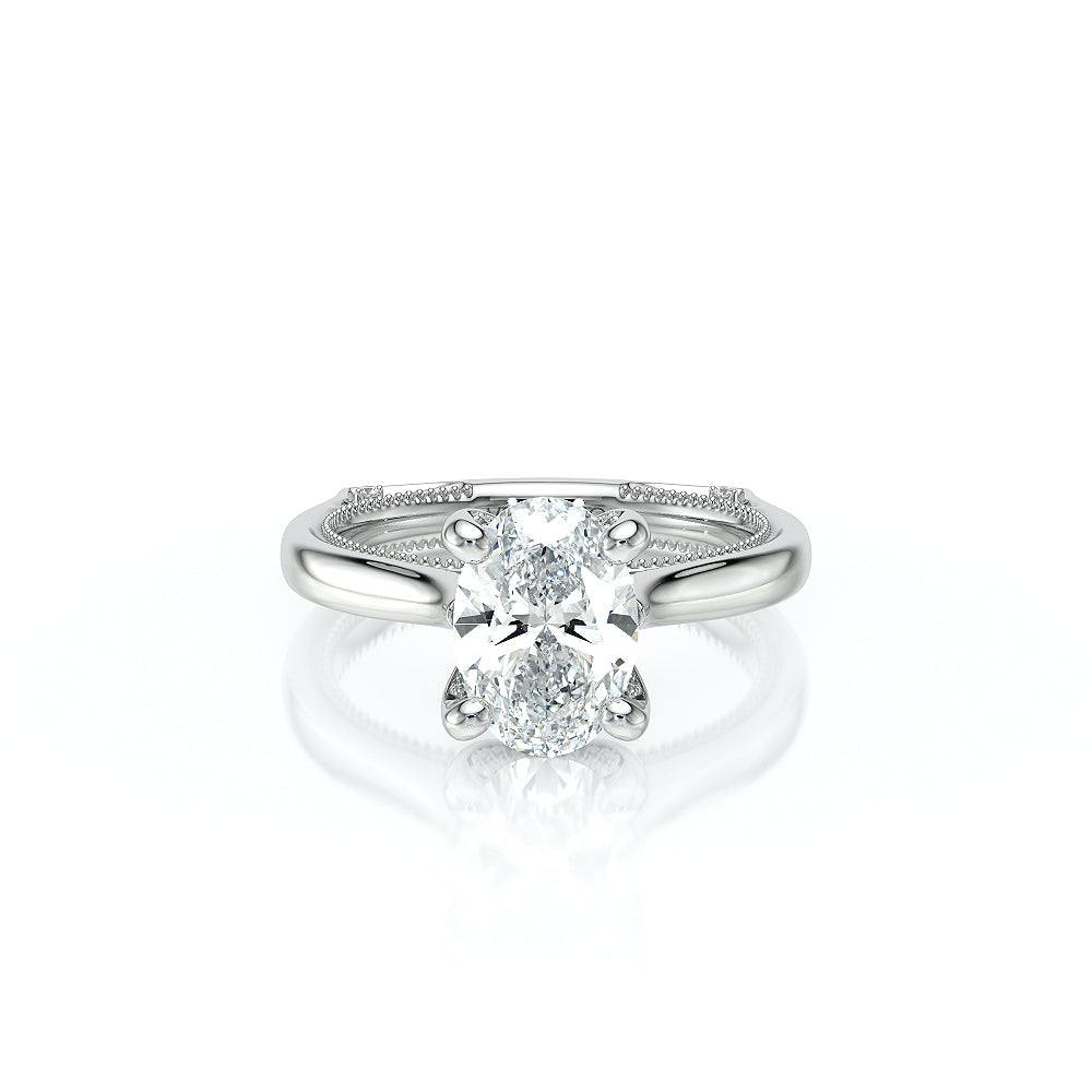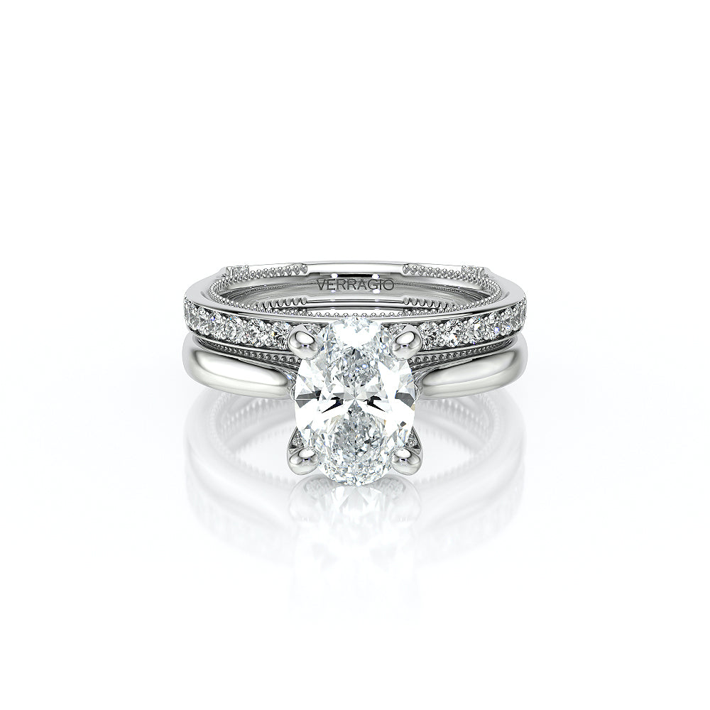 The VNG-2207OV-S, an elevated solitaire with an oval center stone, combines two bezels, Verragio’s signature beading, and two rows of diamonds along the prong to create a timeless and sophisticated look.
