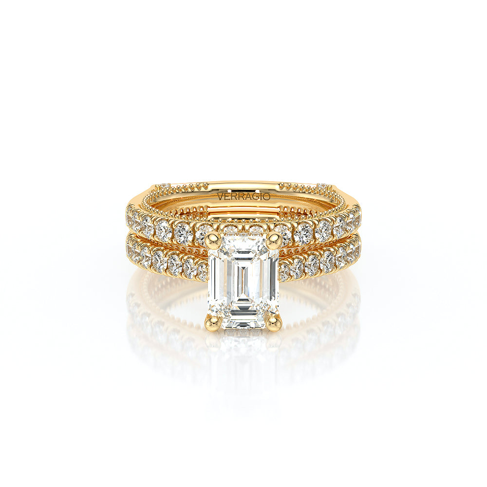 The VNG-2207P-S, an elevated solitaire, showcases the classic euro-style design with two bezels, Verragio’s signature beading, and two rows of diamonds accentuating each side of the prong, offering a refined and elegant aesthetic.