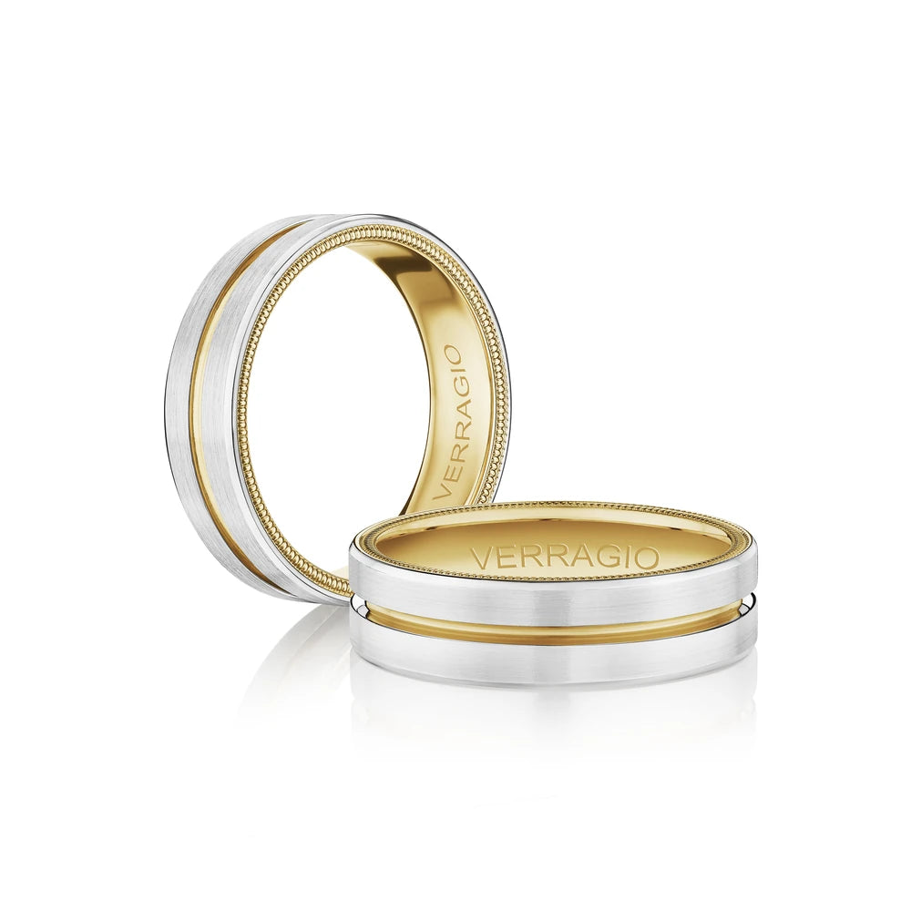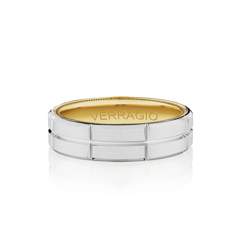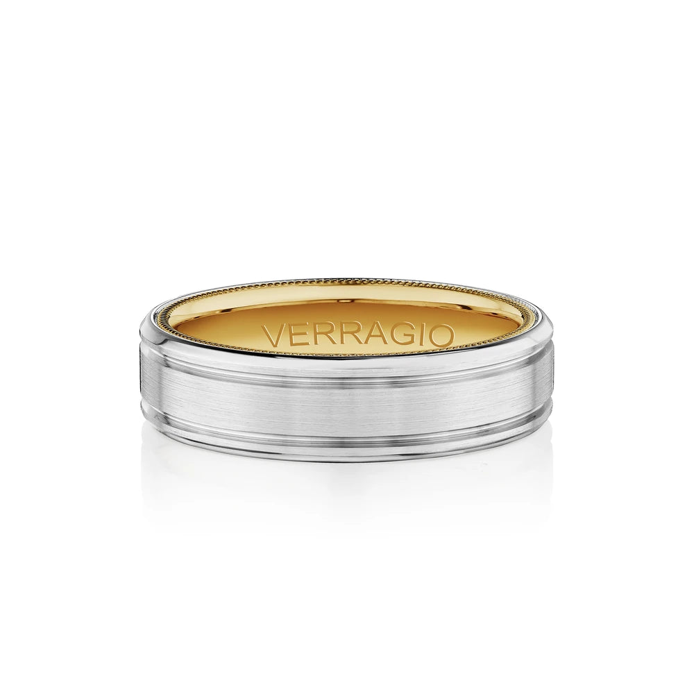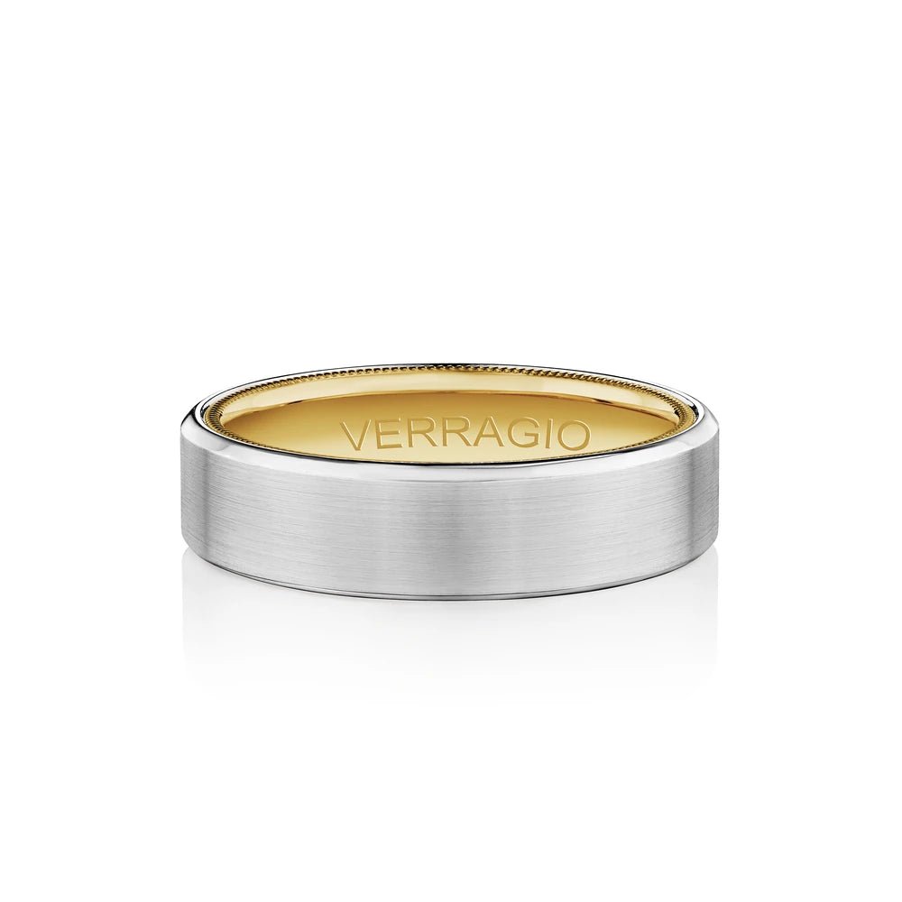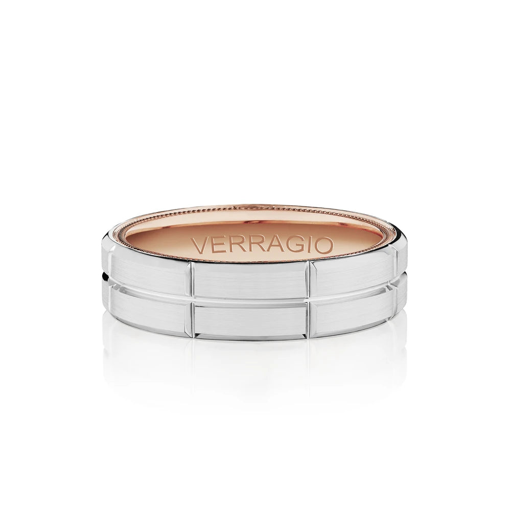 VW-6121 is our stylish 6MM width men's band with a matte finish. Etched through the heart of the ring runs a singular rose gold groove enhanced by the interior detailing of Verragio's signature rose gold beading.