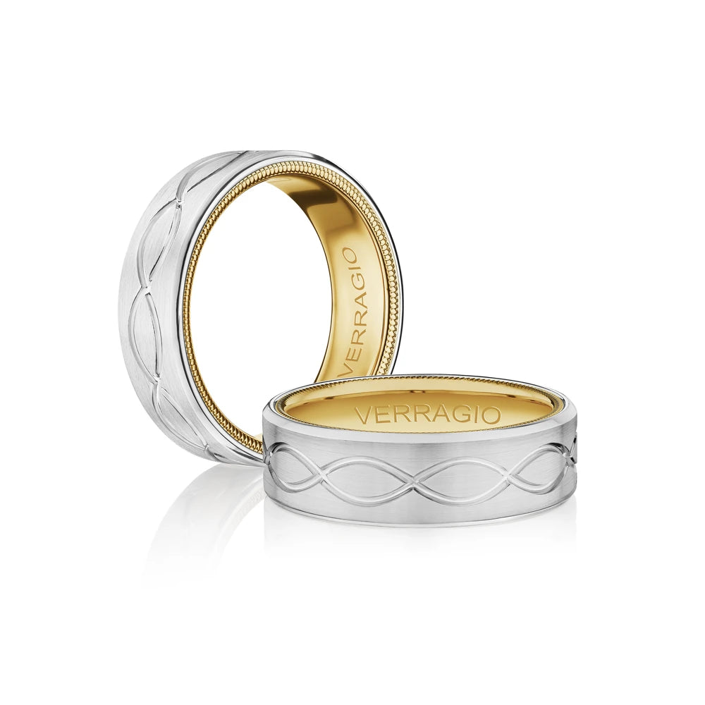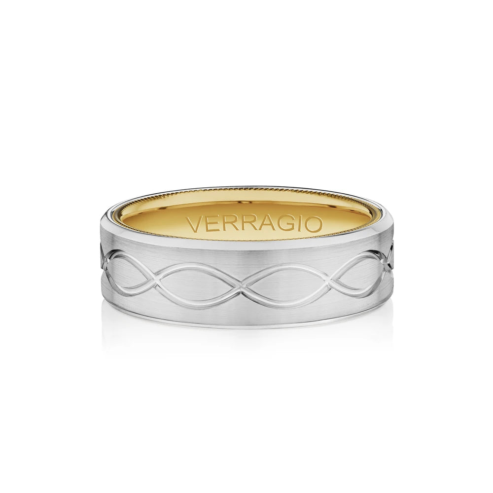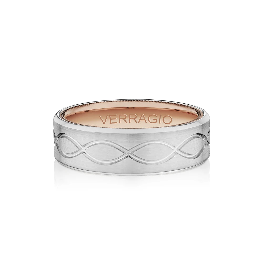 VW-7013 is a classy matte finished 7MM men's band, adorned with Verragio's timeless signature beading in rose. Featured with an exquisite infinity design on the band to symbolize your eternal love.