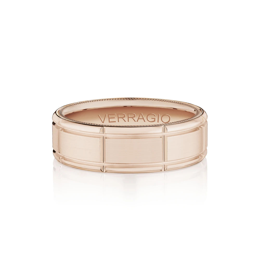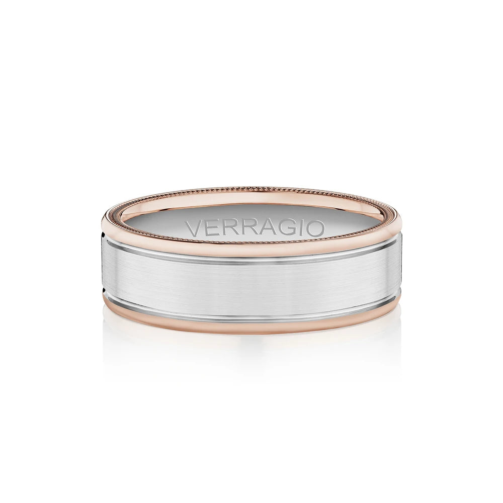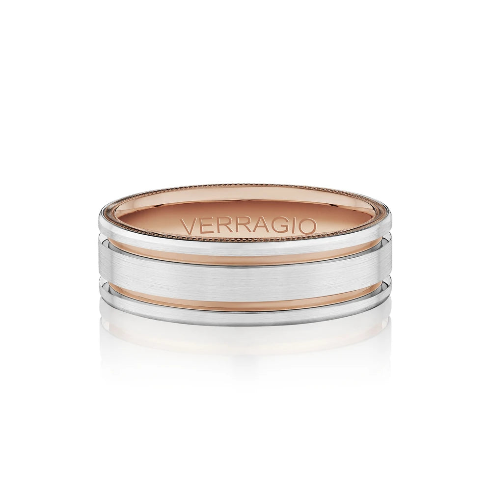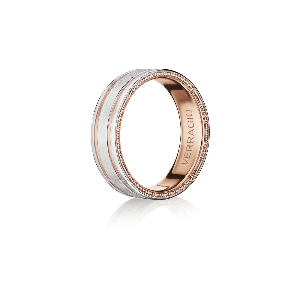 VW-7010-RWR is a stylish 7MM width matte finish men's band. Accentuated with high polished rose gold edges, enriched by Verragio's timeless signature beading.
