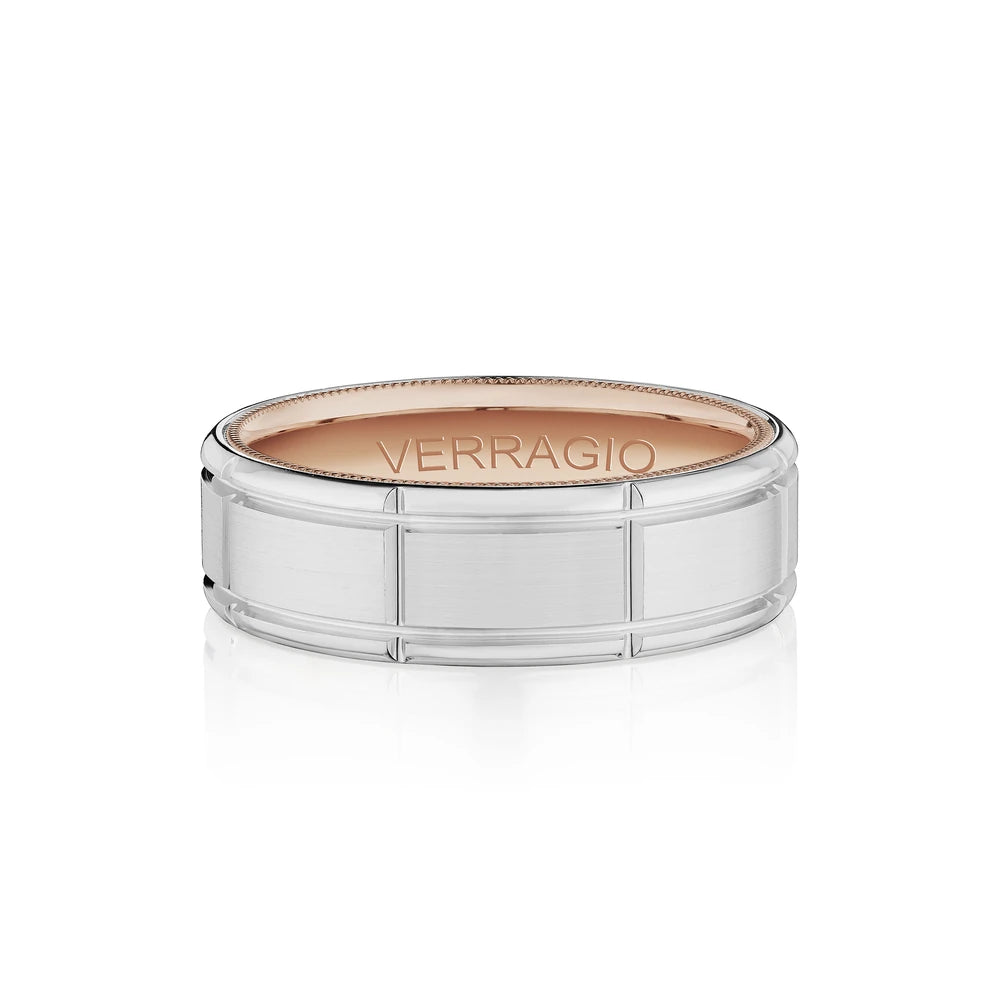 VW-7114 is our stylish 7MM width men's band with a matte finish elevated by the interior detailing of Verragio's signature rose gold beading along the edges. Along the heart of the ring run two grooves highlighting the rose gold in the band.