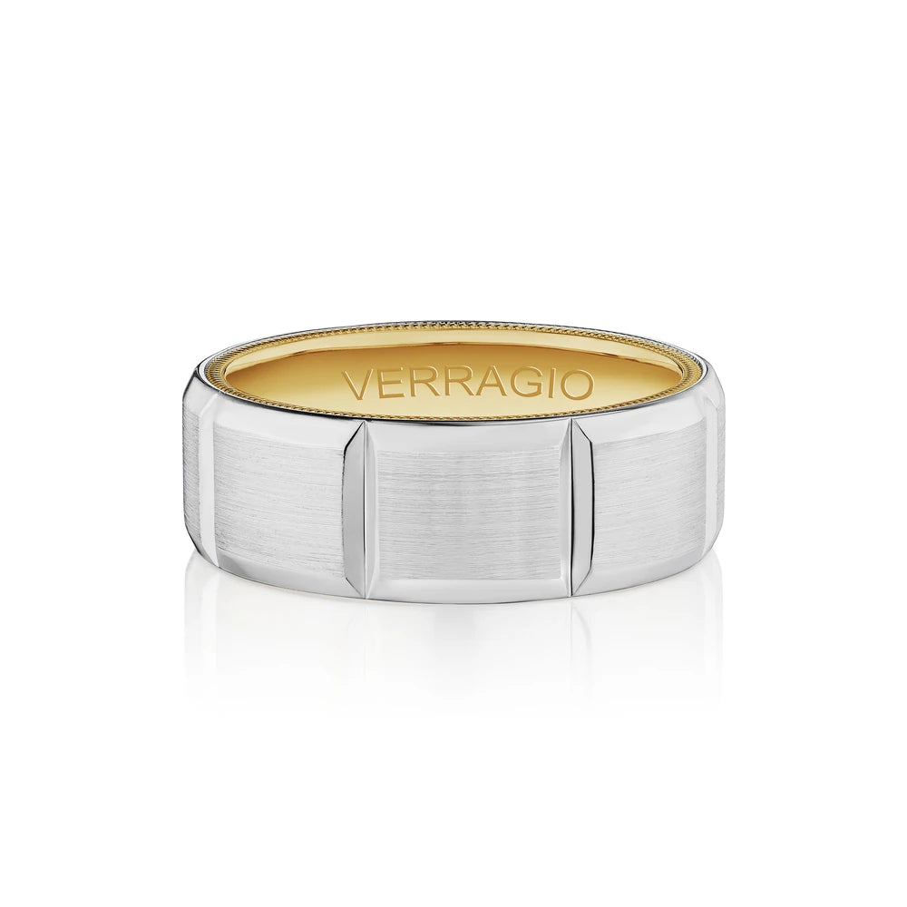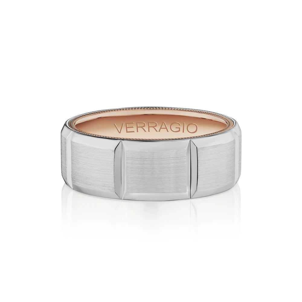 VW-8106 is our classic 8MM width men's band with a matte finish, accentuated with high polished edges. The modern geometric design carried throughout the ring is complimented by Verragio signature rose gold beading.