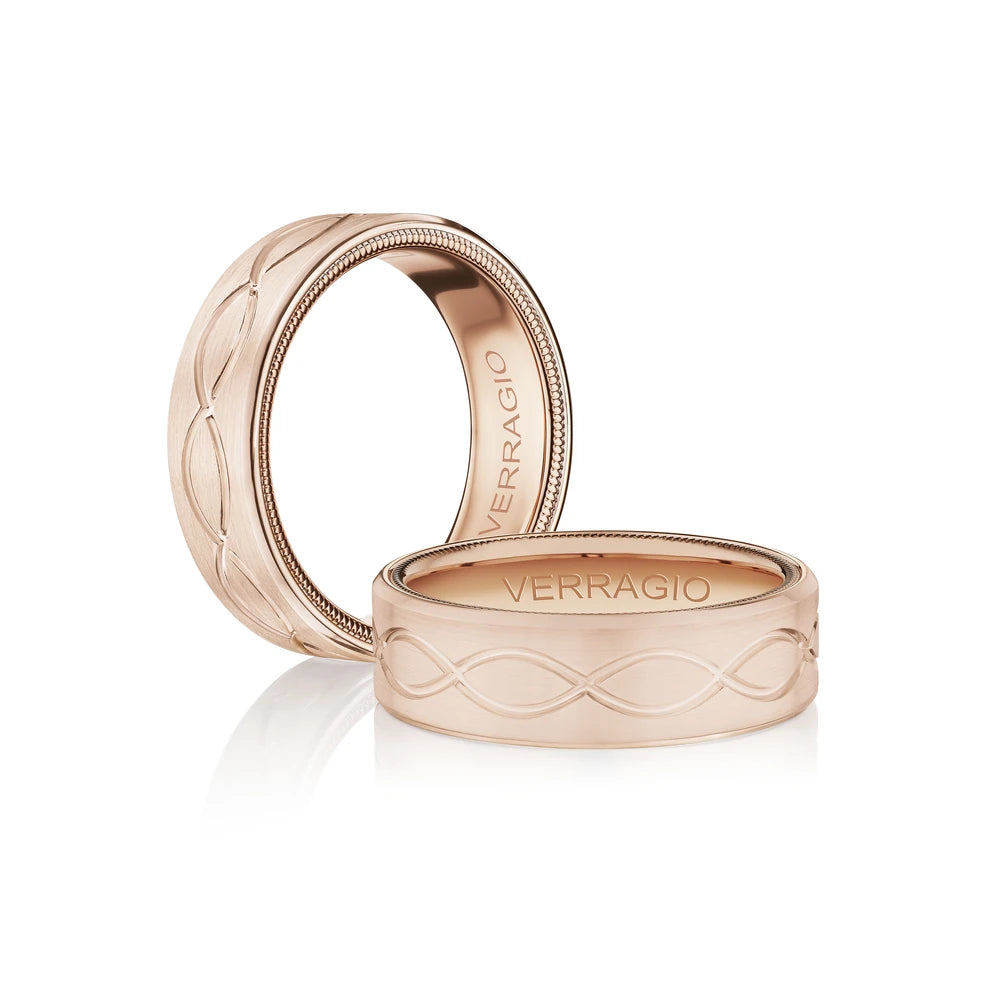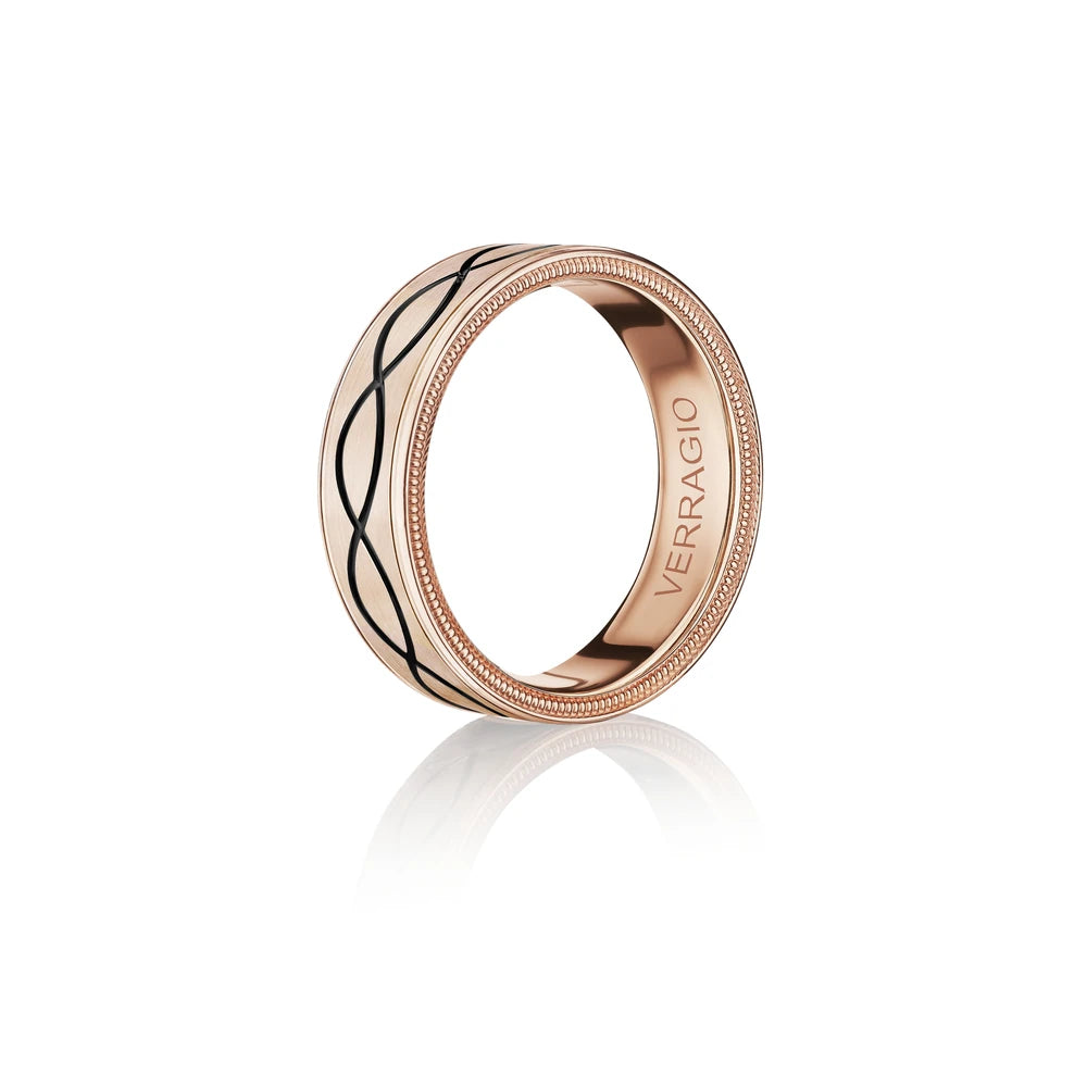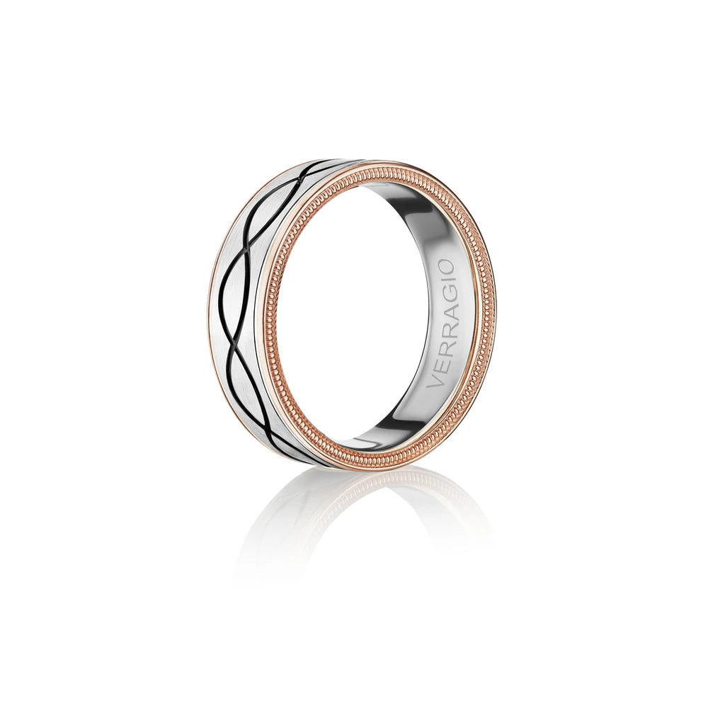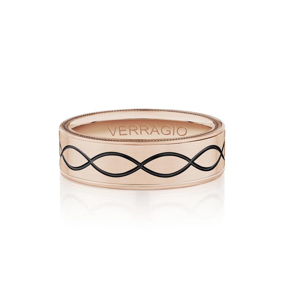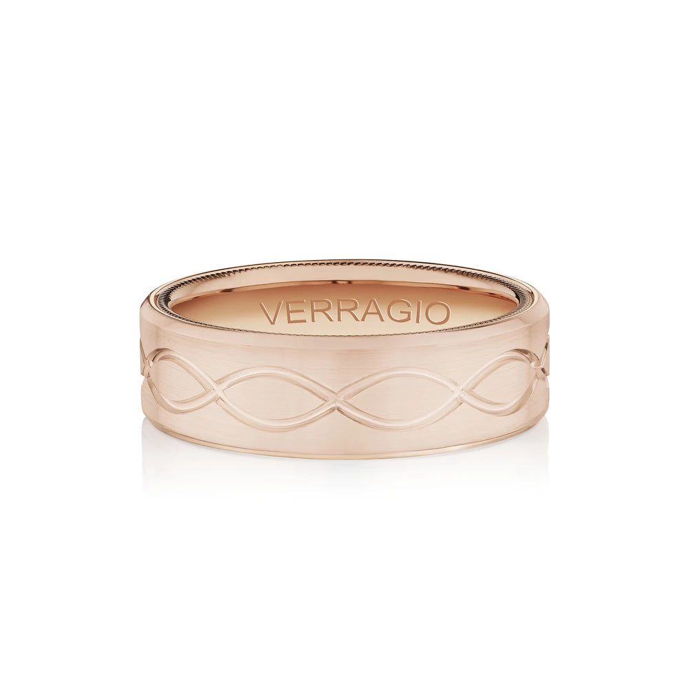 VW-7013 is a classy matte finished 7MM men's band, adorned with Verragio's timeless signature beading in rose. Featured with an exquisite infinity design on the band to symbolize your eternal love.