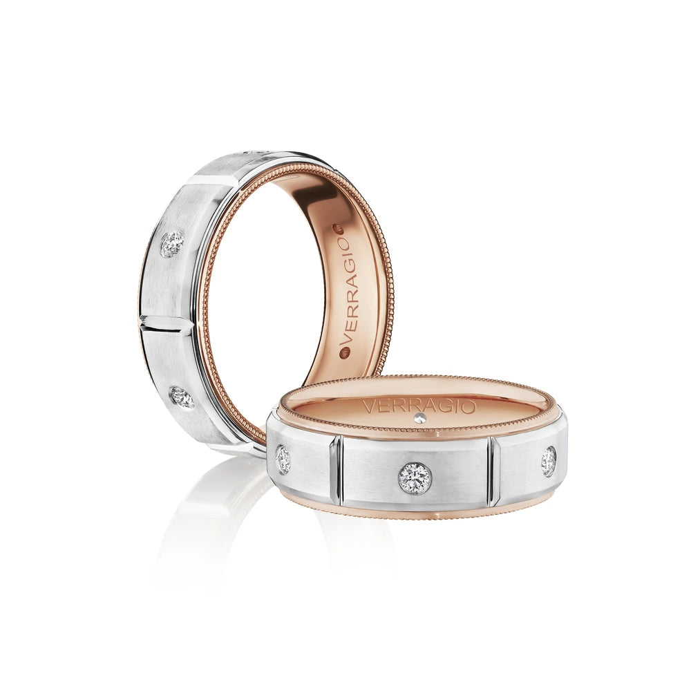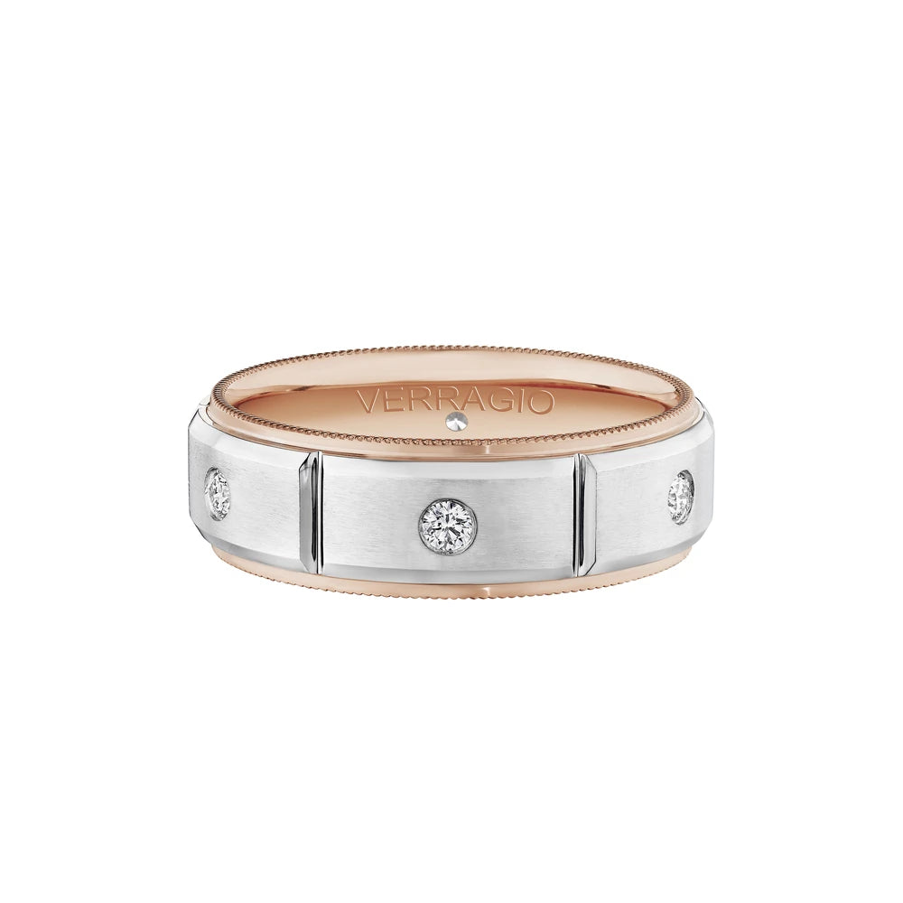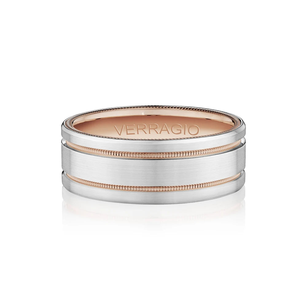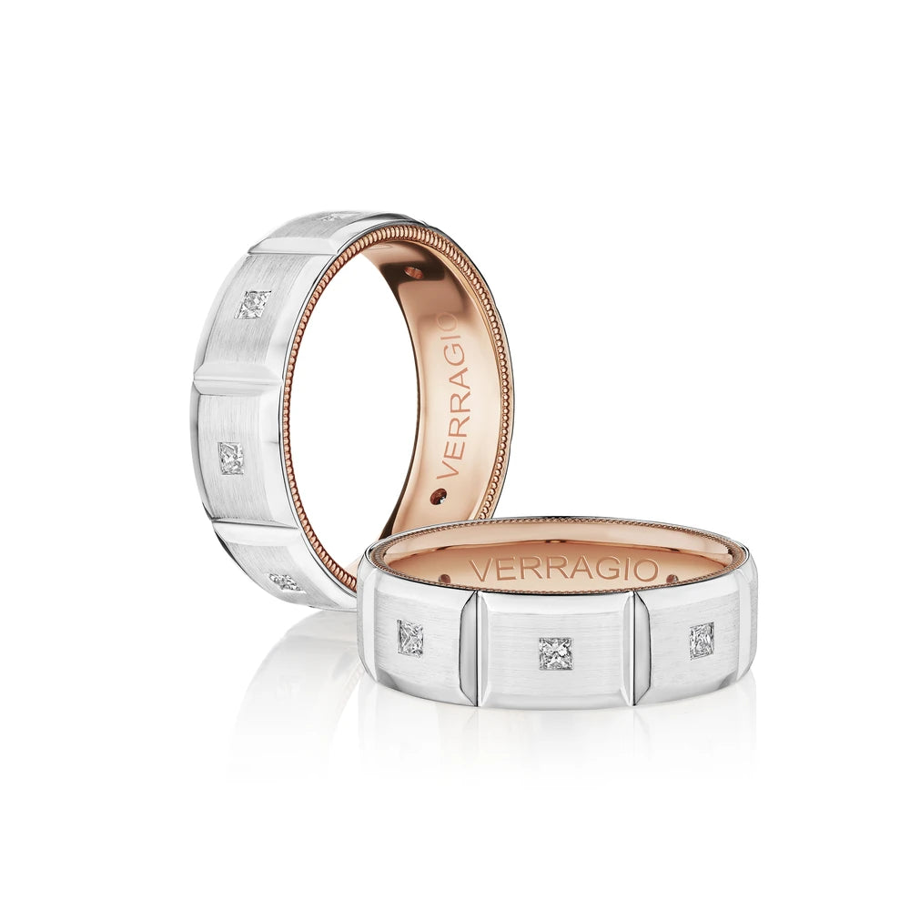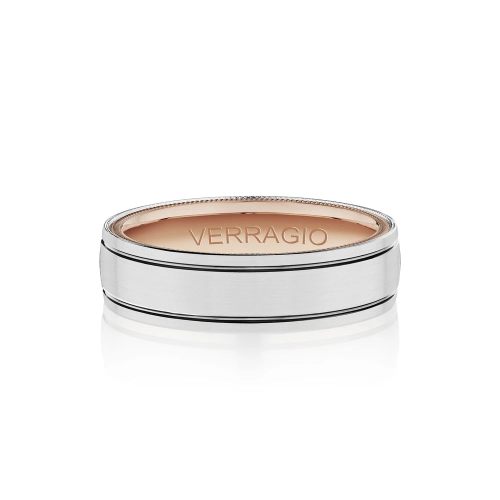 VW-8106 is our classic 8MM width men's band with a matte finish, accentuated with high polished edges. The modern geometric design carried throughout the ring is complimented by Verragio signature rose gold beading.
