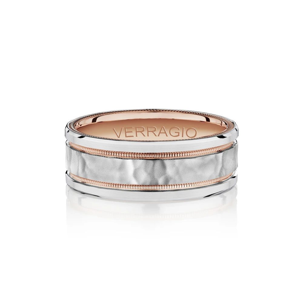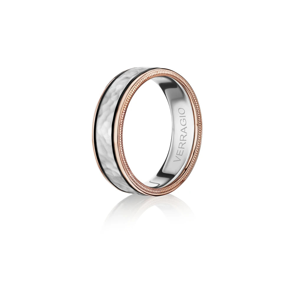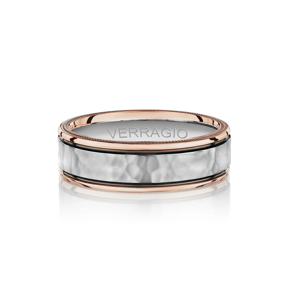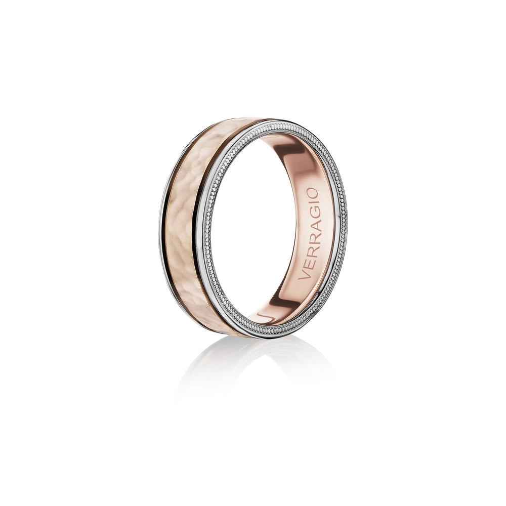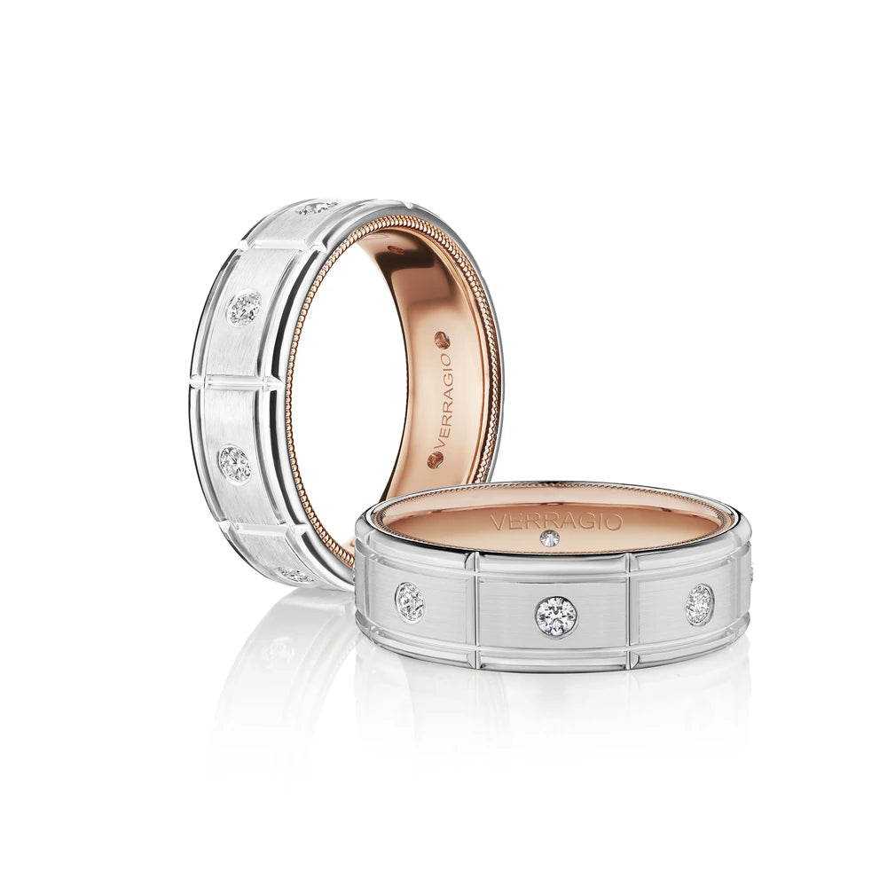 VW-8106 is our classic 8MM width men's band with a matte finish, accentuated with high polished edges. The modern geometric design carried throughout the ring is complimented by Verragio signature rose gold beading.