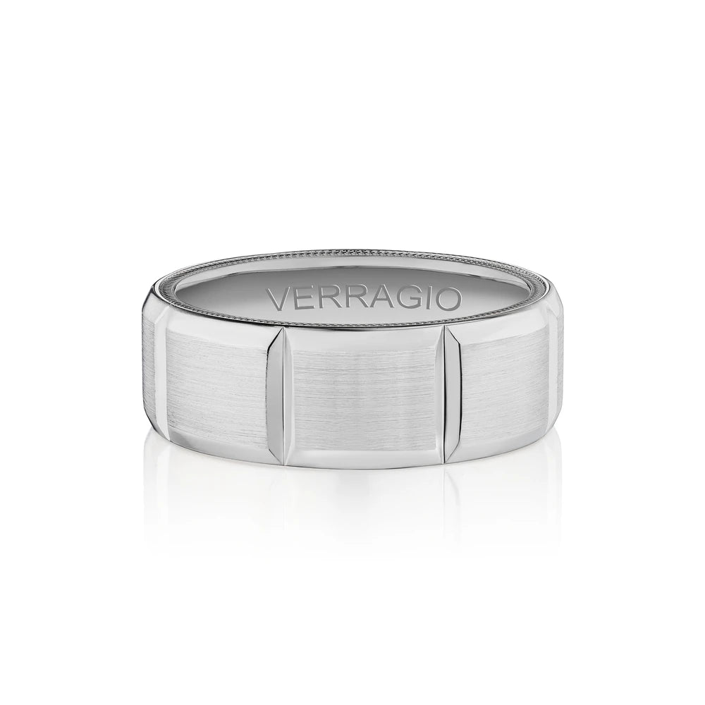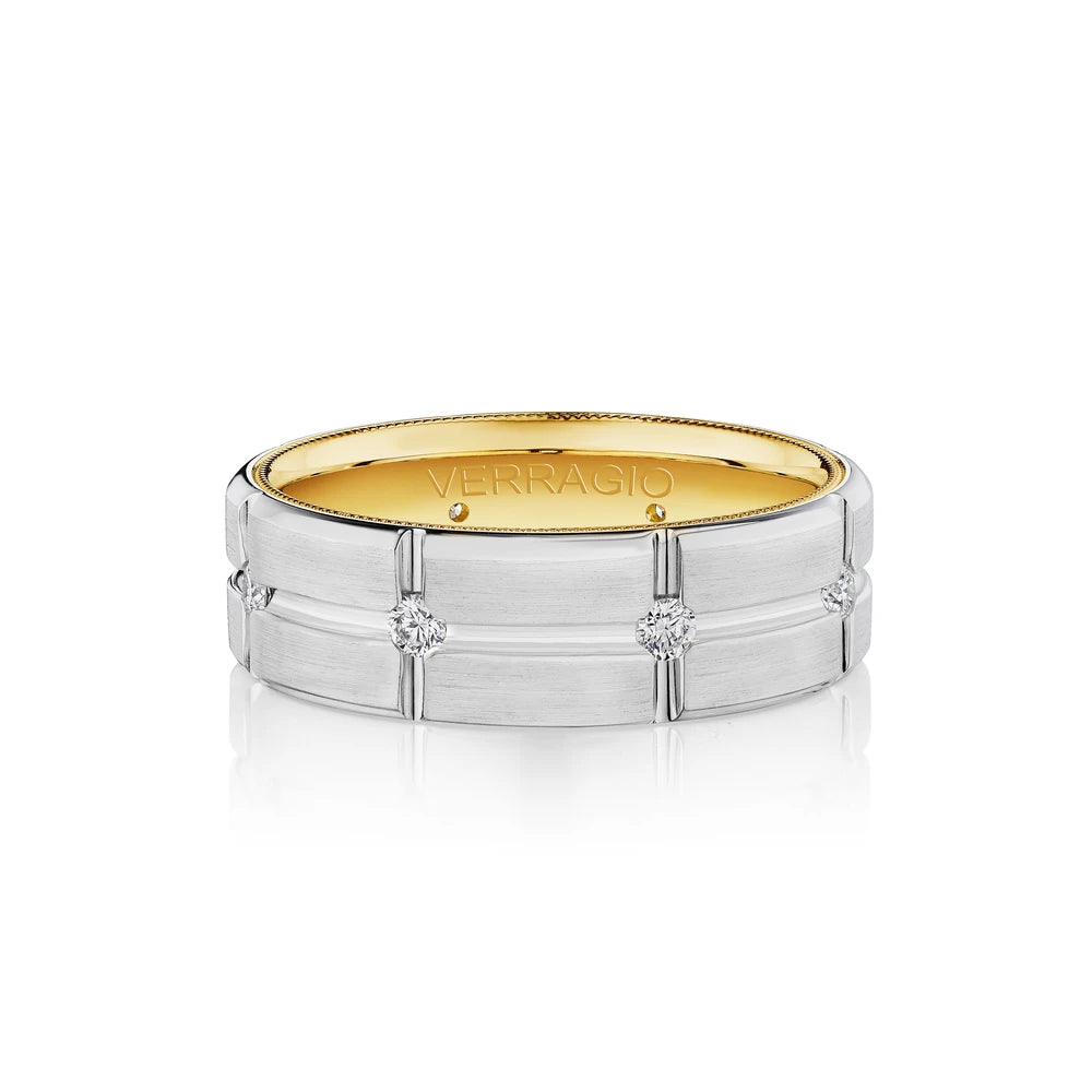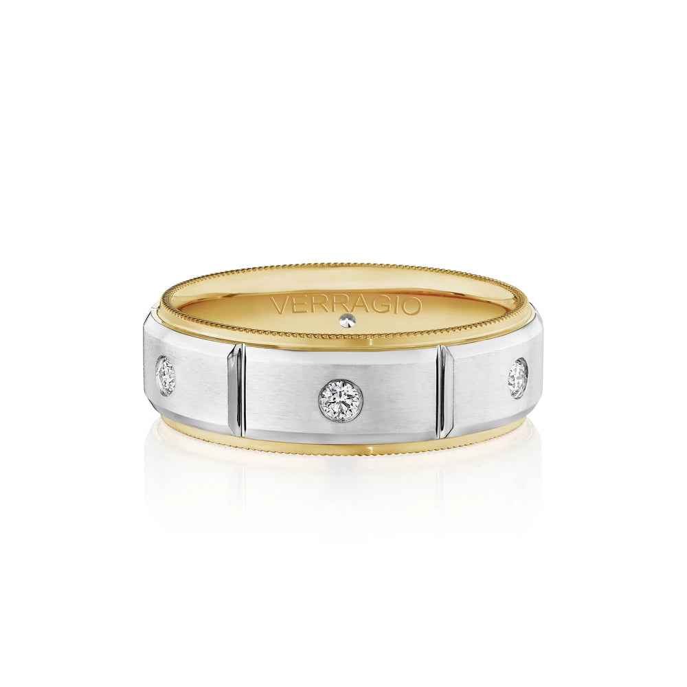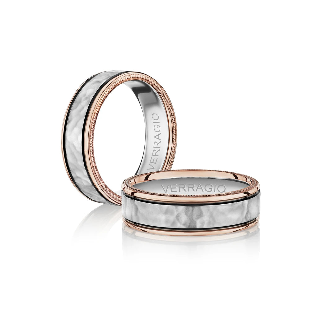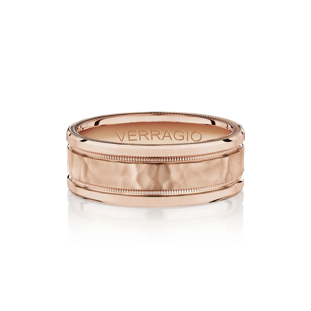 VW-8106 is our classic 8MM width men's band with a matte finish, accentuated with high polished edges. The modern geometric design carried throughout the ring is complimented by Verragio signature rose gold beading.