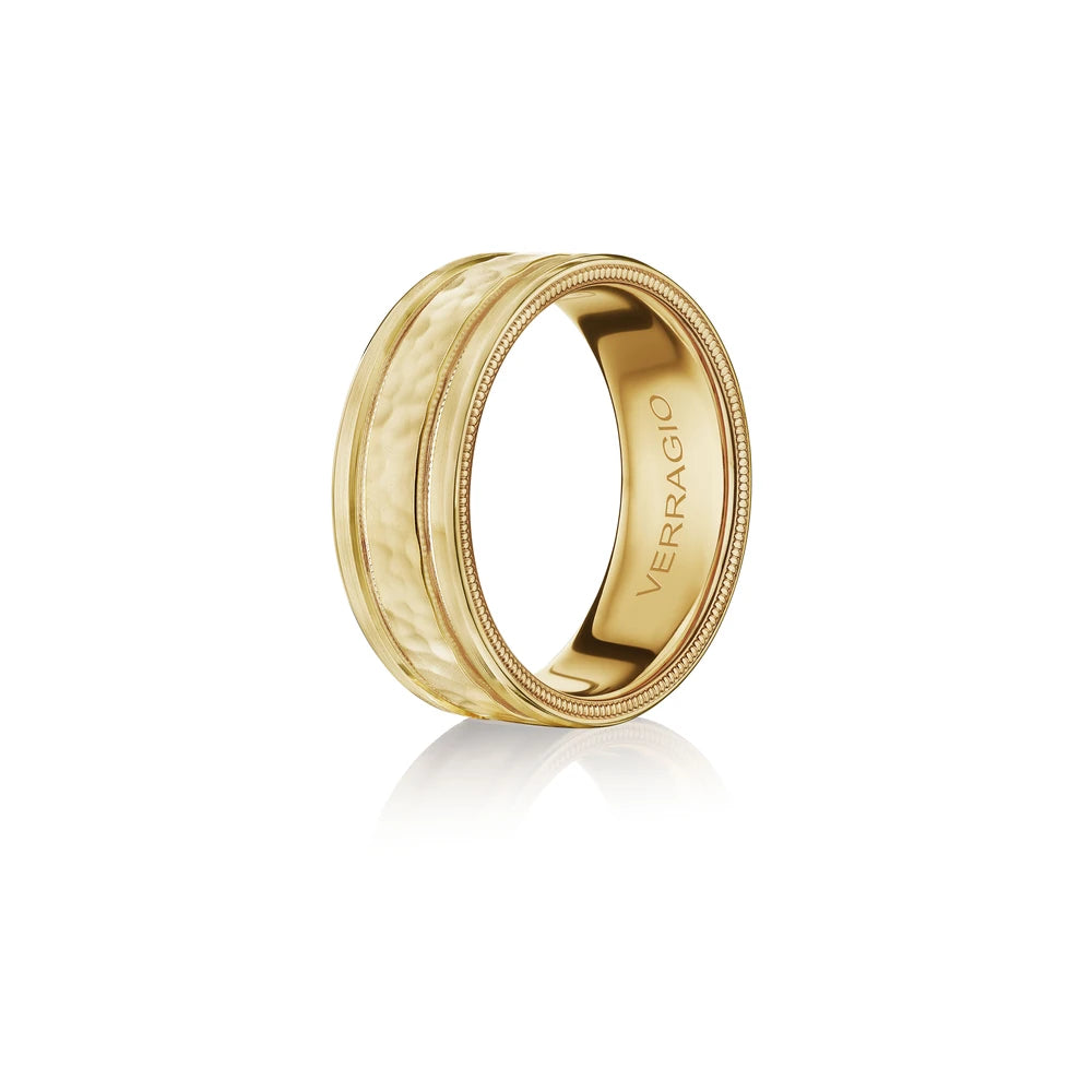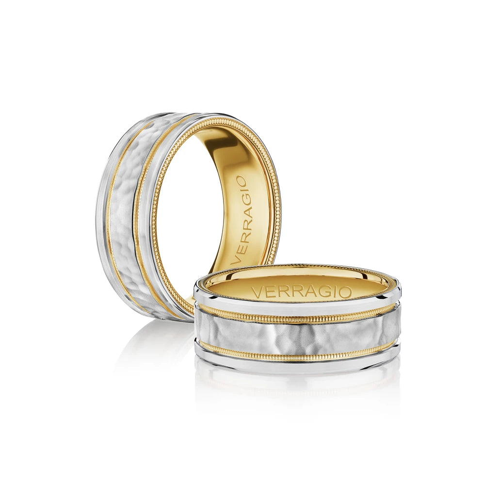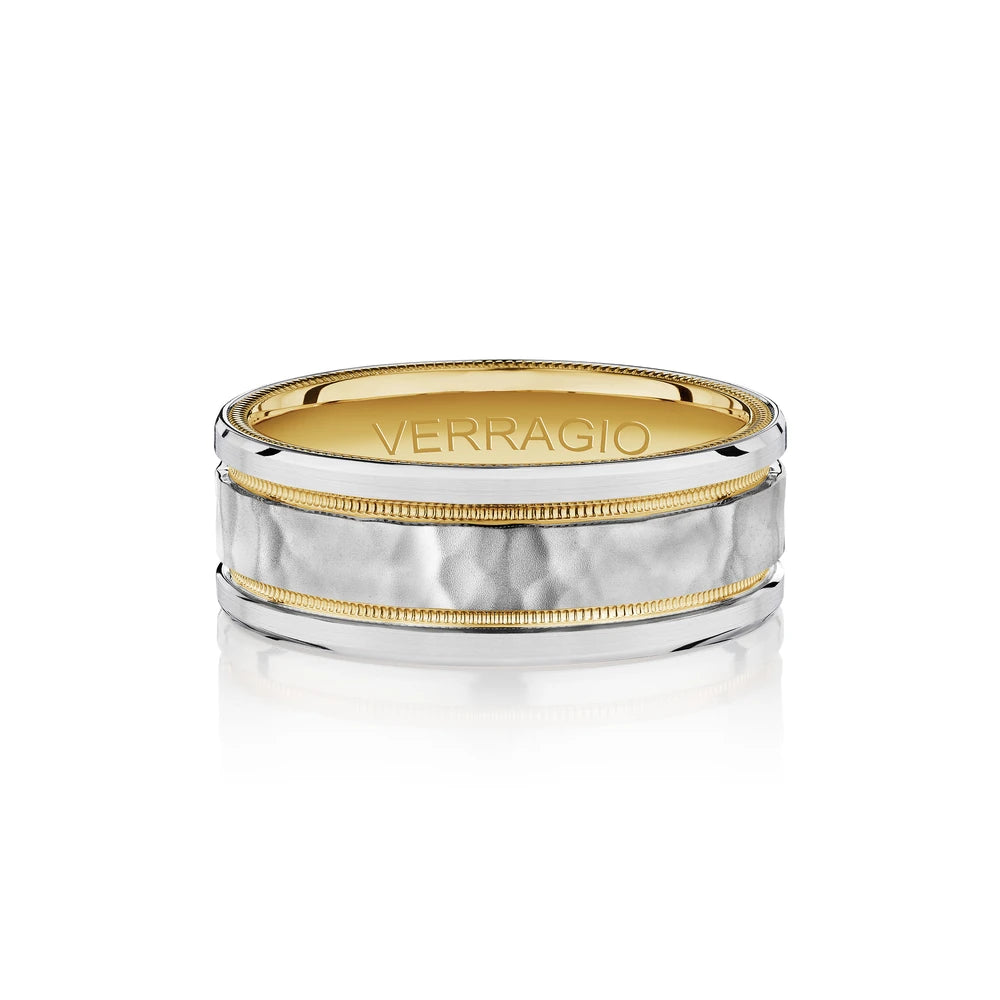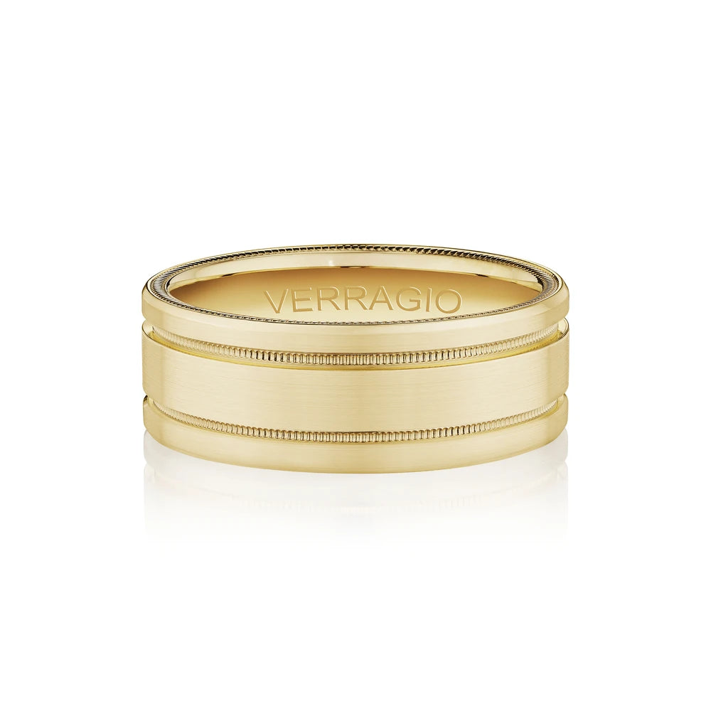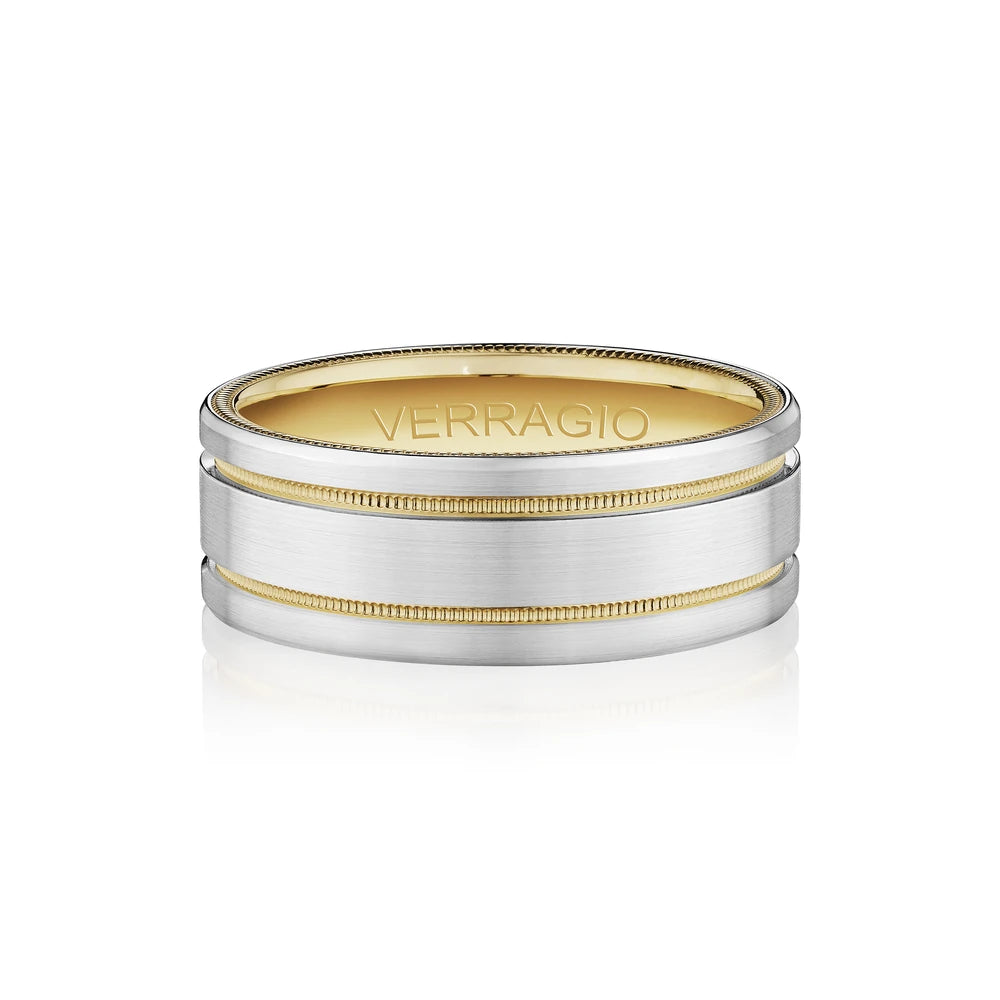 VW-8106 is our classic 8MM width men's band with a matte finish, accentuated with high polished edges. The modern geometric design carried throughout the ring is complimented by Verragio signature rose gold beading.