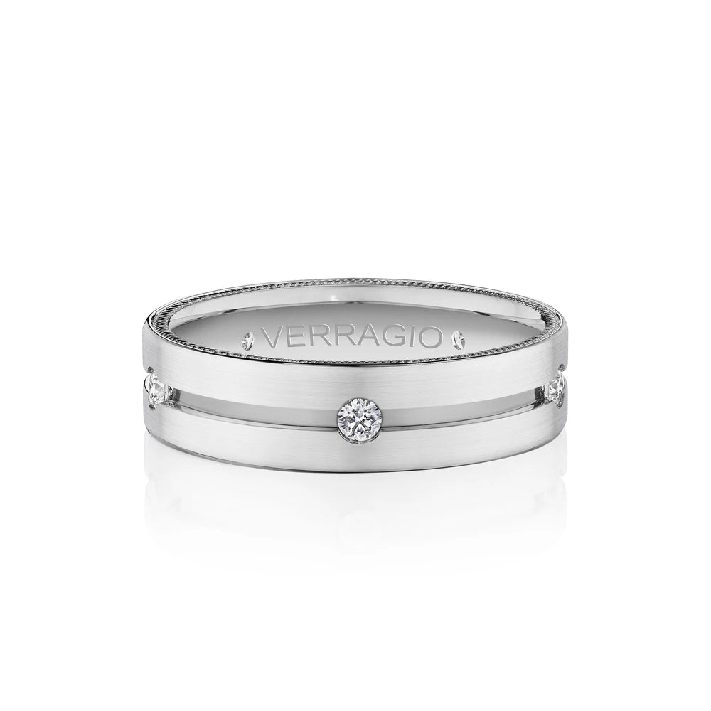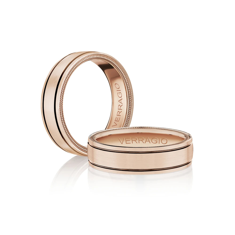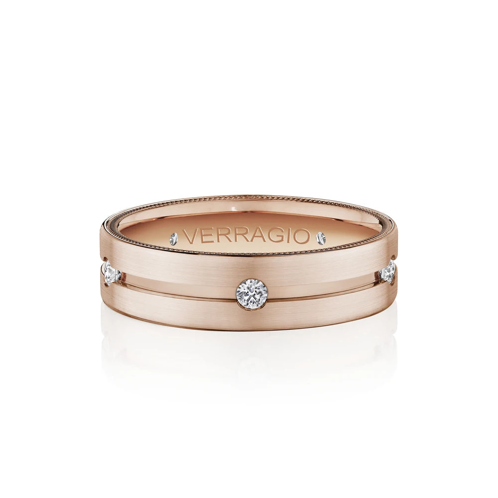 VWD-6921 is our sophisticated 6MM width diamond men's band with a matte finish. Running through the heart of the band are round brilliant-cuts within the singular etched grove, complimented by Verragio's rose gold signature beading.