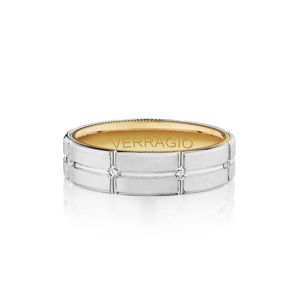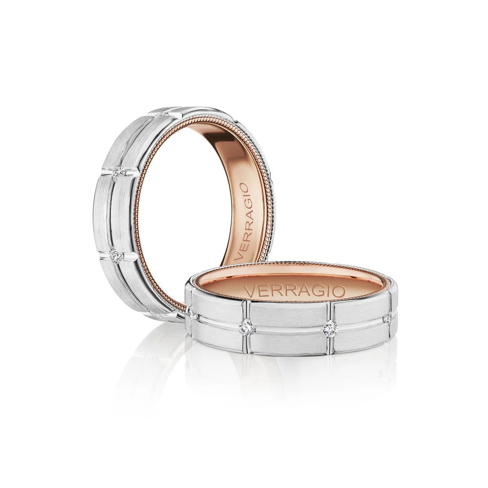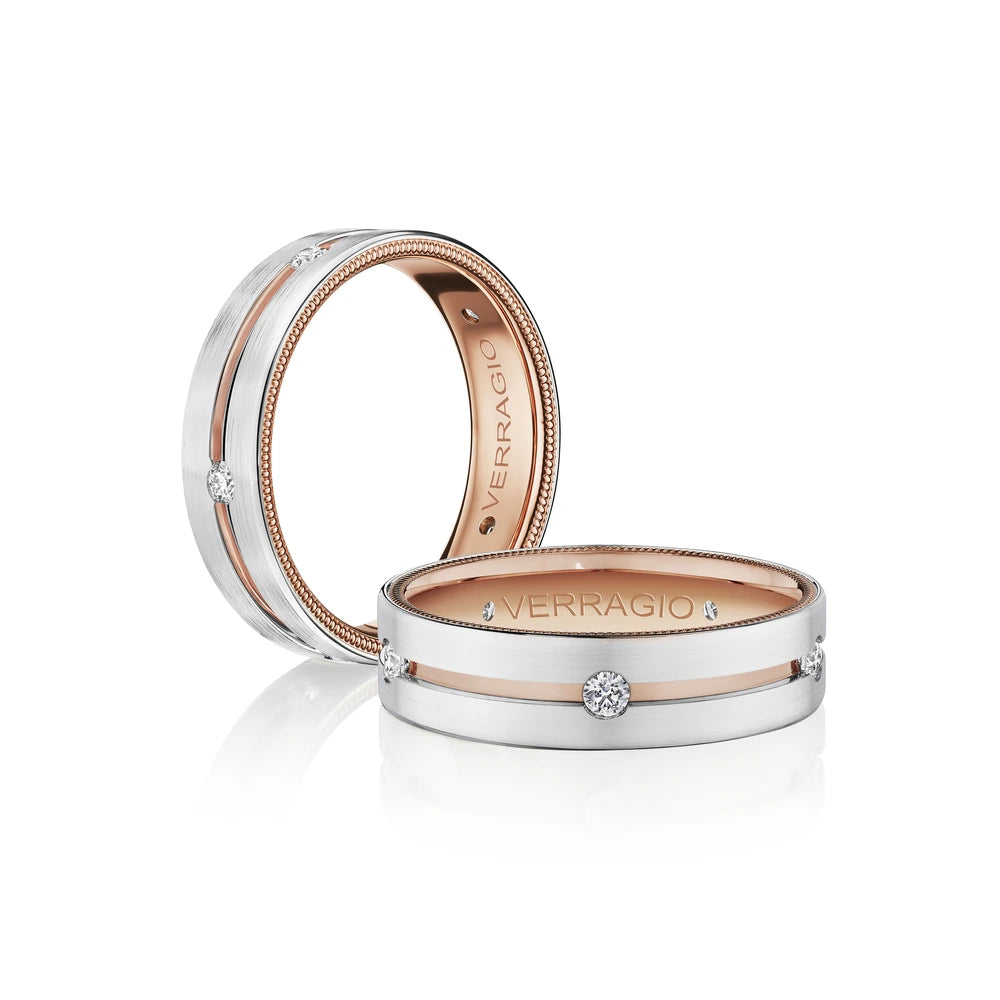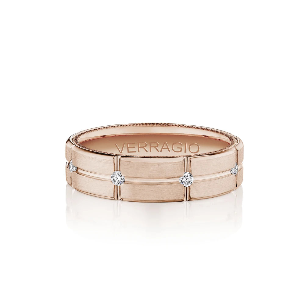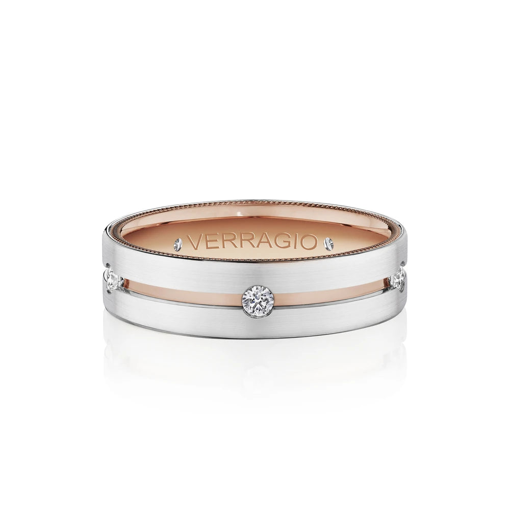 VWD-6921 is our sophisticated 6MM width diamond men's band with a matte finish. Adding to the elegance of this band are round brilliant-cut diamonds along a singular rose gold etched grove. Refined by Verragio's signature rose beading.