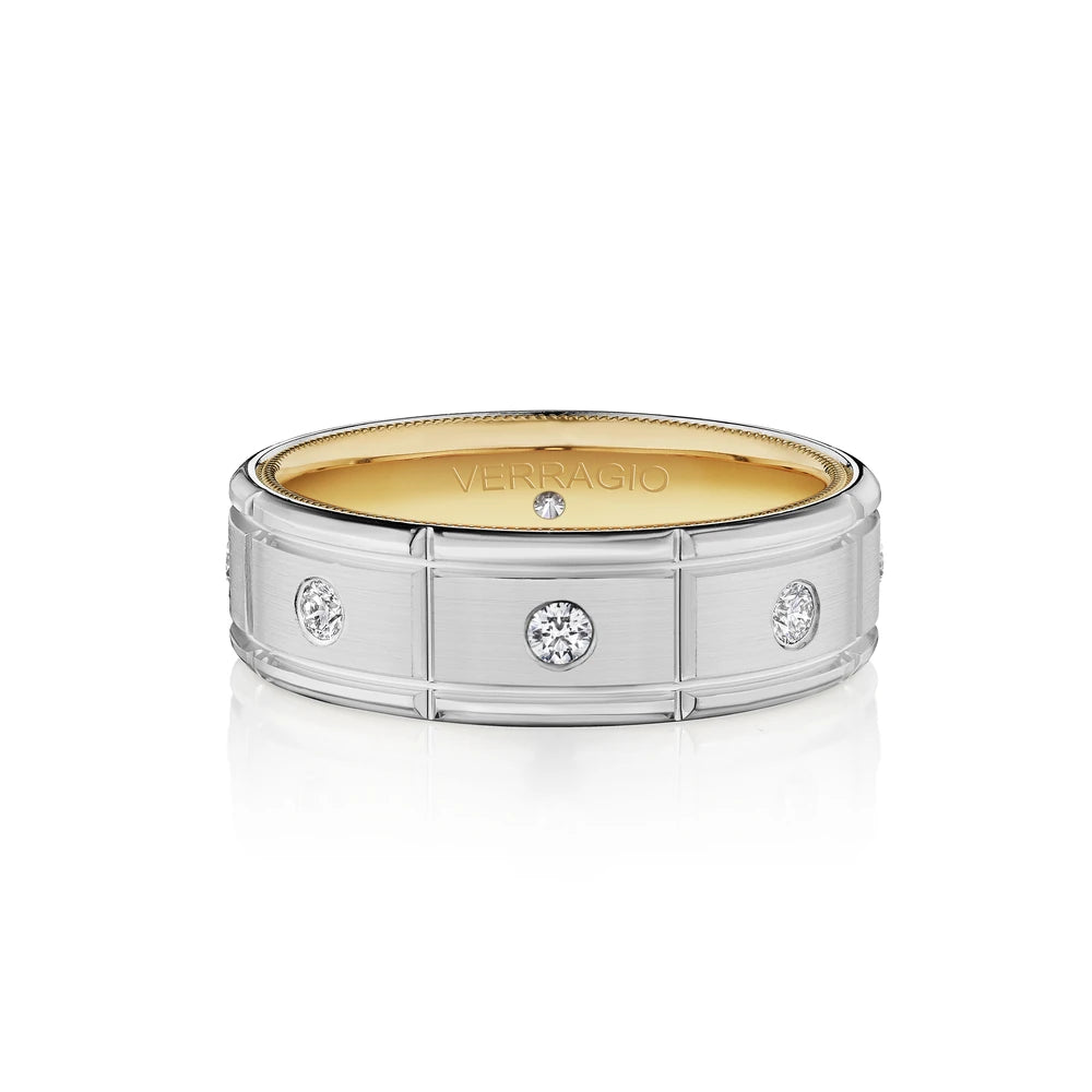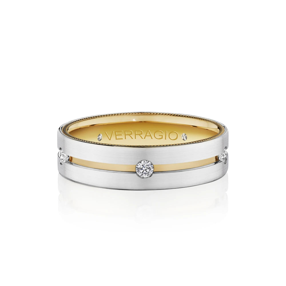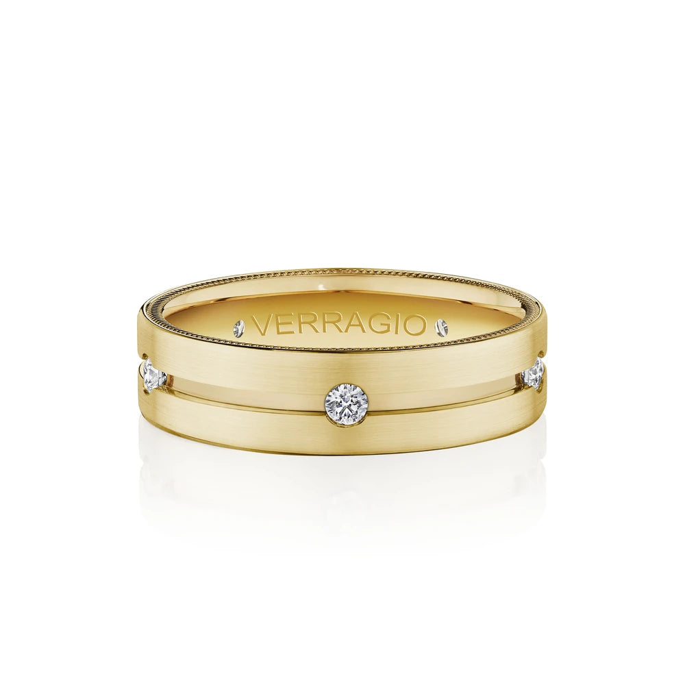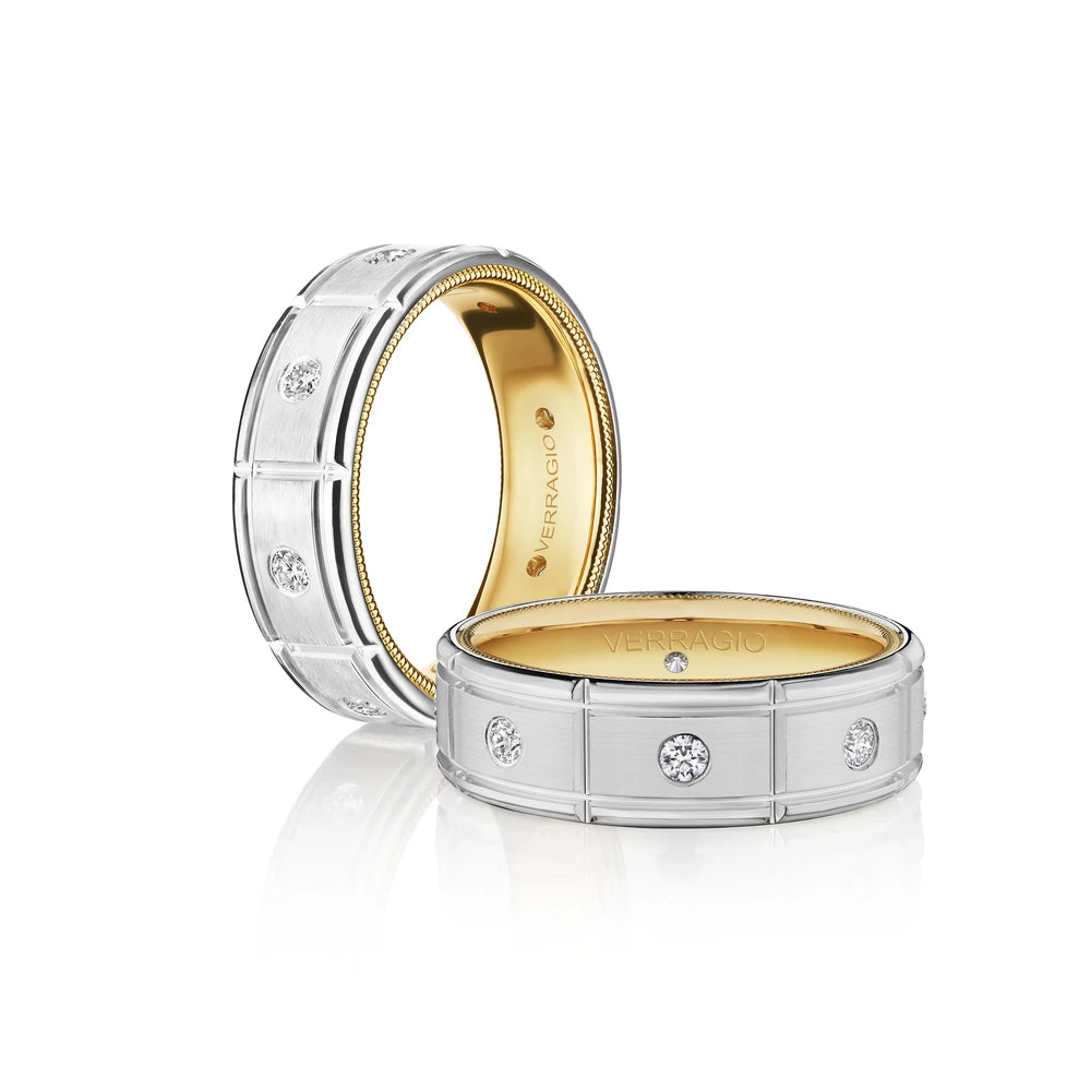 VWD-6921 is our sophisticated 6MM width diamond men's band with a matte finish. Adding to the elegance of this band are round brilliant-cut diamonds along a singular rose gold etched grove. Refined by Verragio's signature rose beading.