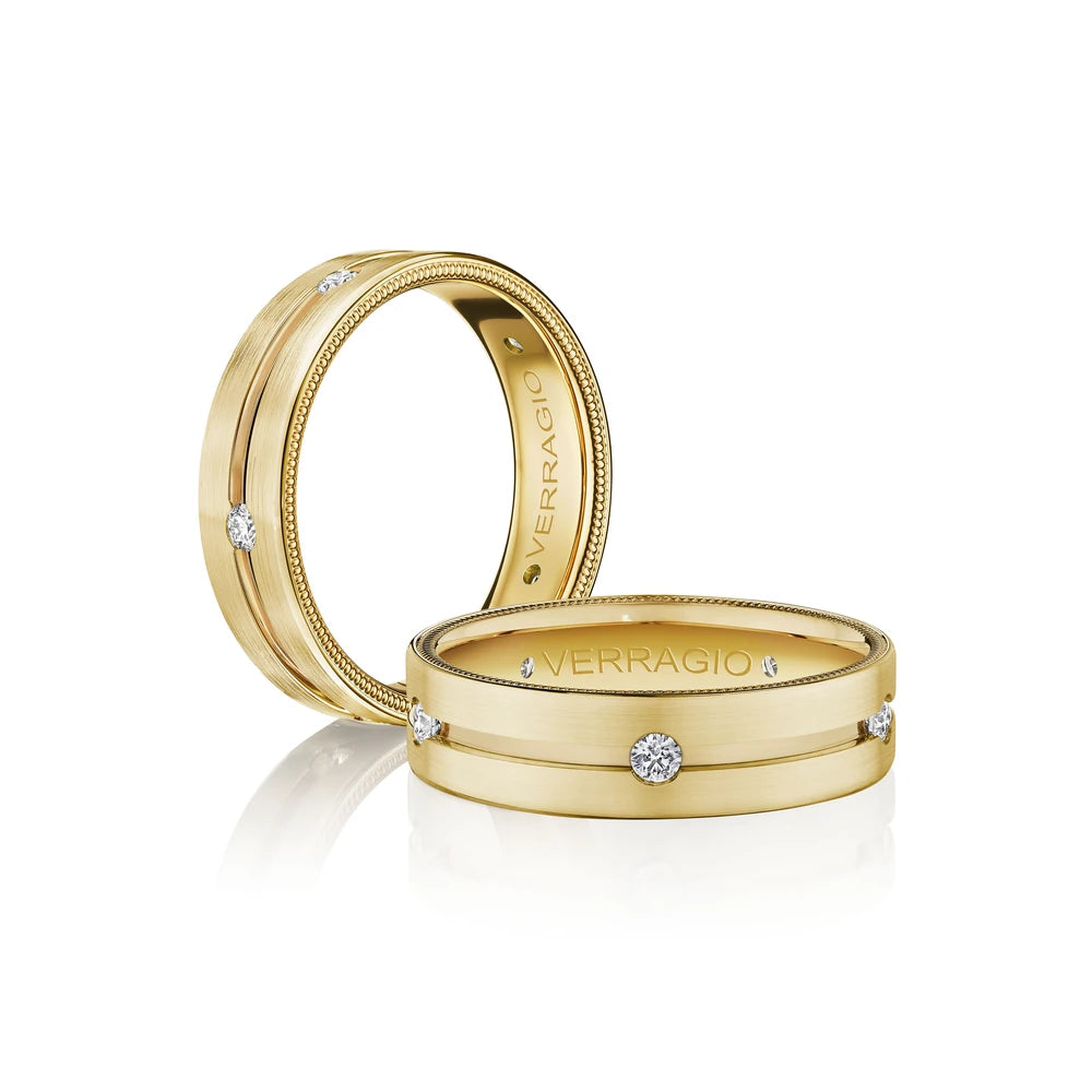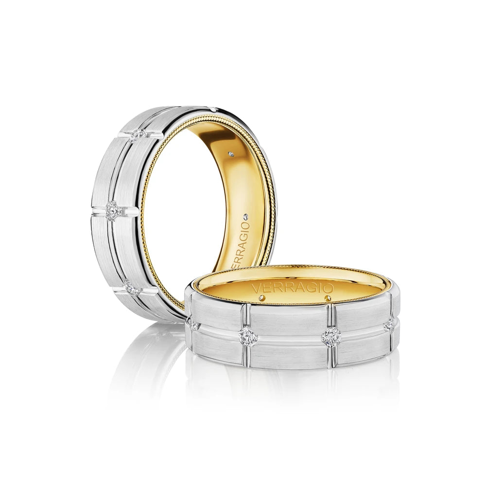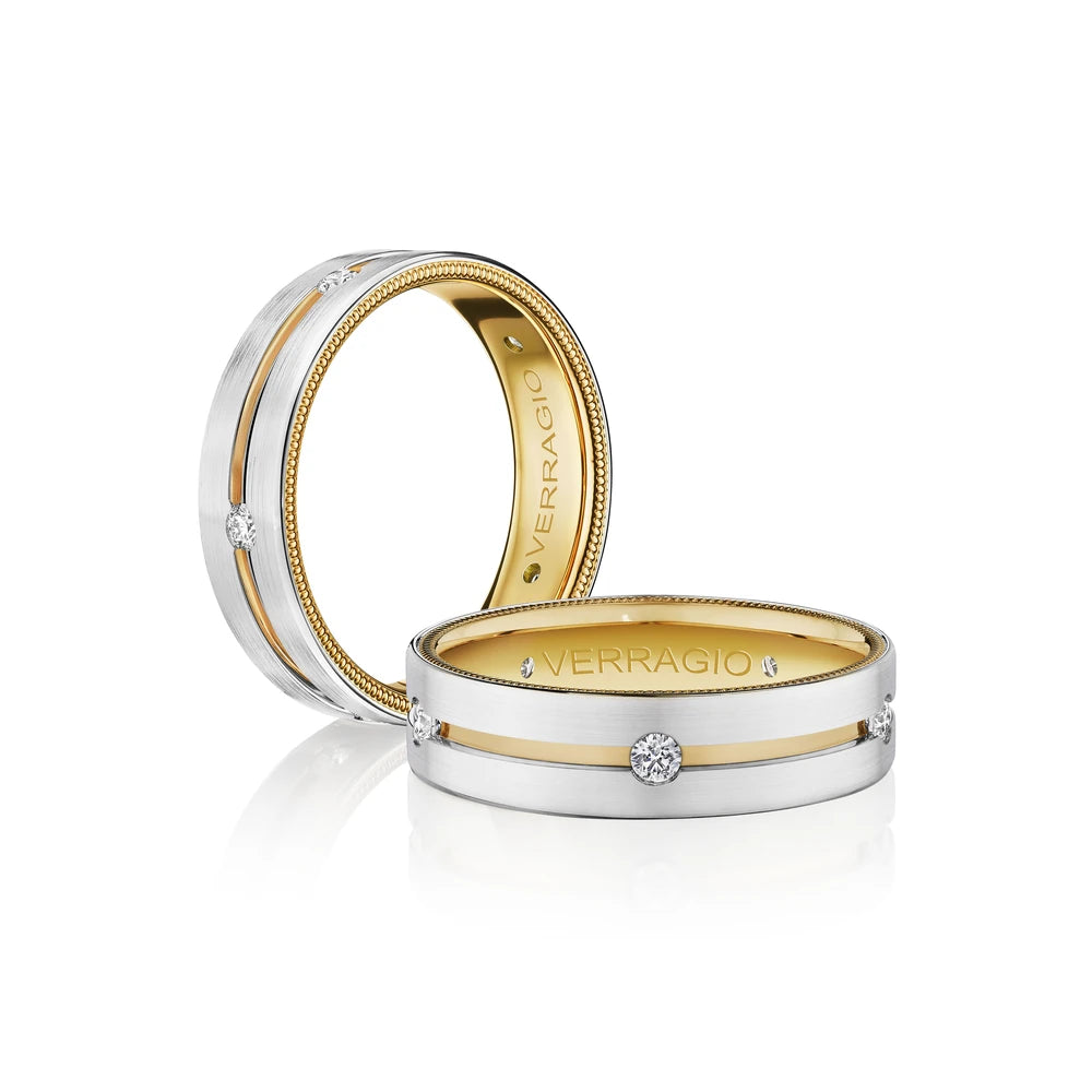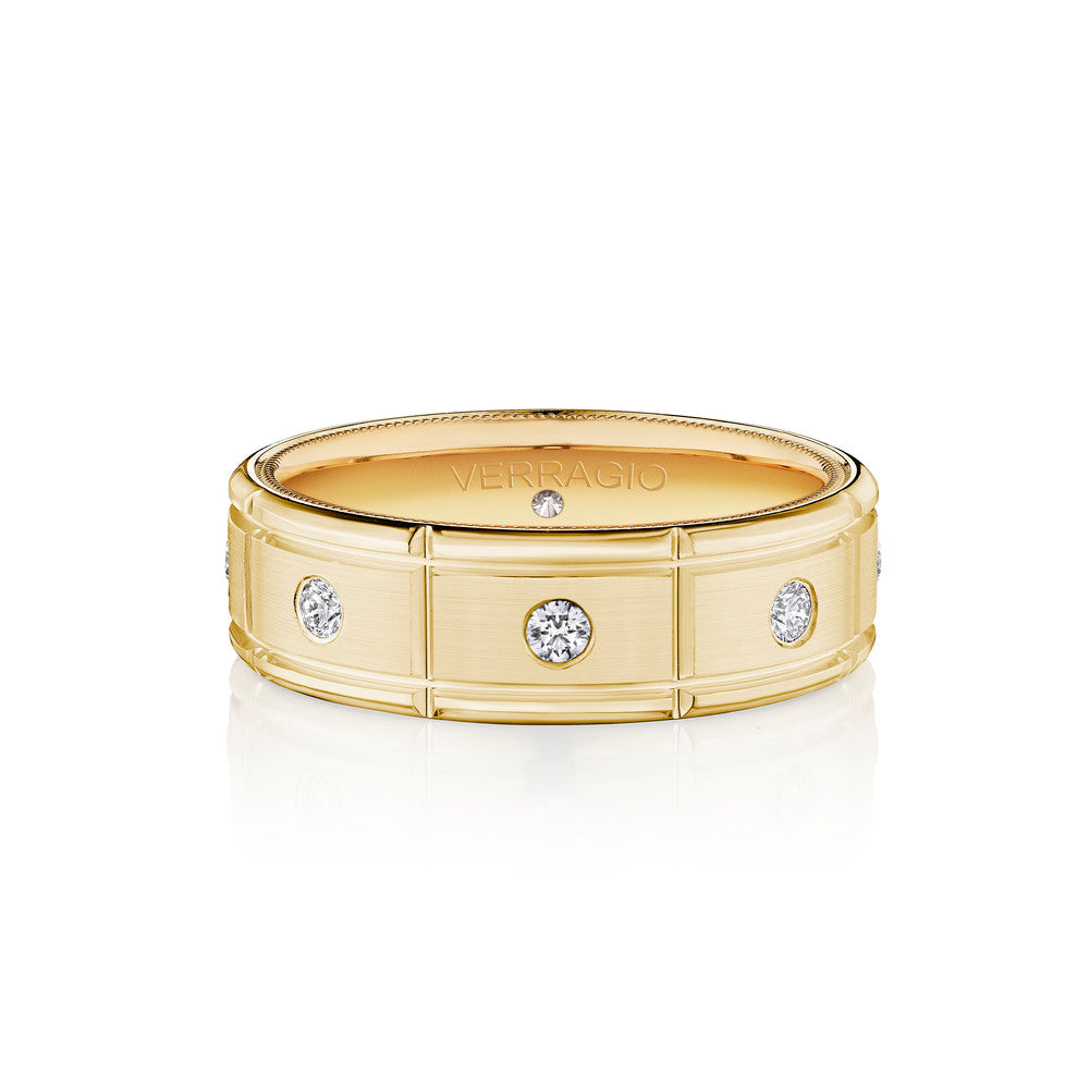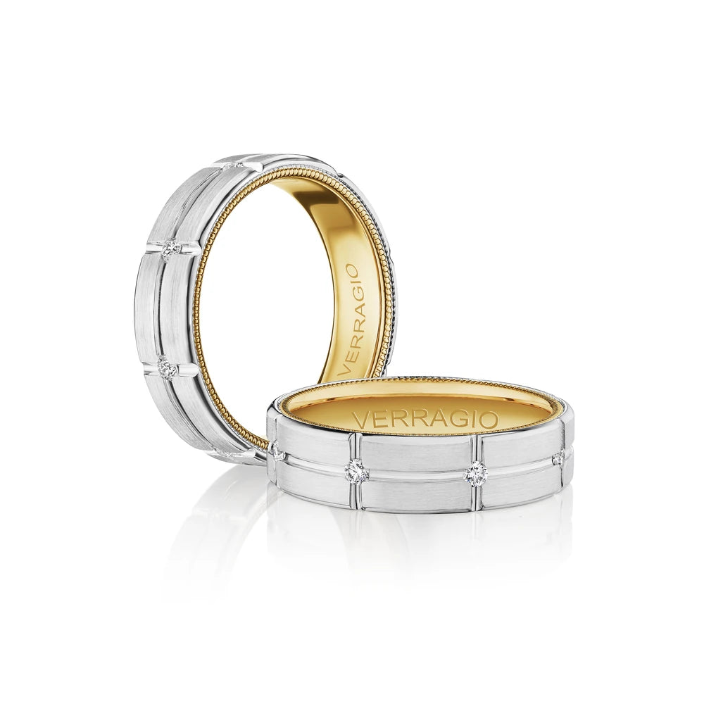 VWD-6921 is our sophisticated 6MM width diamond men's band with a matte finish. Adding to the elegance of this band are round brilliant-cut diamonds along a singular rose gold etched grove. Refined by Verragio's signature rose beading.