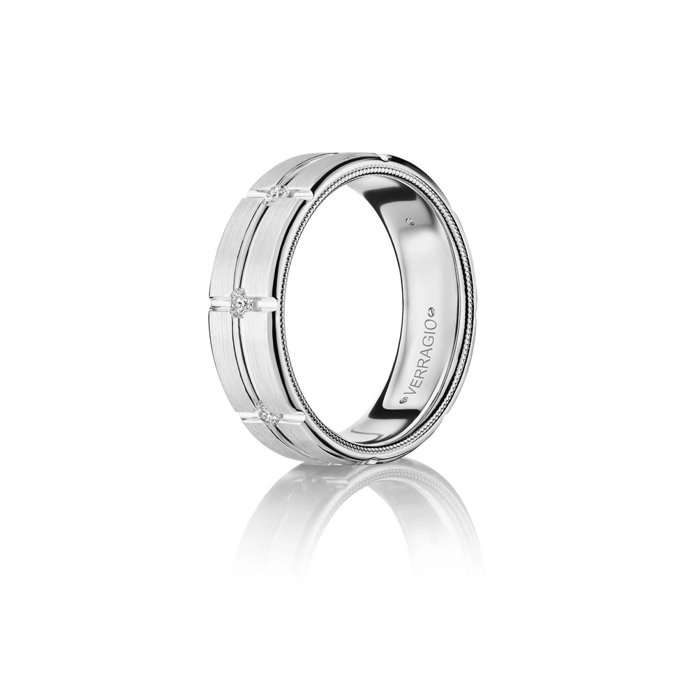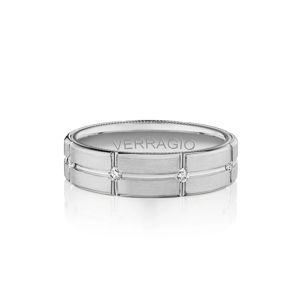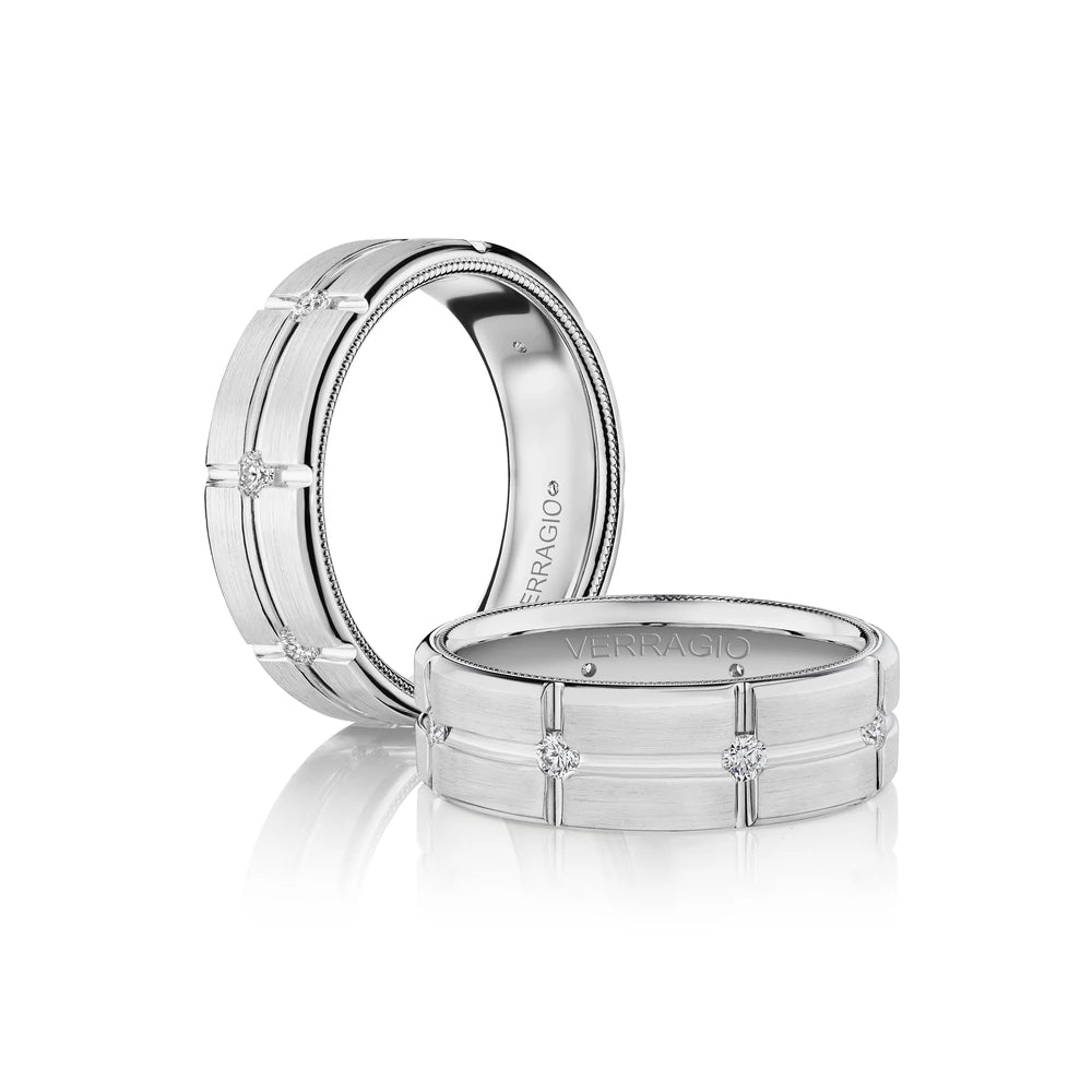 One of our latest wedding band designs in a 7mm width and brilliant diamond accents in contrast to the unique matte finishing. Polished edges add a modern look while the signature Verragio bead-work give it a tailored feel. Whether you prefer modern or traditional styles, these wedding bands are precisely crafted with artisanal details to stand out.