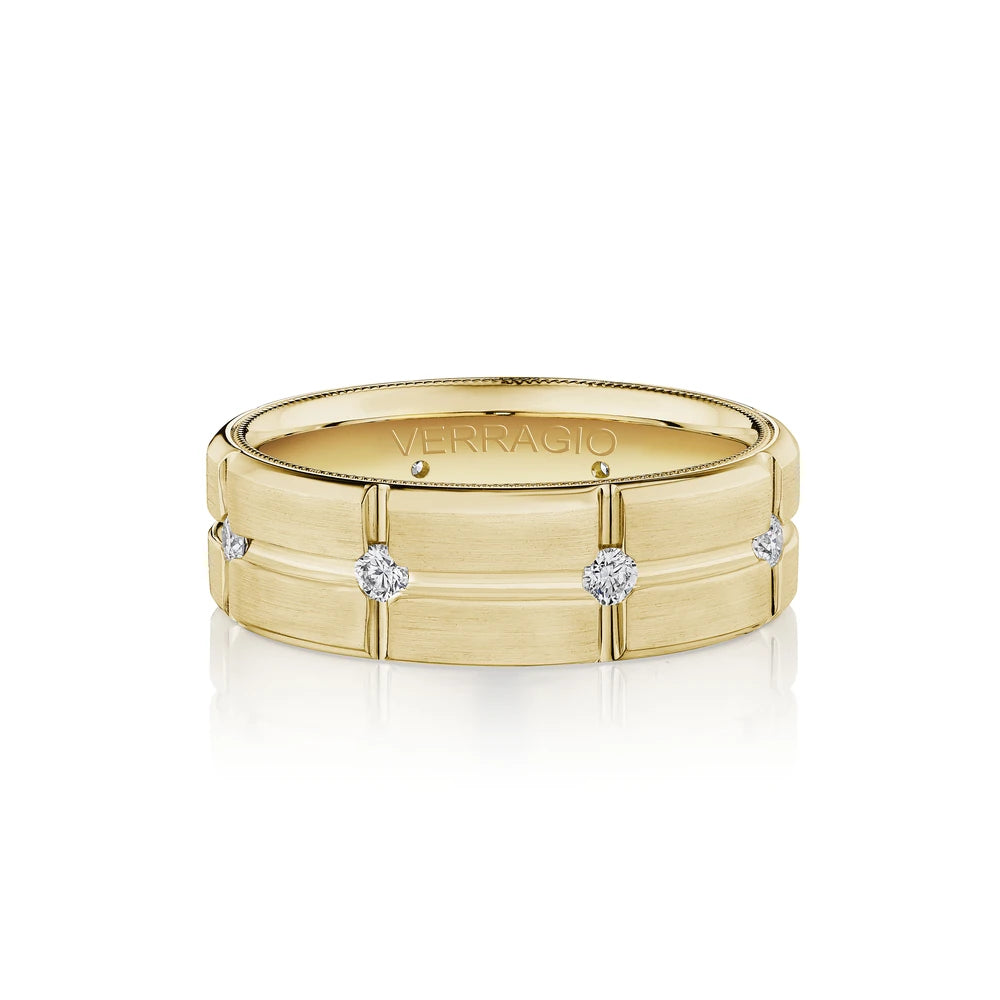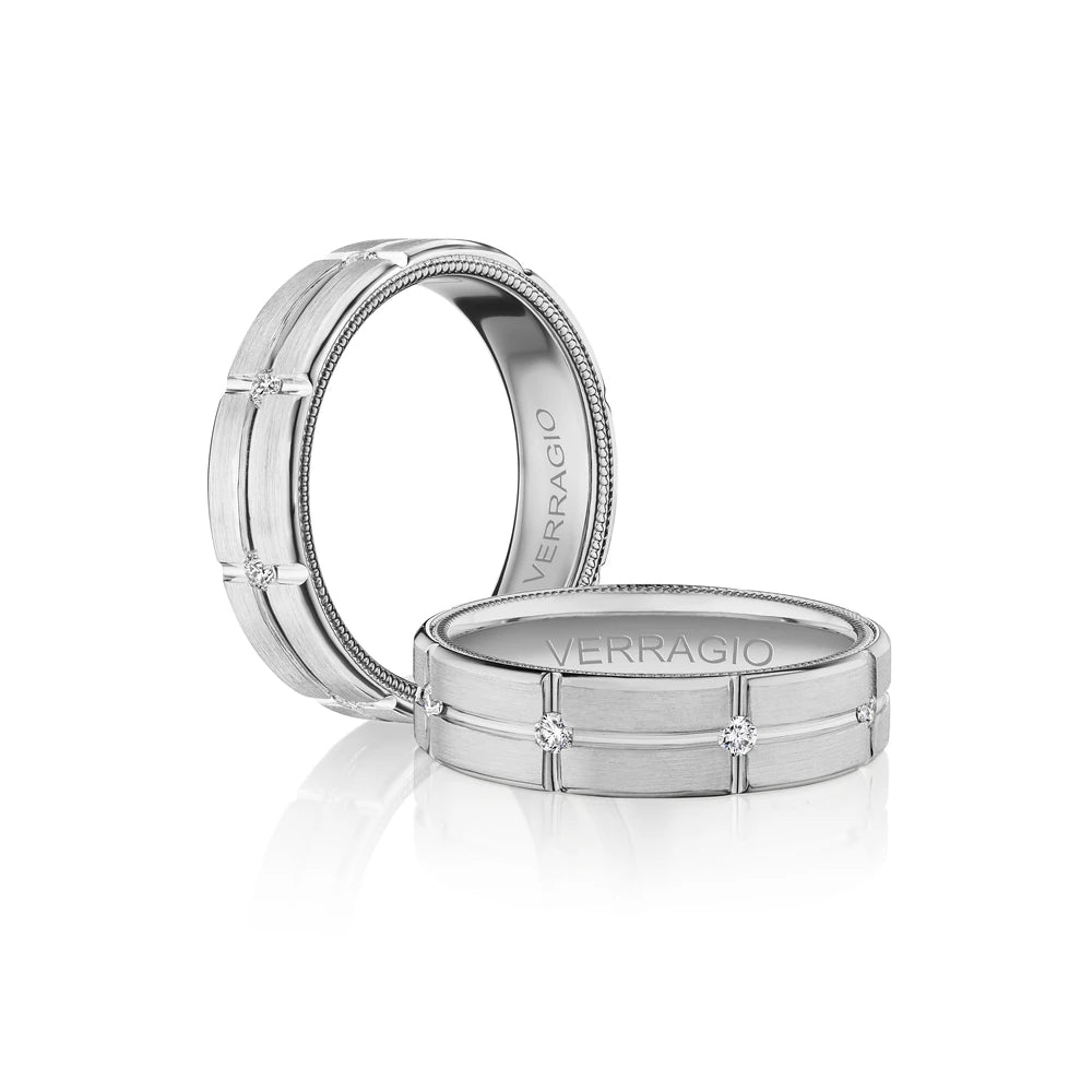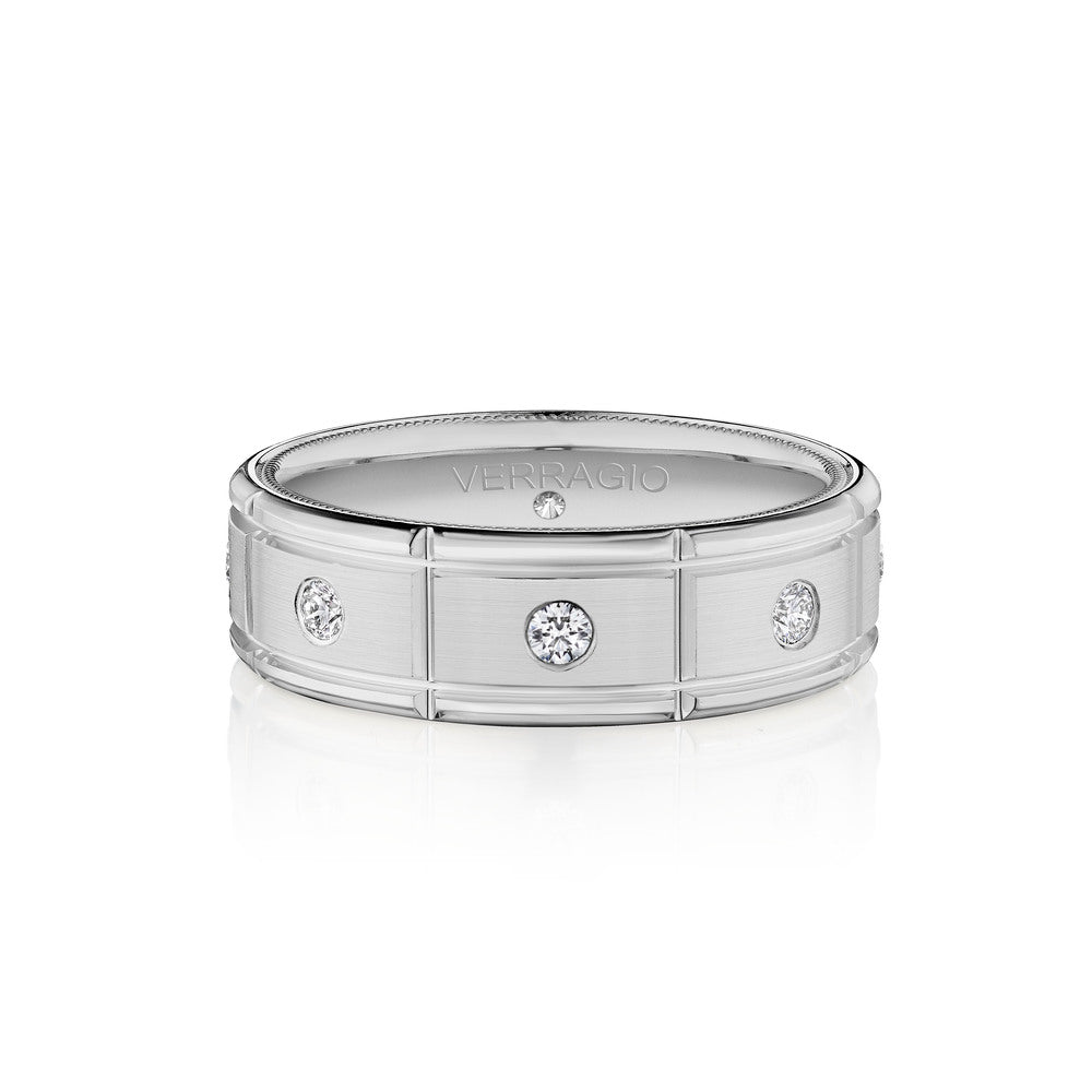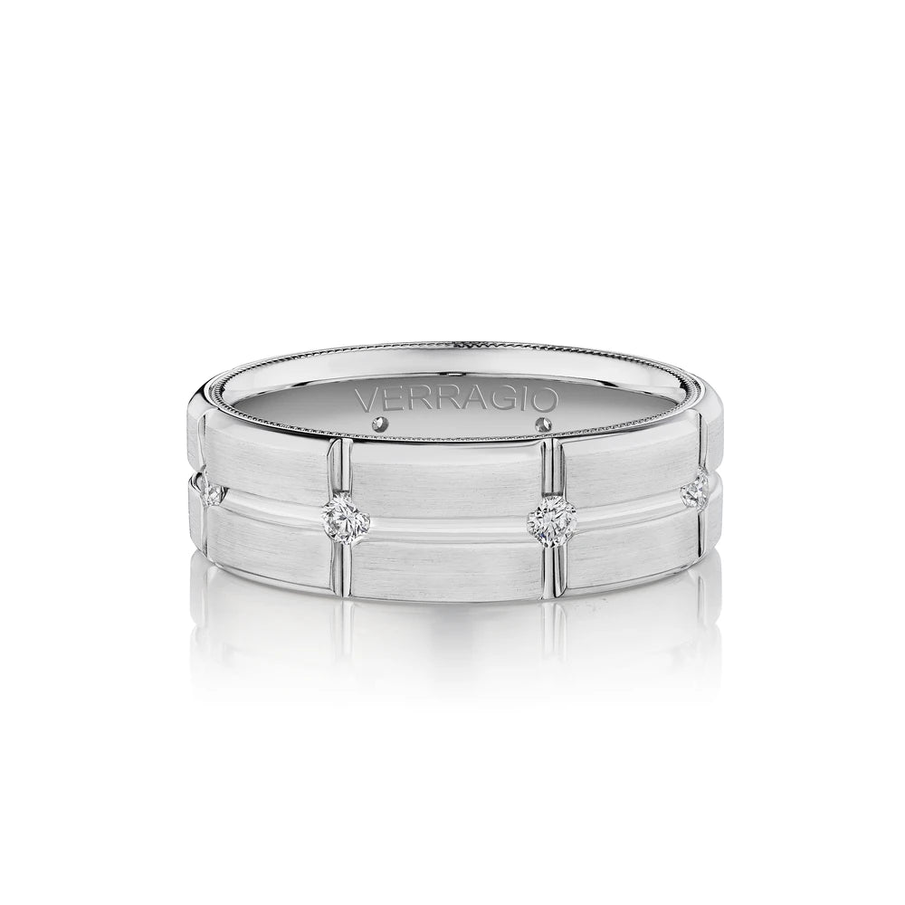 One of our latest wedding band designs in a 7mm width and brilliant diamond accents in contrast to the unique matte finishing. Polished edges add a modern look while the signature Verragio bead-work give it a tailored feel. Whether you prefer modern or traditional styles, these wedding bands are precisely crafted with artisanal details to stand out.