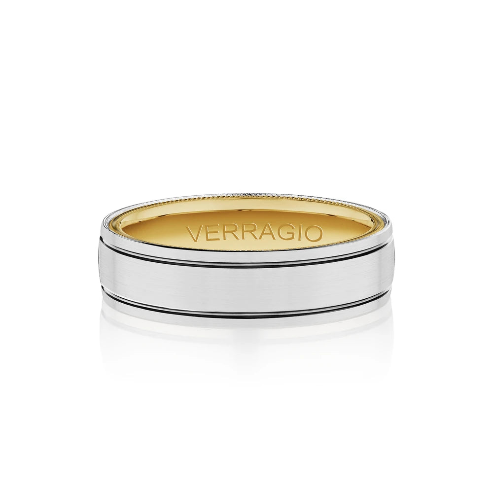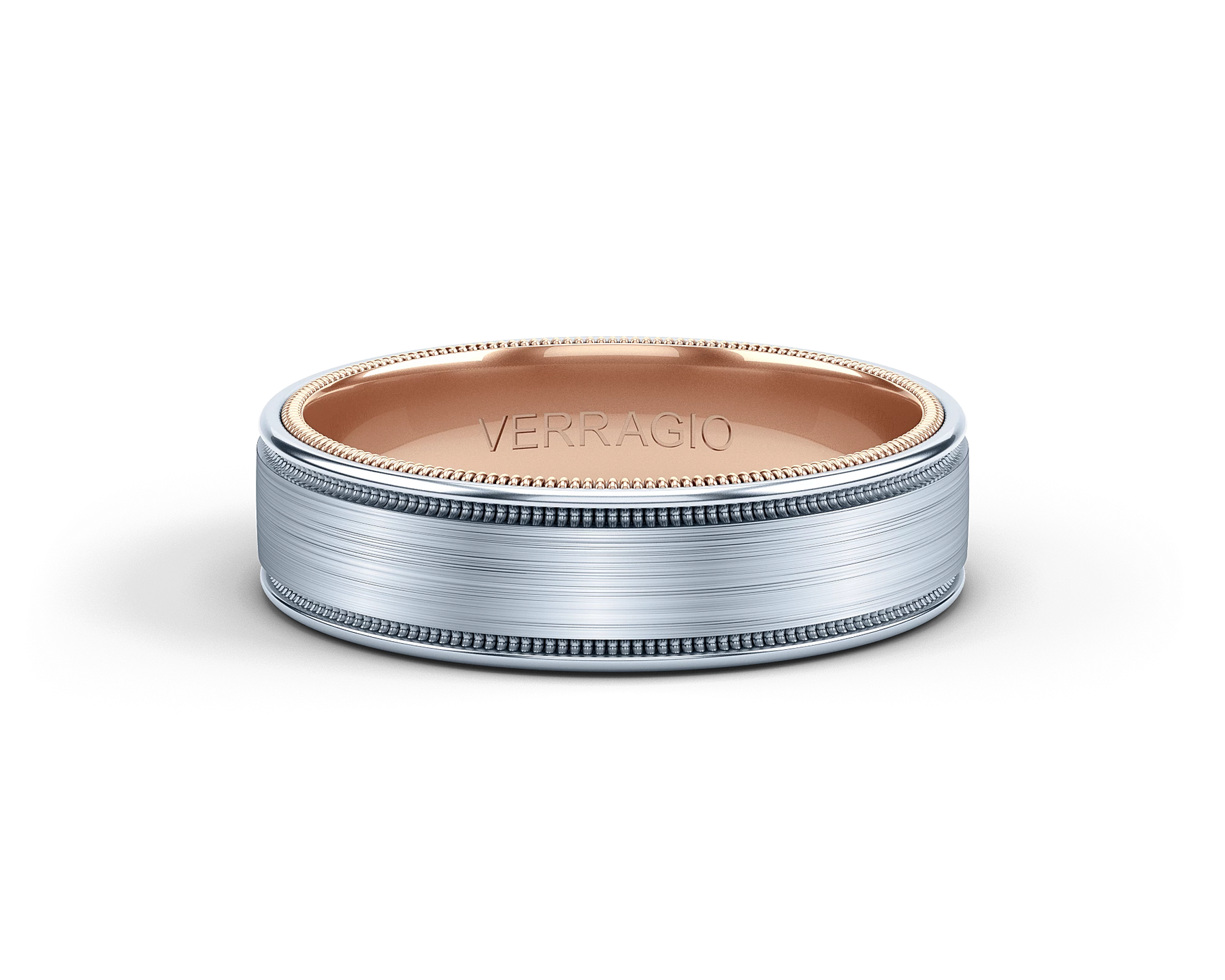 VW-7114 is our stylish 7MM width men's band with a matte finish elevated by the interior detailing of Verragio's signature rose gold beading along the edges. Along the heart of the ring run two grooves highlighting the rose gold in the band.