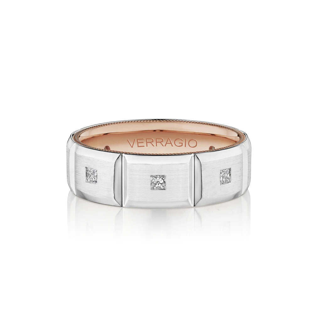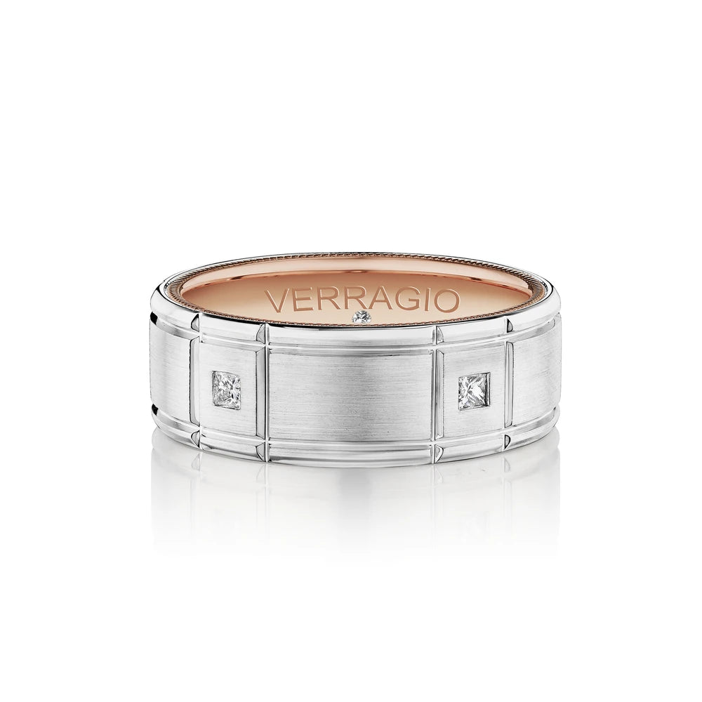 VWD-8905 is our timeless 8MM width diamond men's band with a matte finish. Adorned with princess cuts throughout the band, the skillfully high polished edges are enhanced by Verragio's signature rose gold beading.