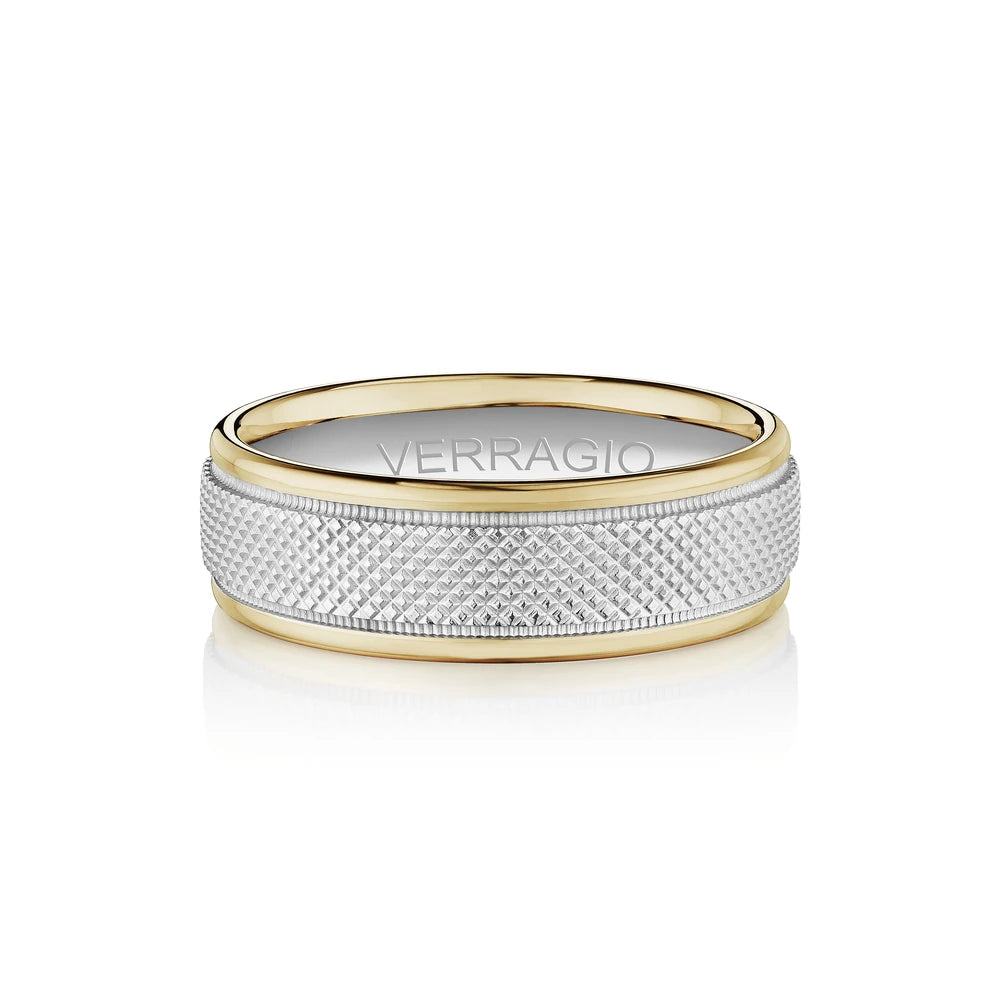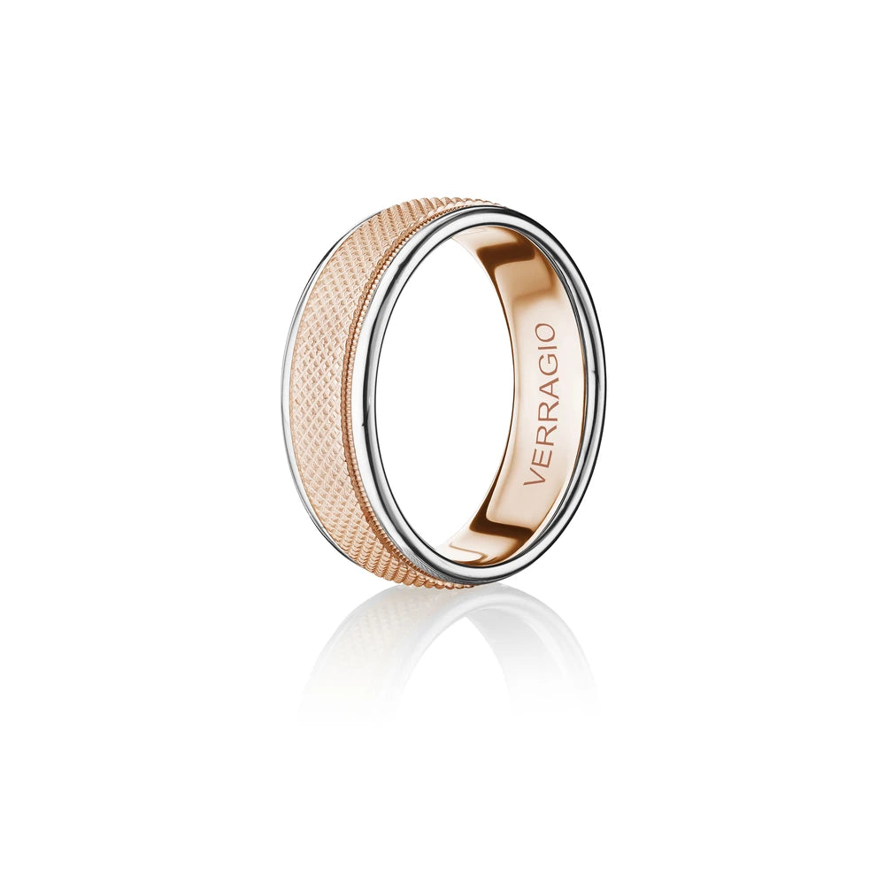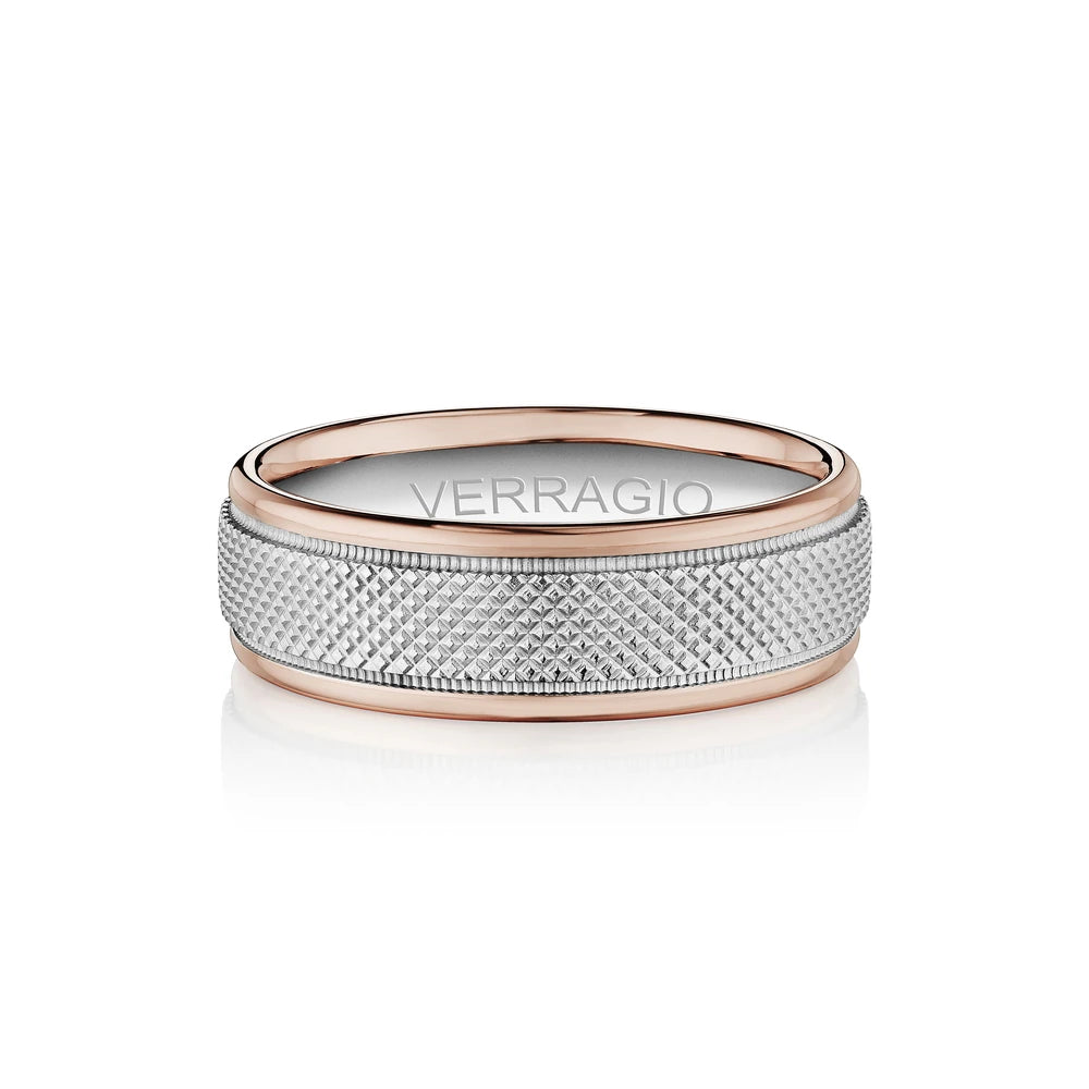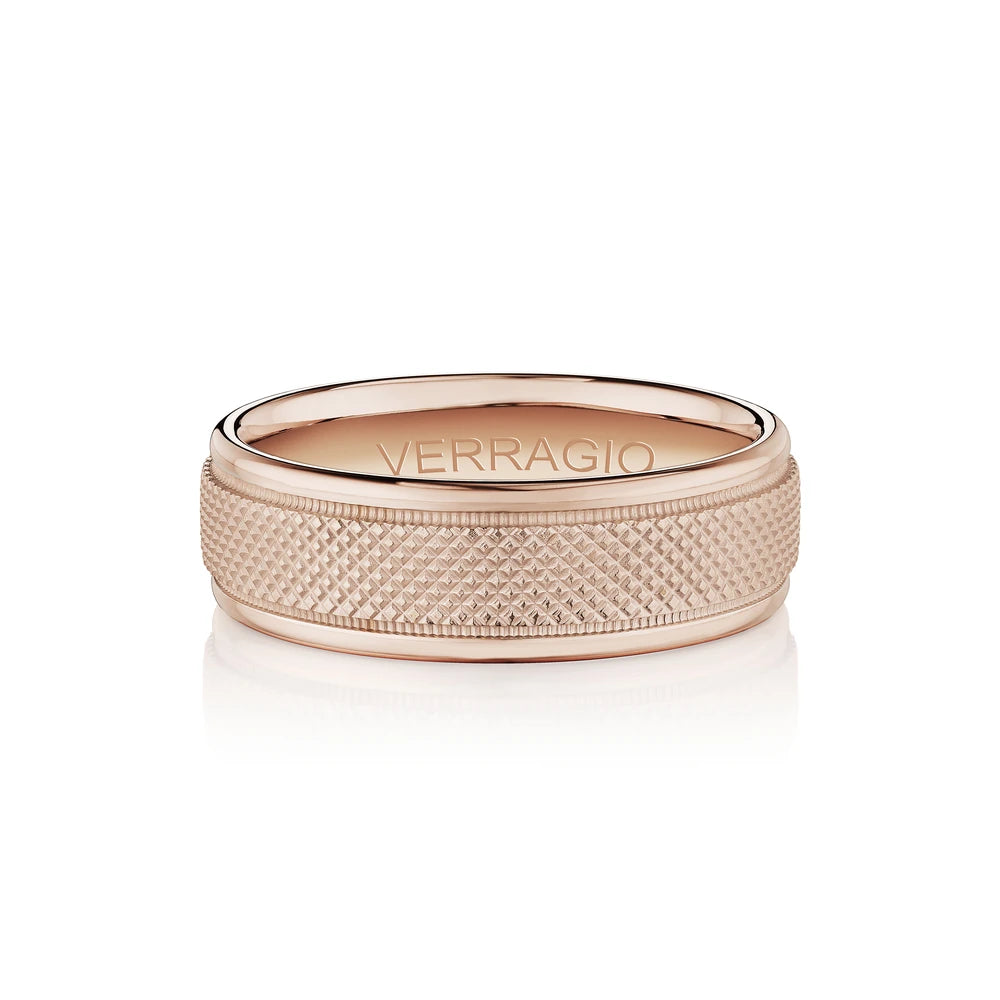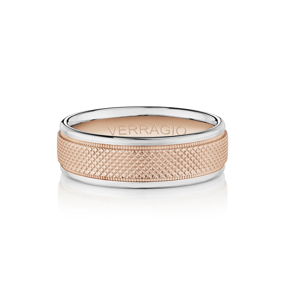 The ultimate in sophistication for wedding bands. This ring combines your choice of textured gold in the center either rose yellow or white with high-polish gold along with edges. Verragio's Signature Beading defines the design with exceptional style while the 7mm width fits comfortably for everyday wear. Available only in 14KT.