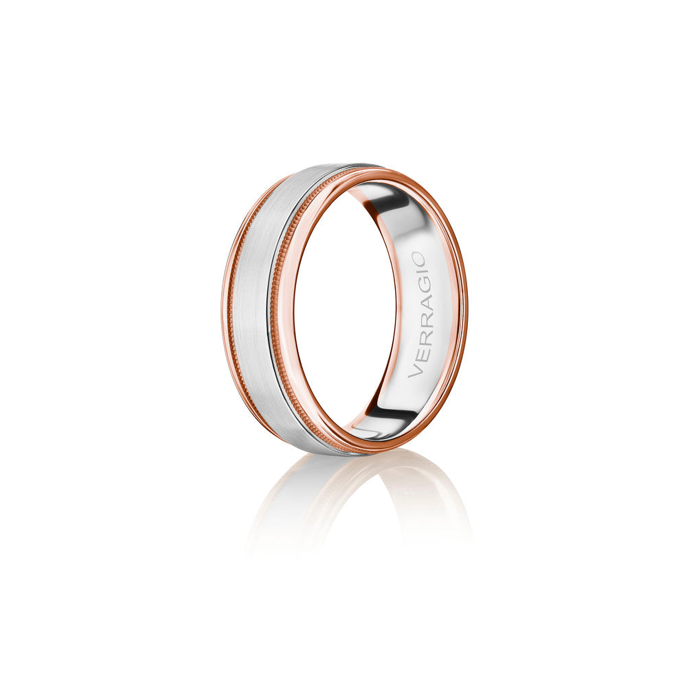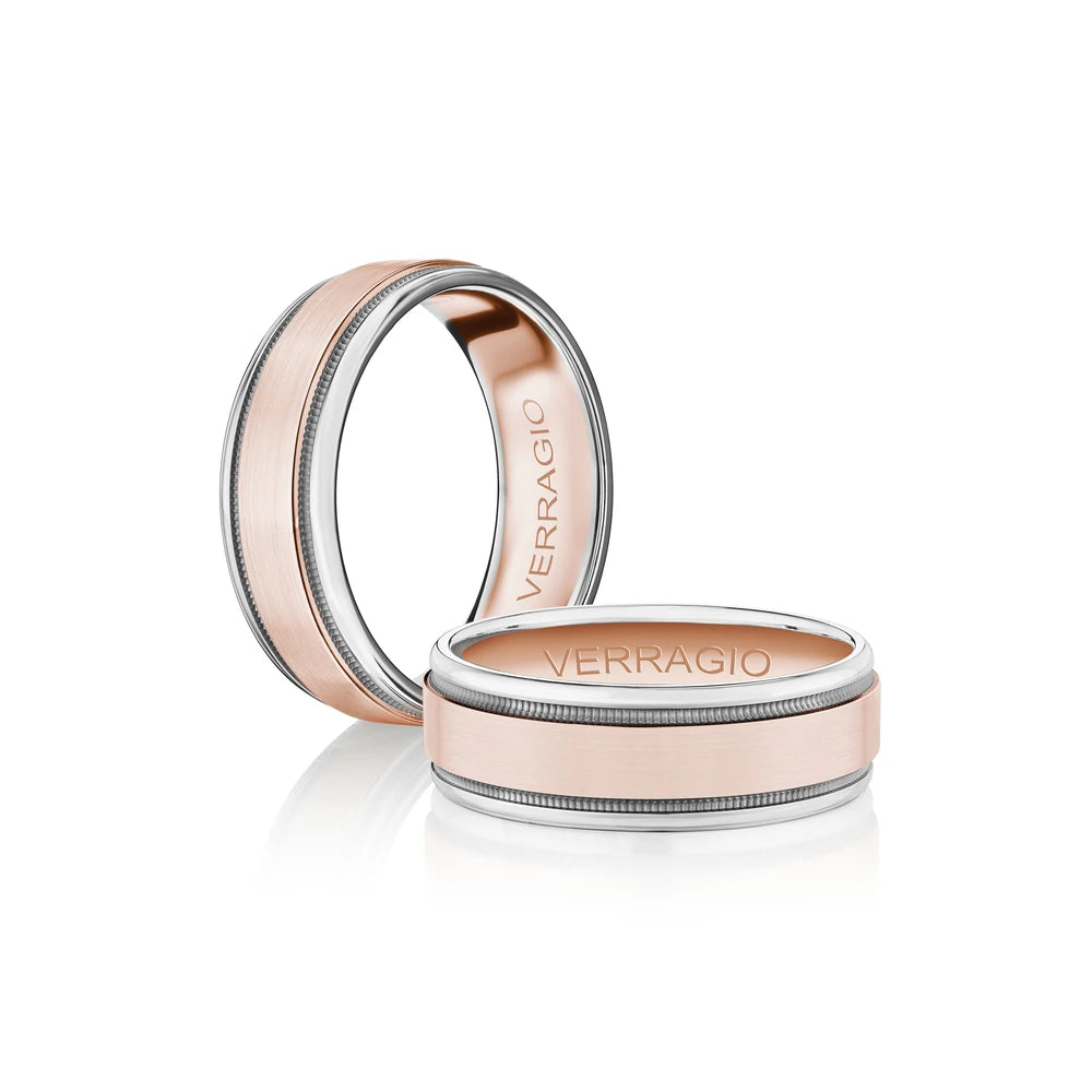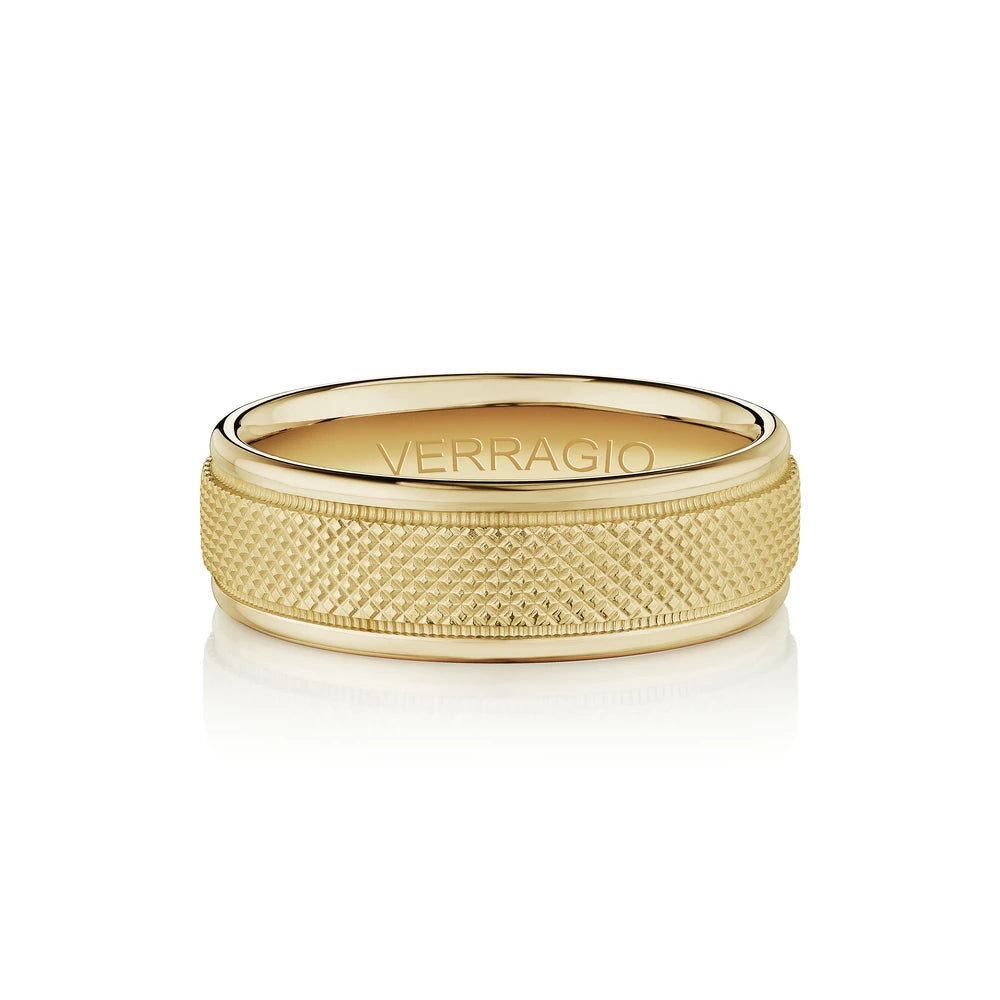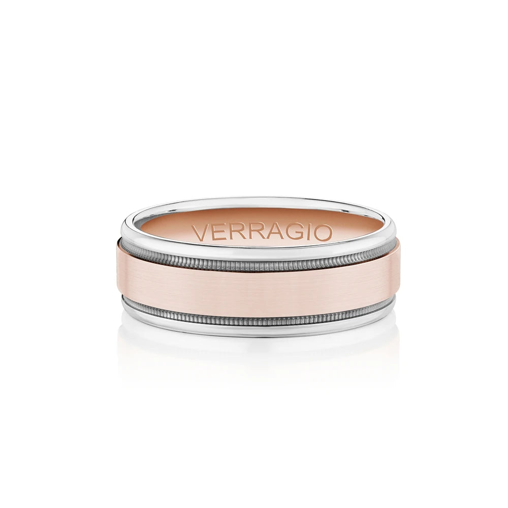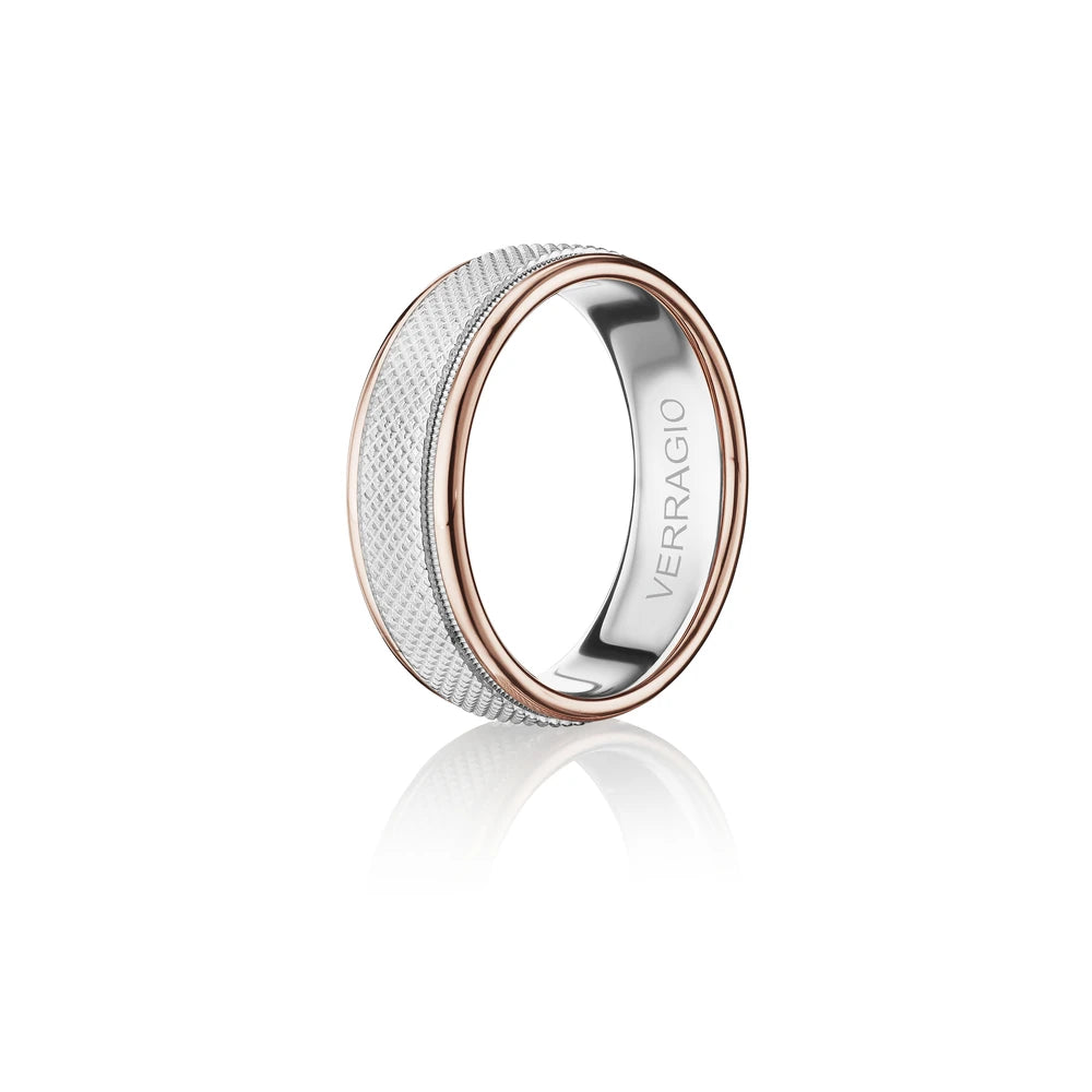 The ultimate in sophistication for wedding bands. This ring combines your choice of textured gold in the center either rose yellow or white with high-polish gold along with edges. Verragio's Signature Beading defines the design with exceptional style while the 7mm width fits comfortably for everyday wear. Available only in 14KT.