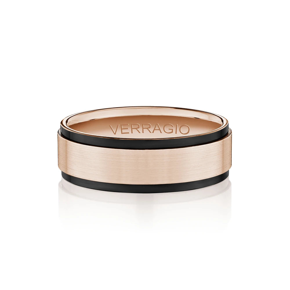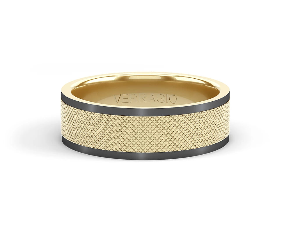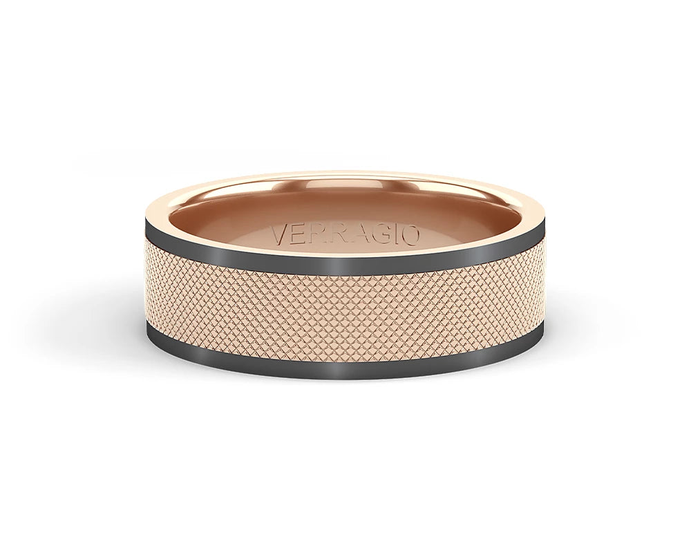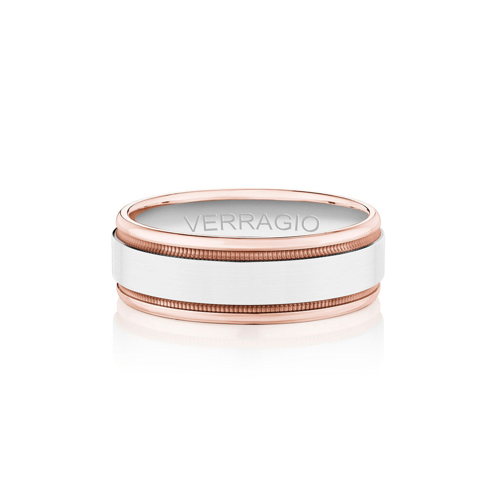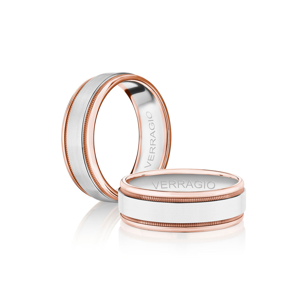 The ultimate in sophistication for wedding bands. This ring combines your choice of textured gold in the center either rose yellow or white with high-polish gold along with edges. Verragio's Signature Beading defines the design with exceptional style while the 7mm width fits comfortably for everyday wear. Available only in 14KT.