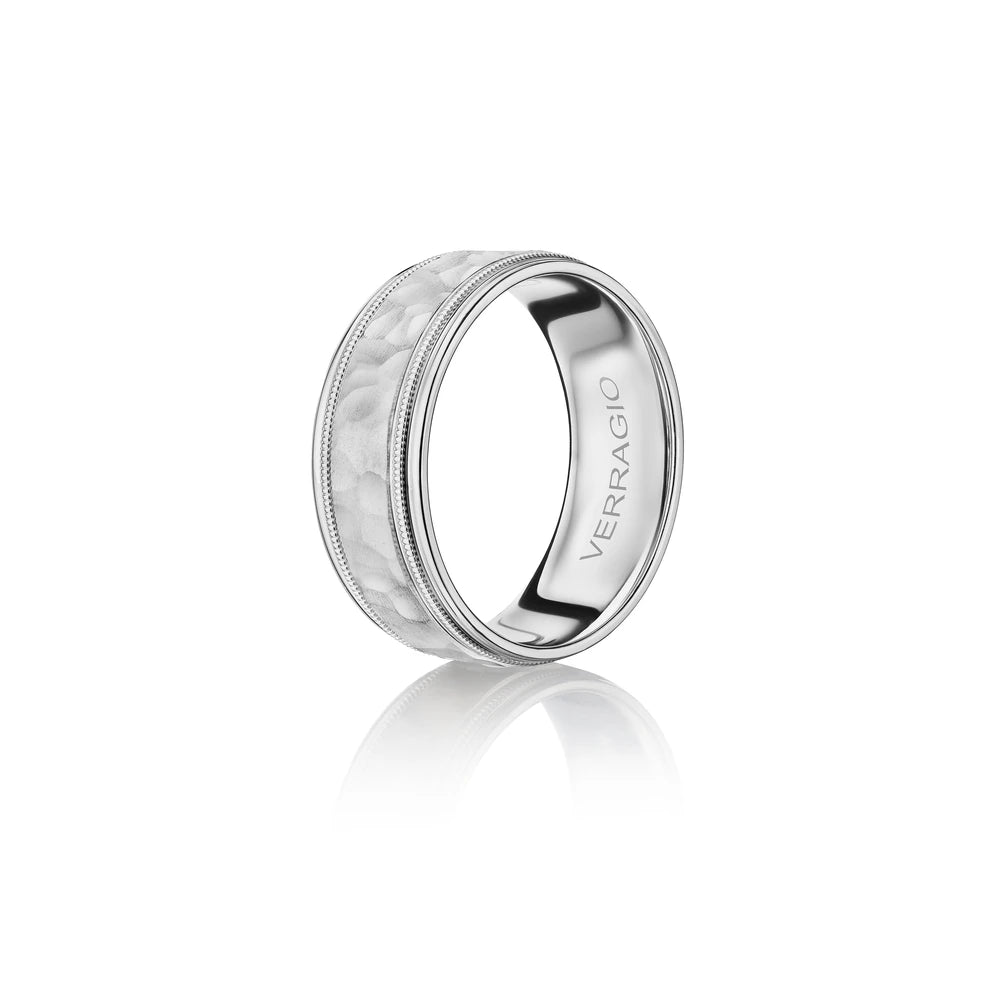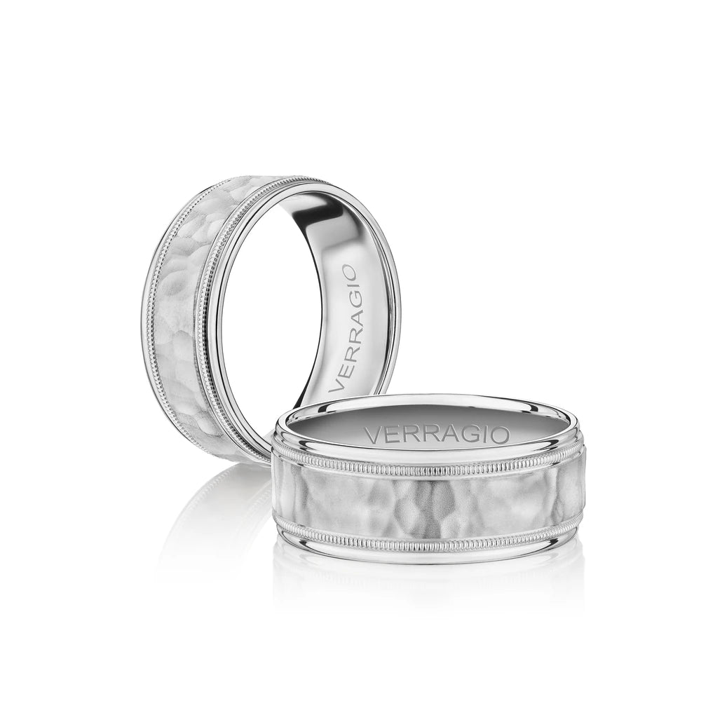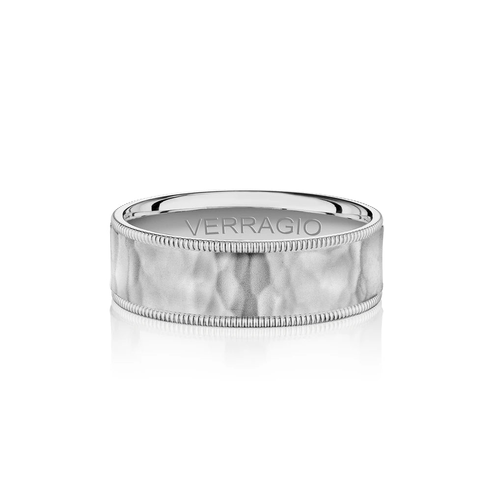 One of our latest wedding band designs in a 8mm width with a hammered matte finish, made complete with signature Verragio bead-work giving it a tailored feel. Whether you prefer modern or traditional styles, these wedding bands are precisely crafted with artisanal details to stand out.