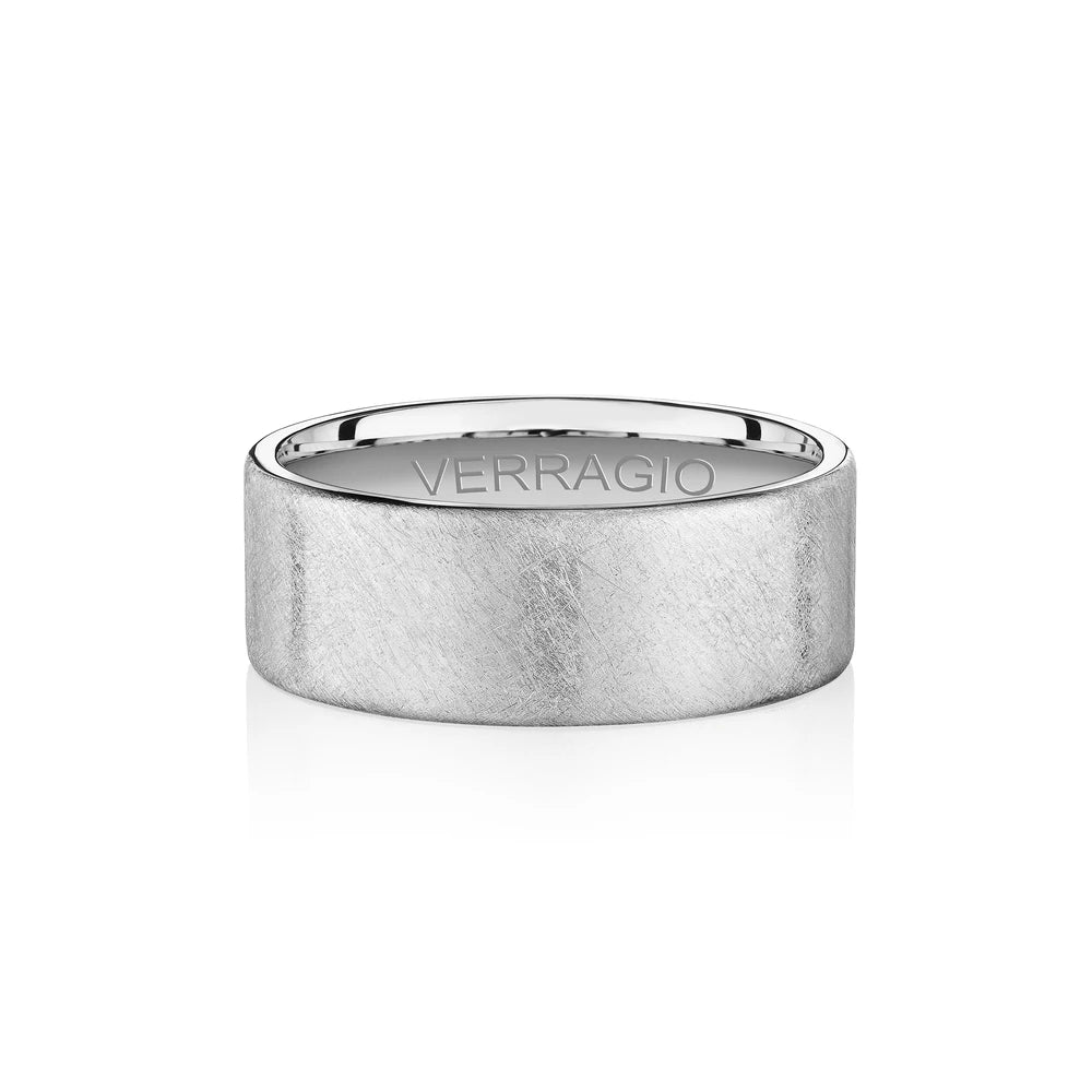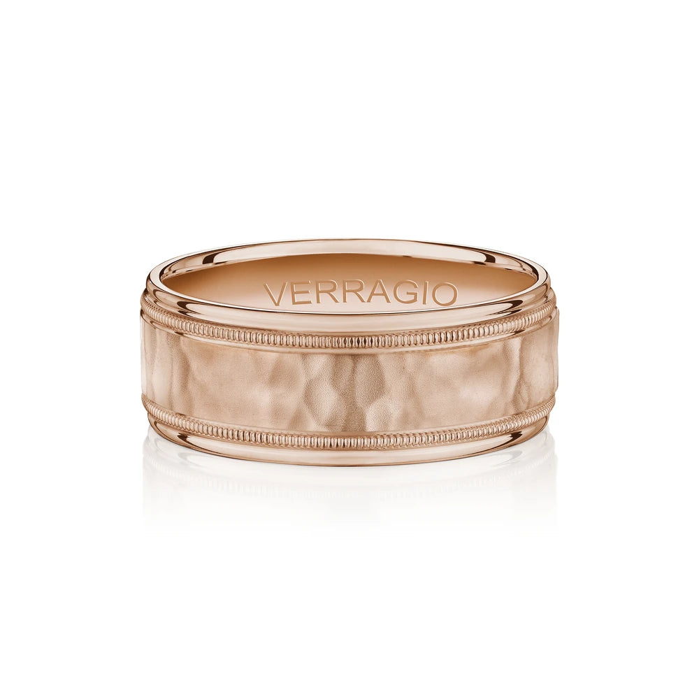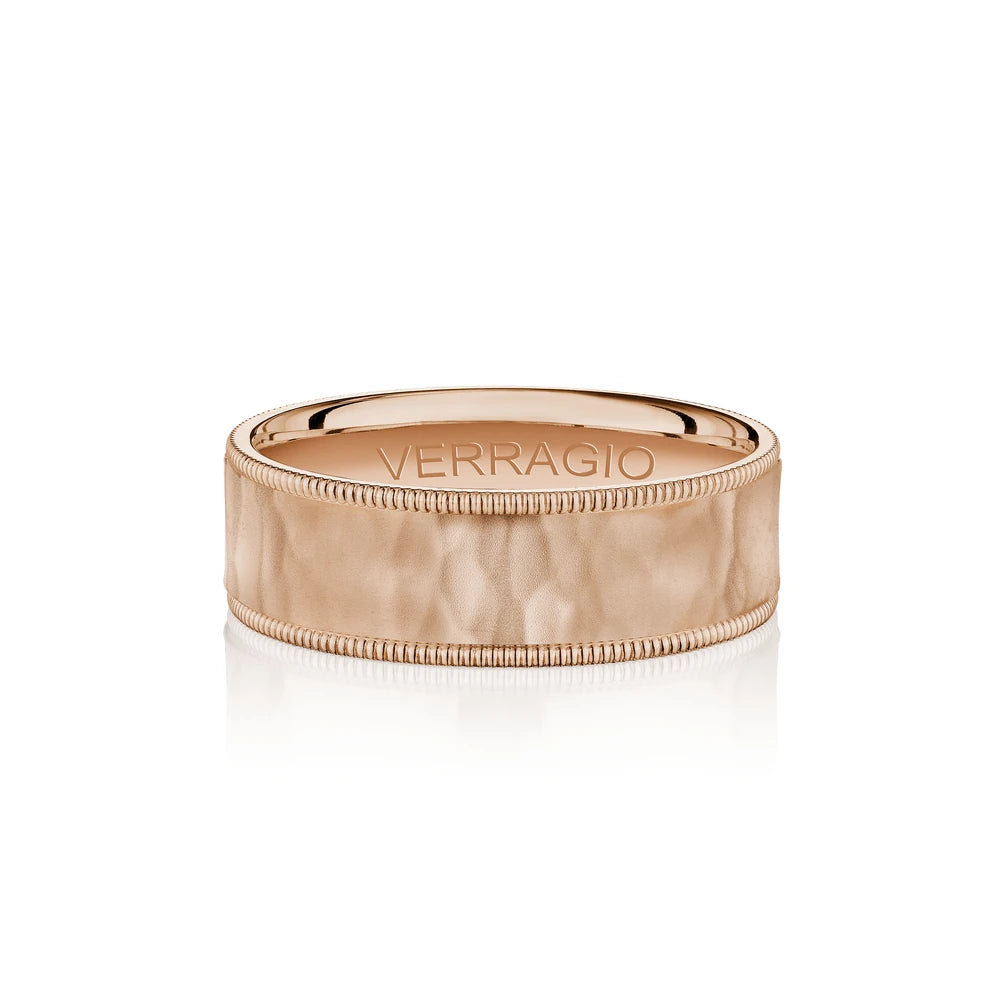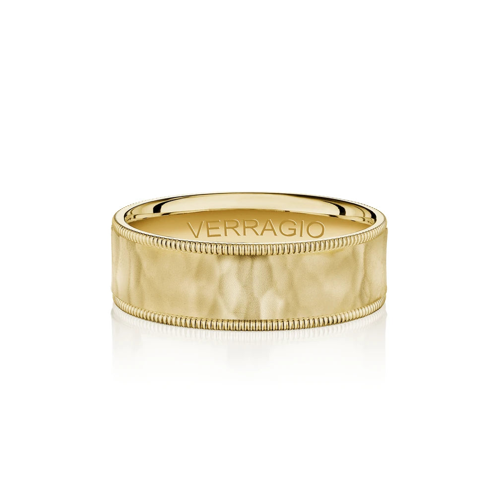 One of our latest wedding band designs in a 8mm width with a hammered matte finish, made complete with signature Verragio bead-work giving it a tailored feel. Whether you prefer modern or traditional styles, these wedding bands are precisely crafted with artisanal details to stand out.