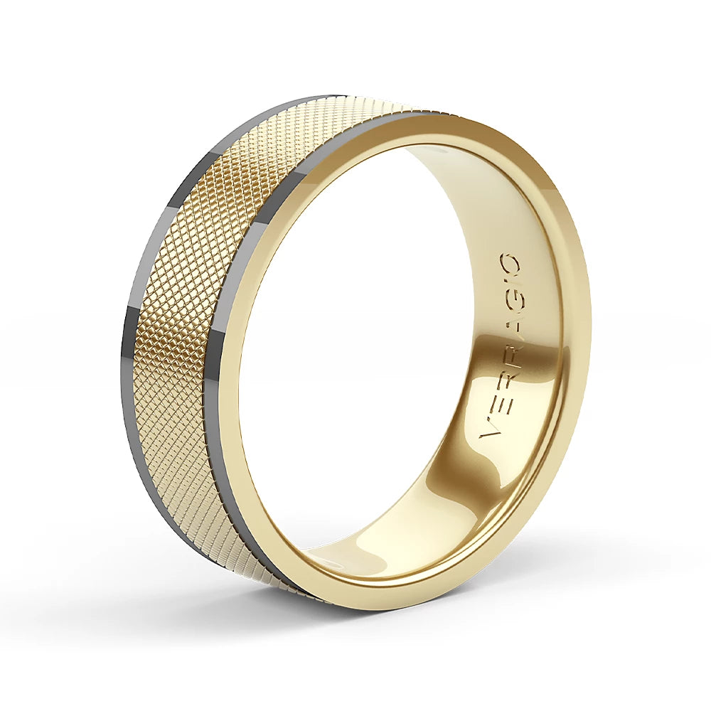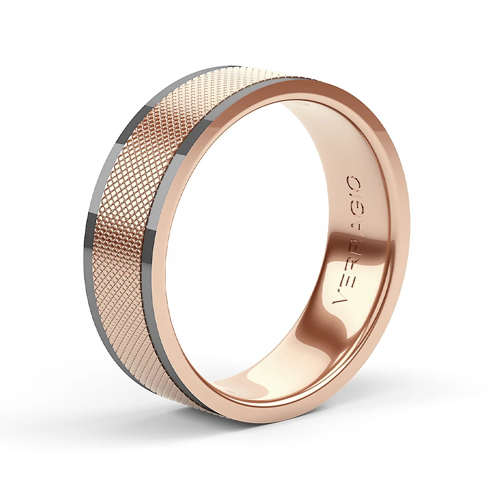 A winning formula for a wedding band: textured gold lined with black rhodium, adding the perfect amount of edge. Choose either rose, yellow, or white gold to make this ring your own while the 7mm width fits comfortably for everyday wear. Available only in 14KT.
