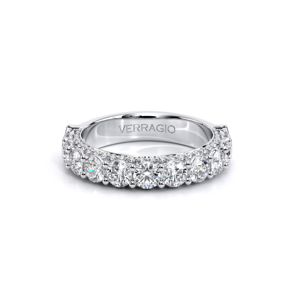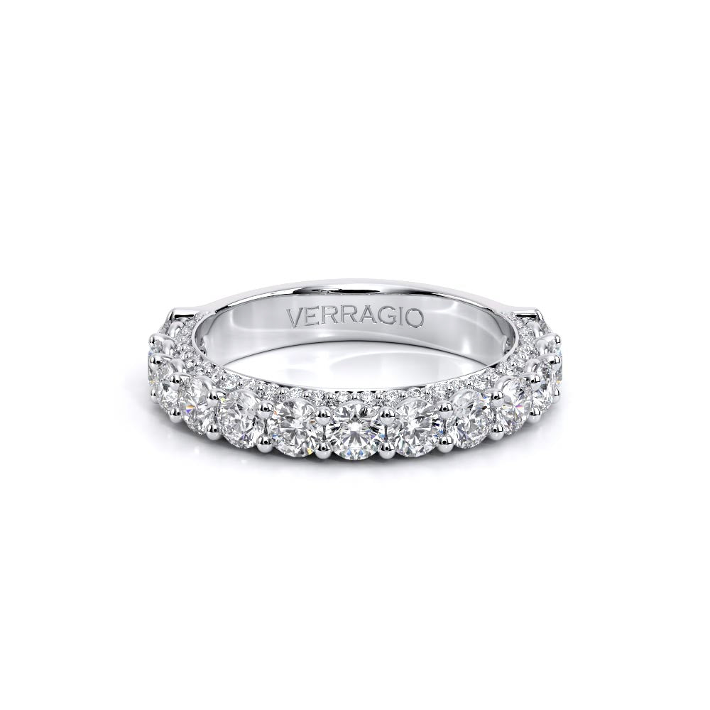 Couture-0488R2.5 is an elevated four-prong engagement setting designed to highlight your center stone. Meticulously-set round diamonds in a shared-prong setting wrap the elegant shank, enhanced with a pave-set three-quarter diamond riviera. This statement look is perfected with the distinctive Verragio signature crest.