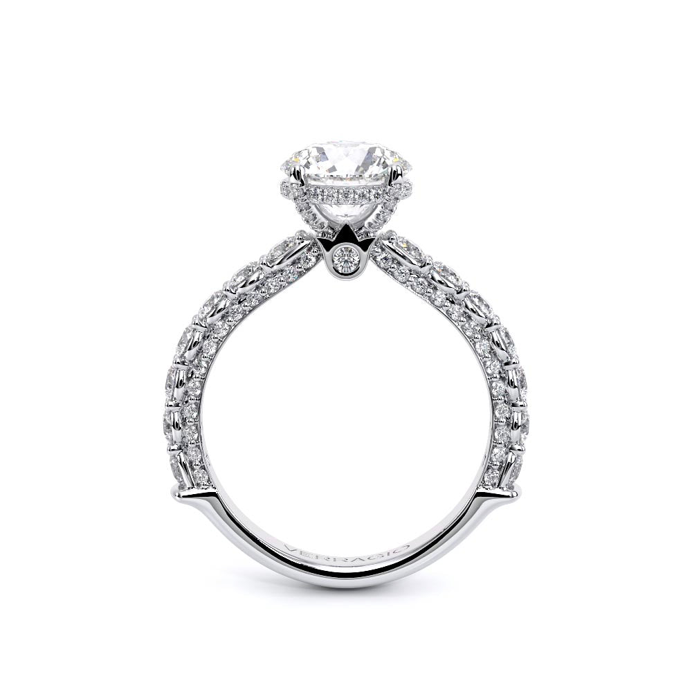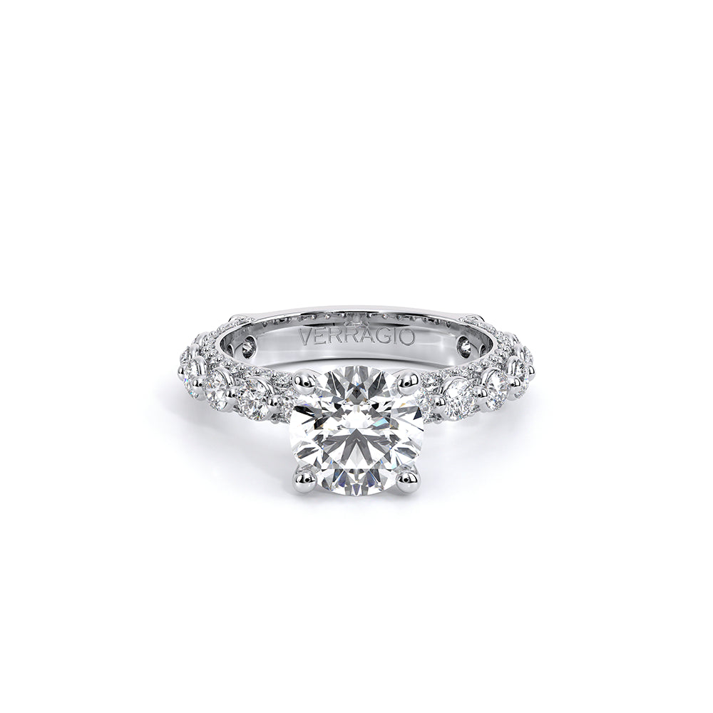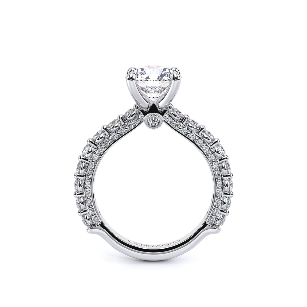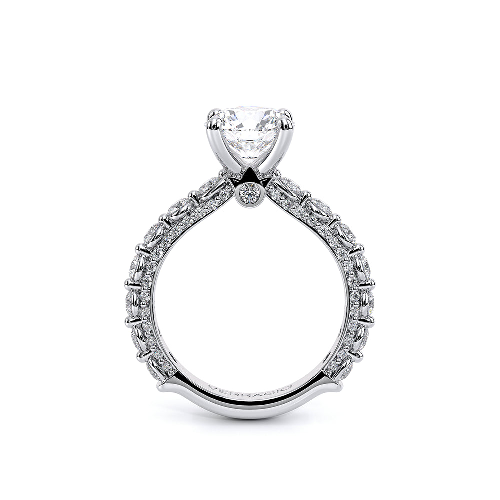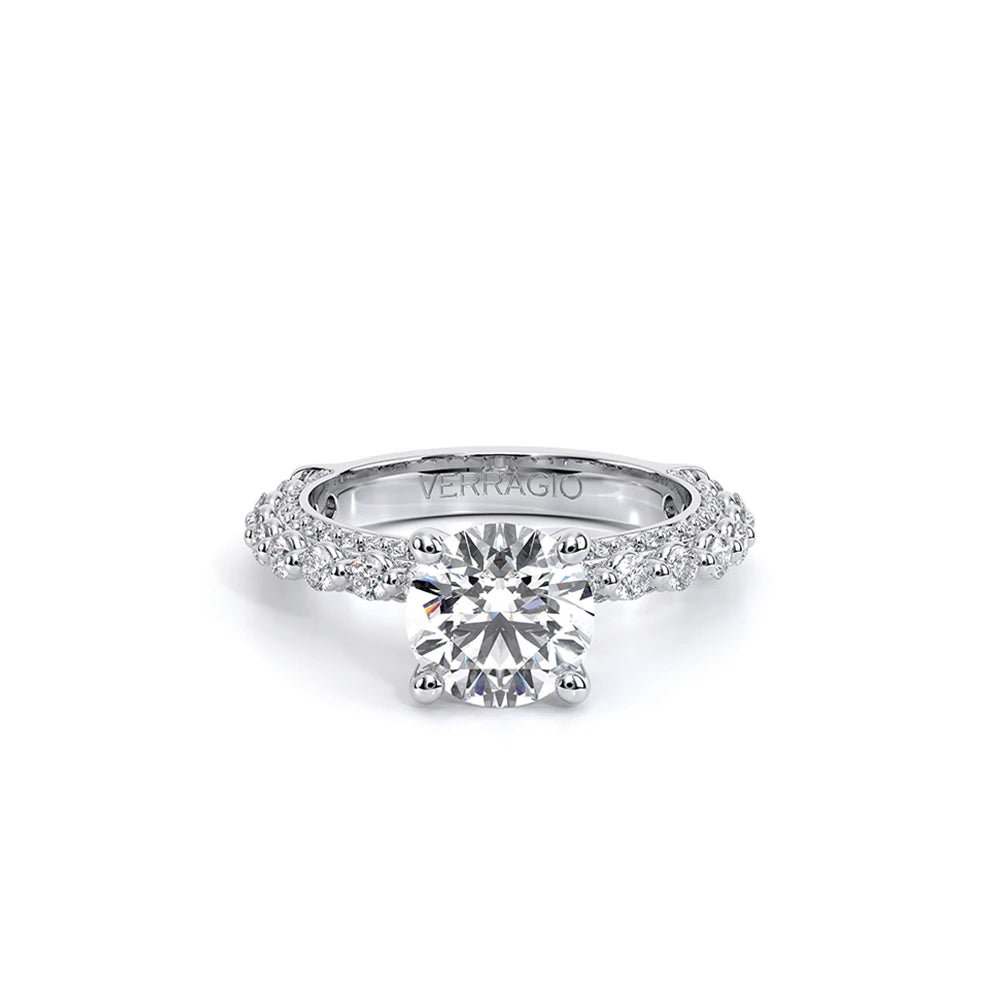 Couture-0489R-3.0 is an elevated four-prong engagement ring featuring a diamond-bridge head designed to highlight your center stone. Meticulously-set round diamonds in a shared-prong setting wrap the elegant shank, enhanced with a pave-set three-quarter diamond riviera. The Verragio signature crest completes the statement look.