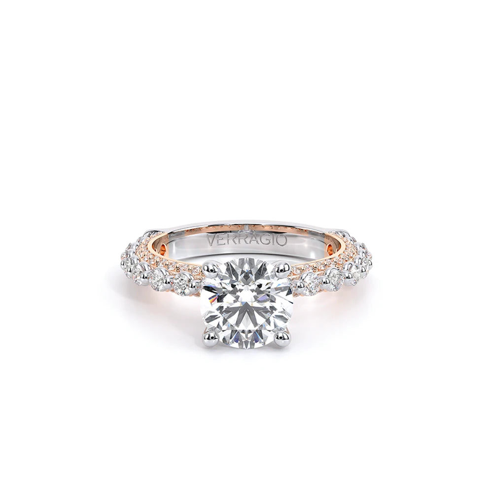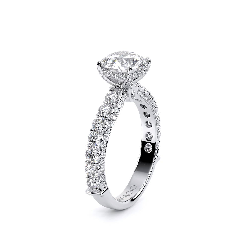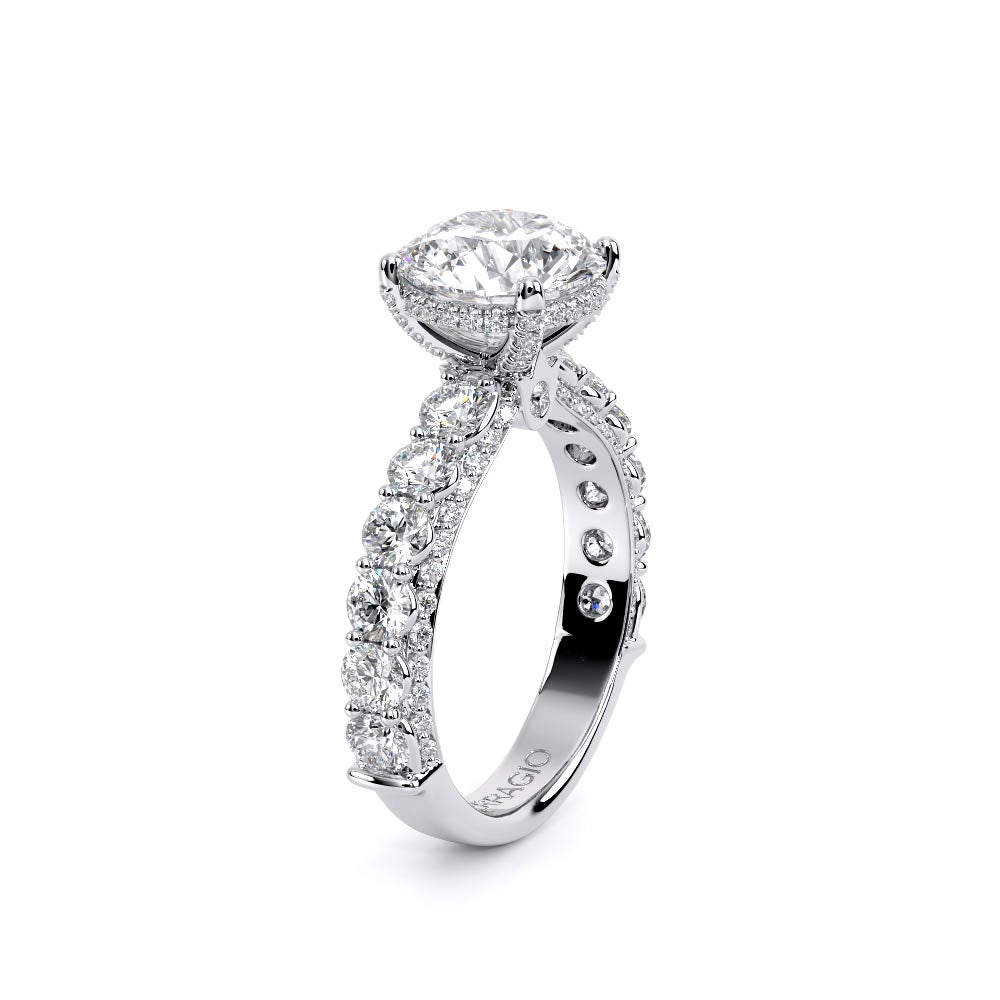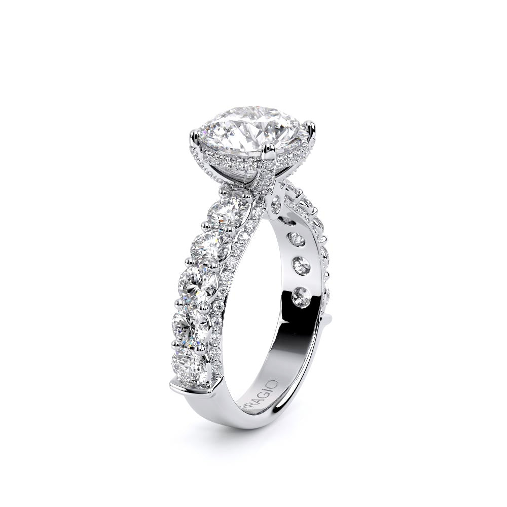Couture-0489R-3.0 is an elevated four-prong engagement ring featuring a diamond-bridge head designed to highlight your center stone. Meticulously-set round diamonds in a shared-prong setting wrap the elegant shank, enhanced with a pave-set three-quarter diamond riviera. The Verragio signature crest completes the statement look.
