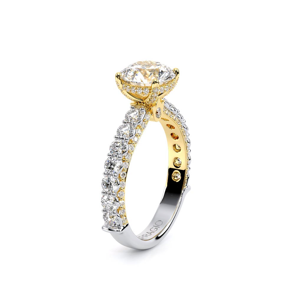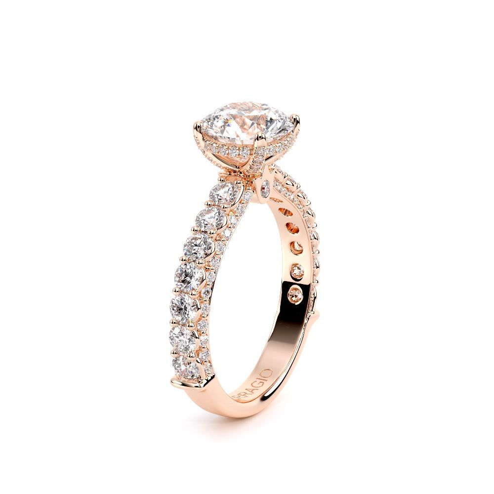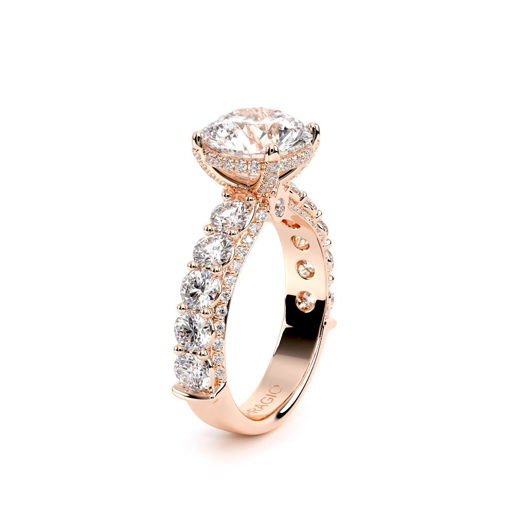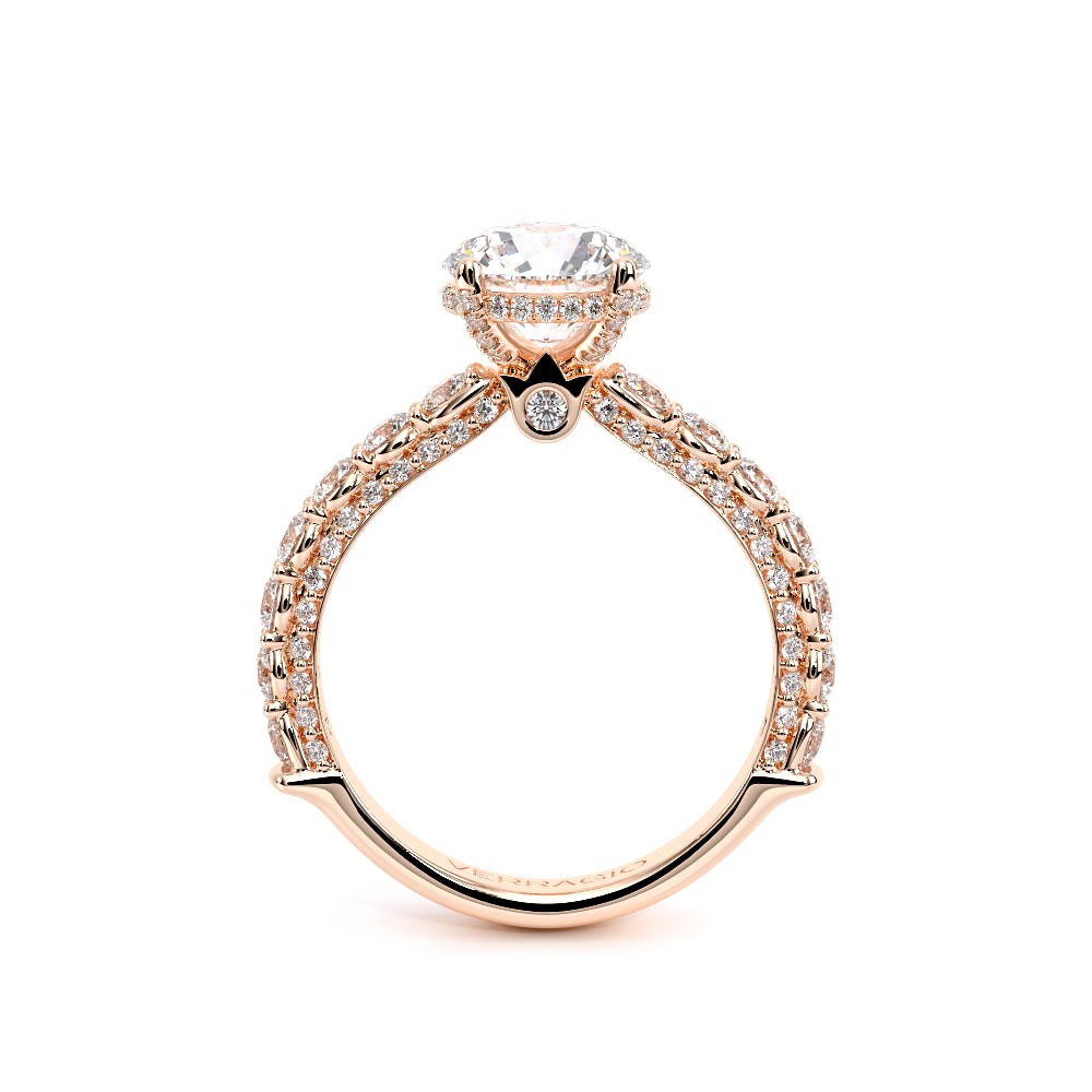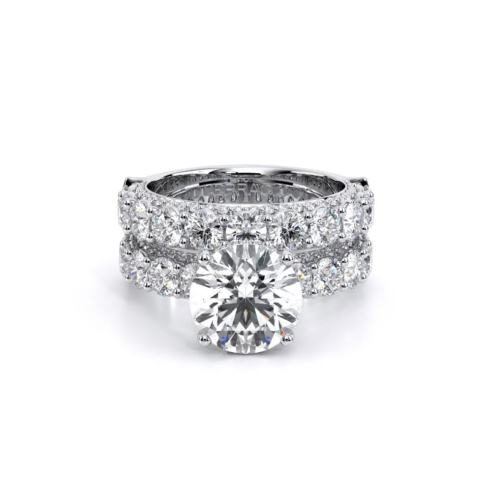 Couture-0489R-3.0 is an elevated four-prong engagement ring featuring a diamond-bridge head designed to highlight your center stone. Meticulously-set round diamonds in a shared-prong setting wrap the elegant shank, enhanced with a pave-set three-quarter diamond riviera. The Verragio signature crest completes the statement look.