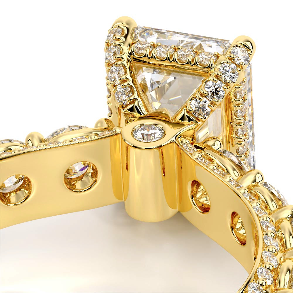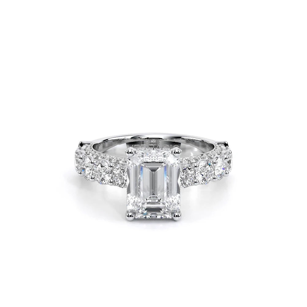 Couture-0489EM-3.4 is an elevated four-prong engagement ring featuring a diamond-bridge head designed to highlight your center stone. Meticulously-set round diamonds in a shared-prong setting wrap the elegant shank, enhanced with a pave-set three-quarter diamond riviera. The Verragio signature crest completes the statement look.
