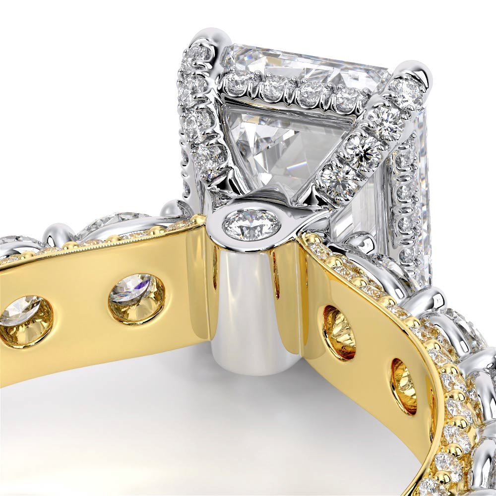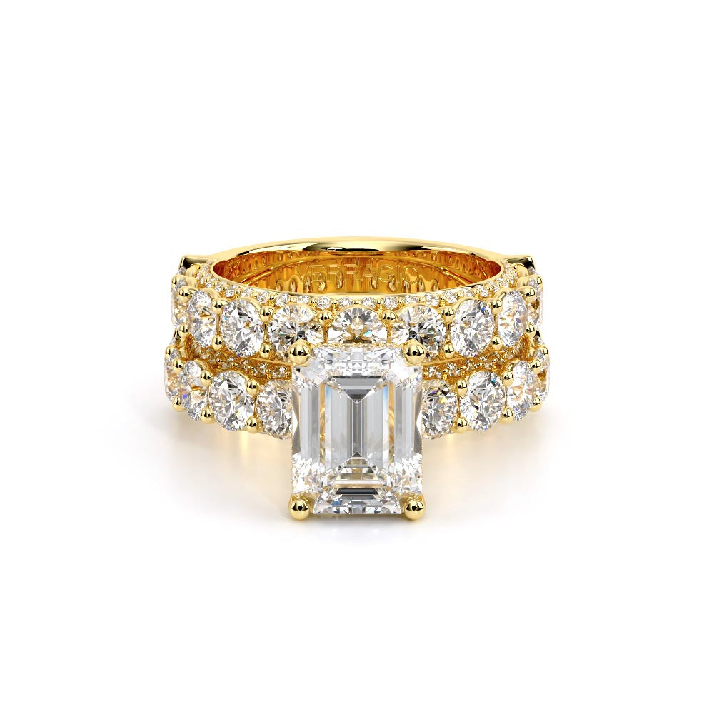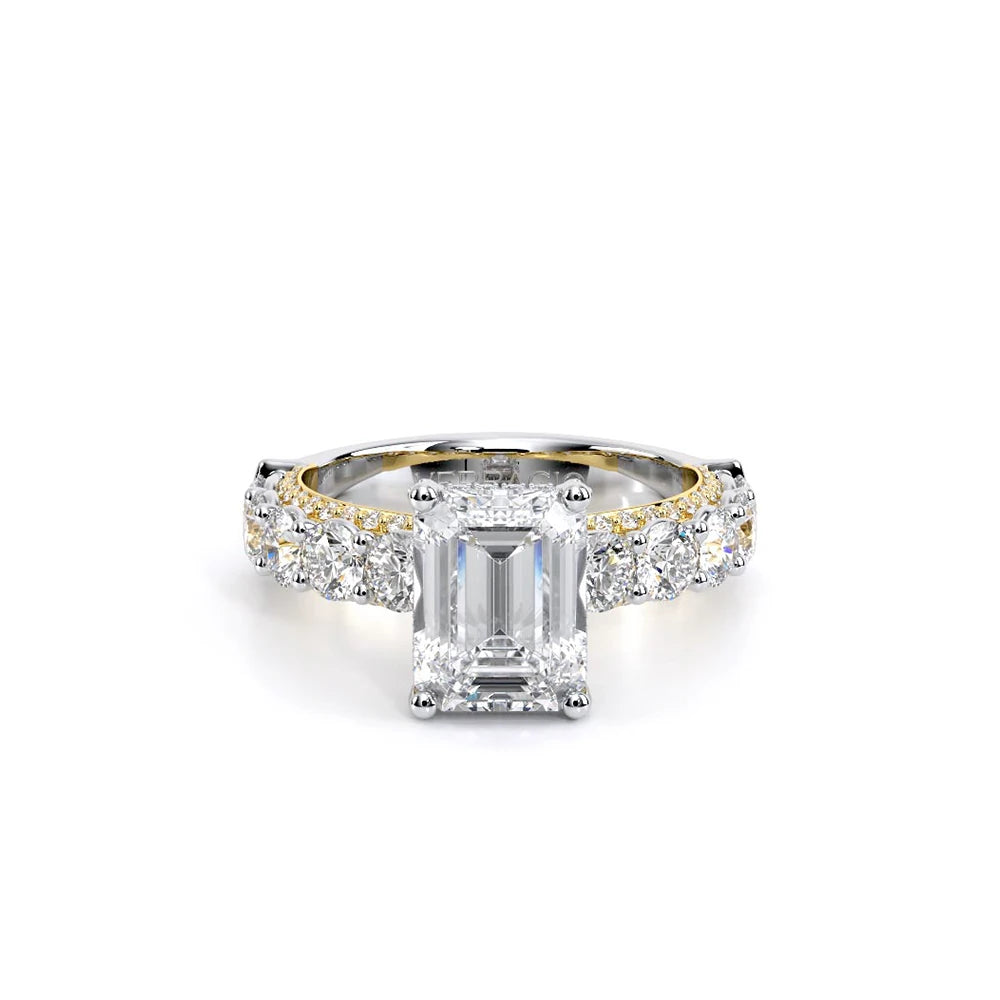 Couture-0489EM-2.5 is an elevated four-prong engagement ring featuring a diamond-bridge head designed to highlight your center stone. Meticulously-set round diamonds in a shared-prong setting wrap the elegant shank, enhanced with a pave-set three-quarter diamond riviera. The Verragio signature crest completes the statement look.
