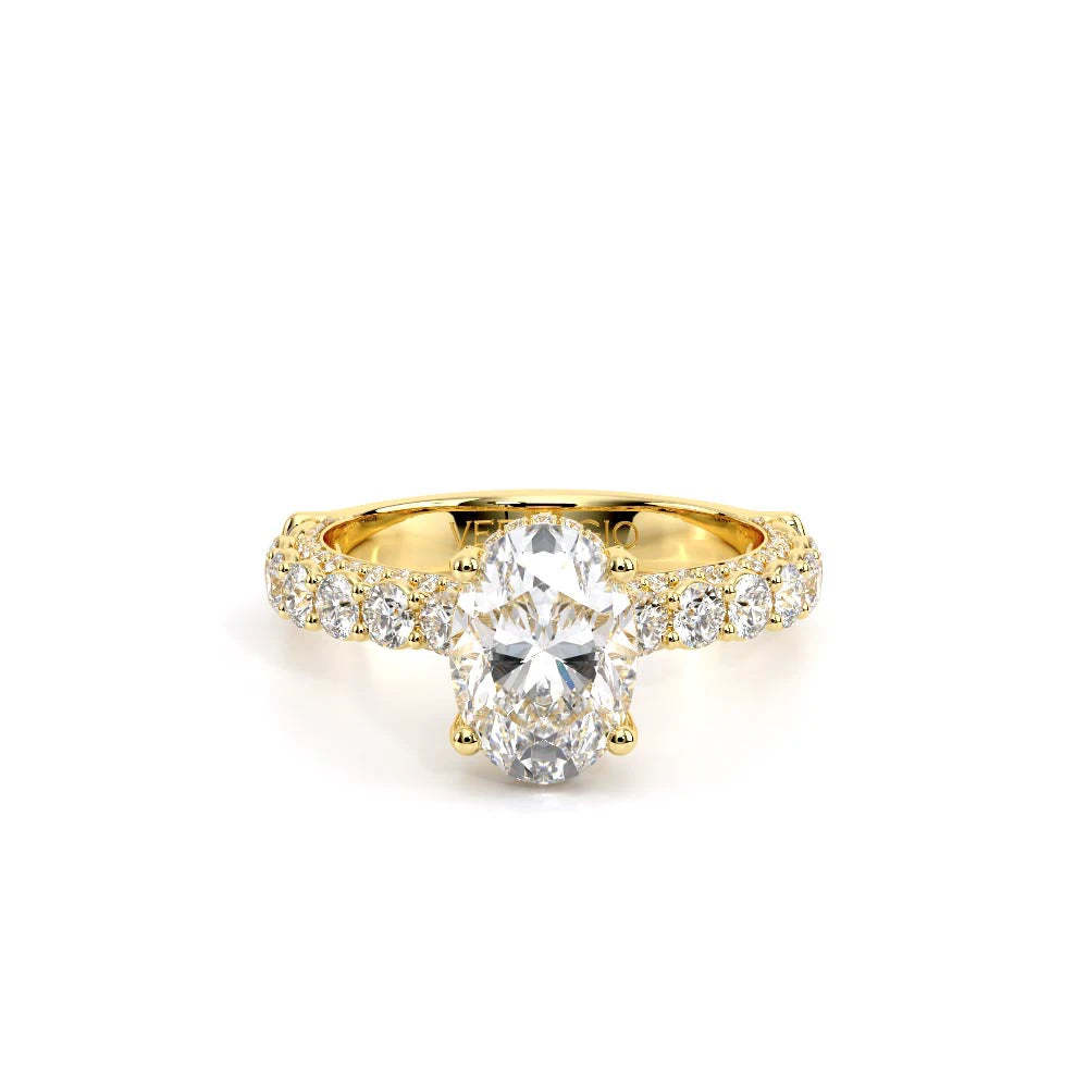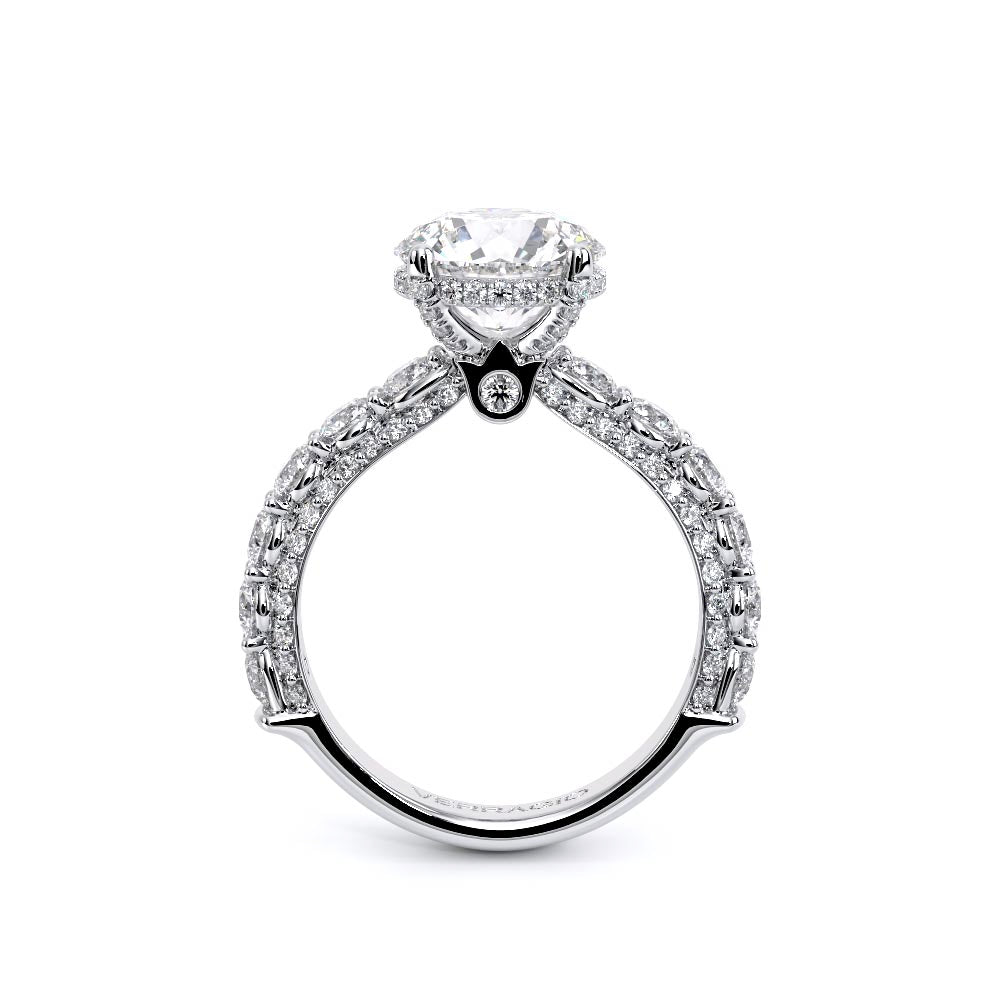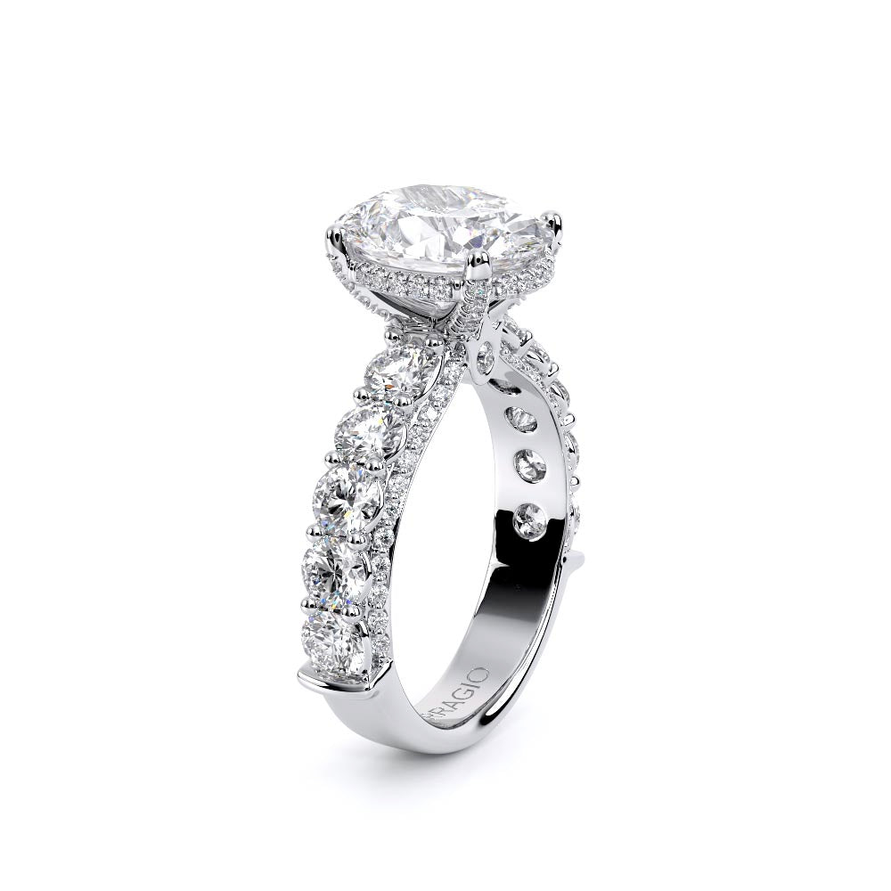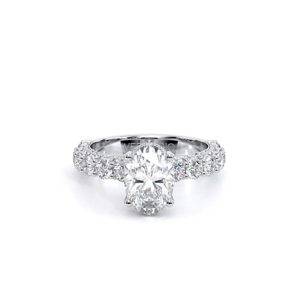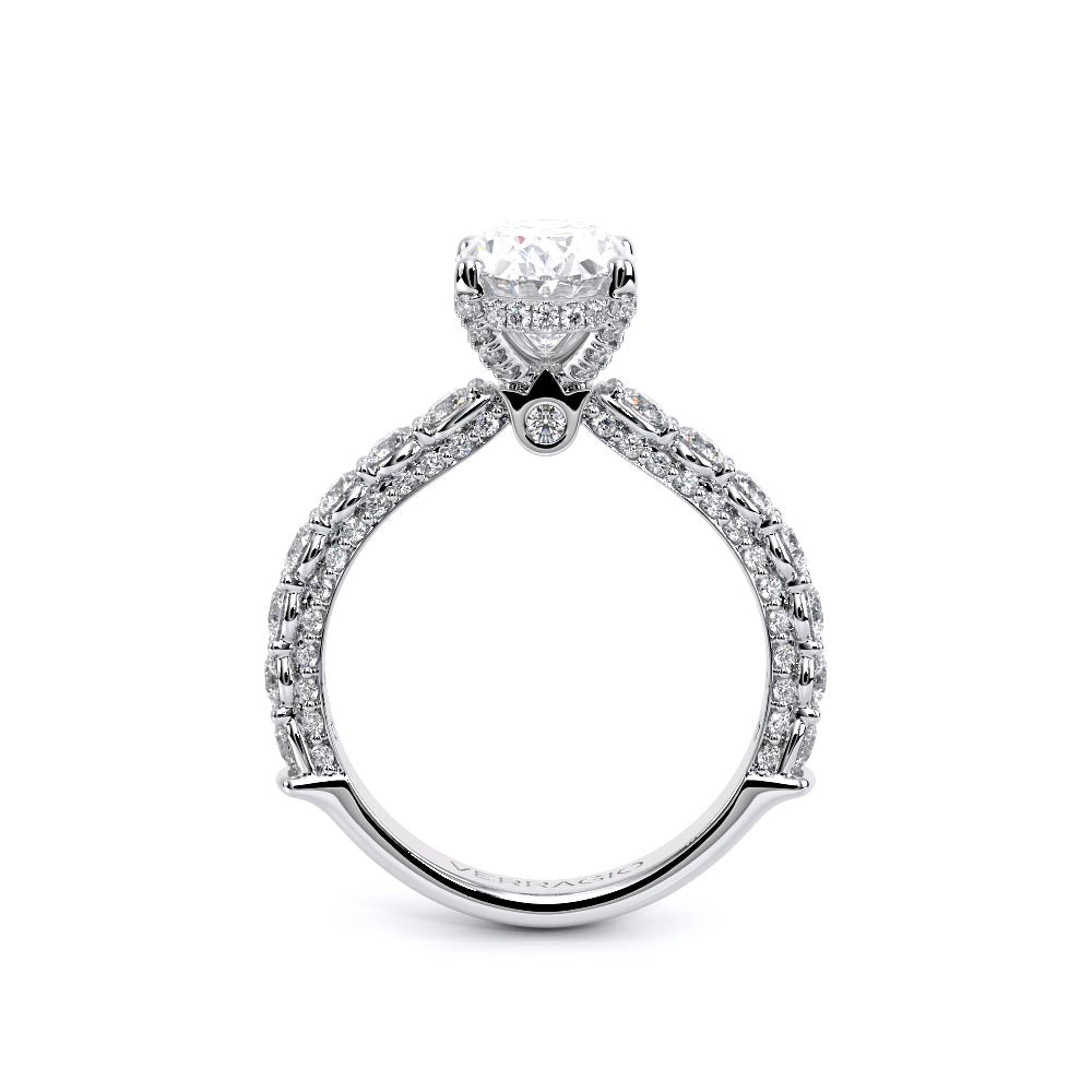 Couture-0489OV-3.0 is an elevated four-prong engagement ring featuring a diamond-bridge head designed to highlight your center stone. Meticulously-set round diamonds in a shared-prong setting wrap the elegant shank, enhanced with a pave-set three-quarter diamond riviera. The Verragio signature crest completes the statement look.