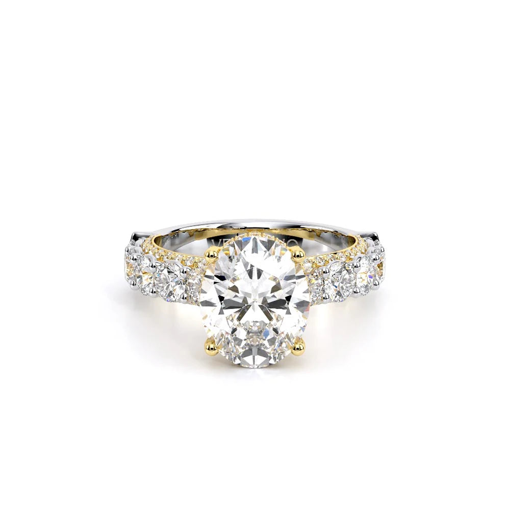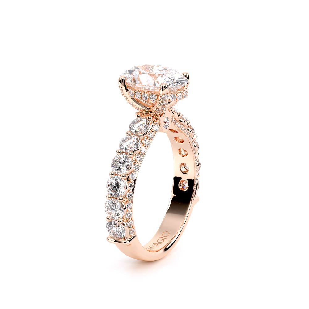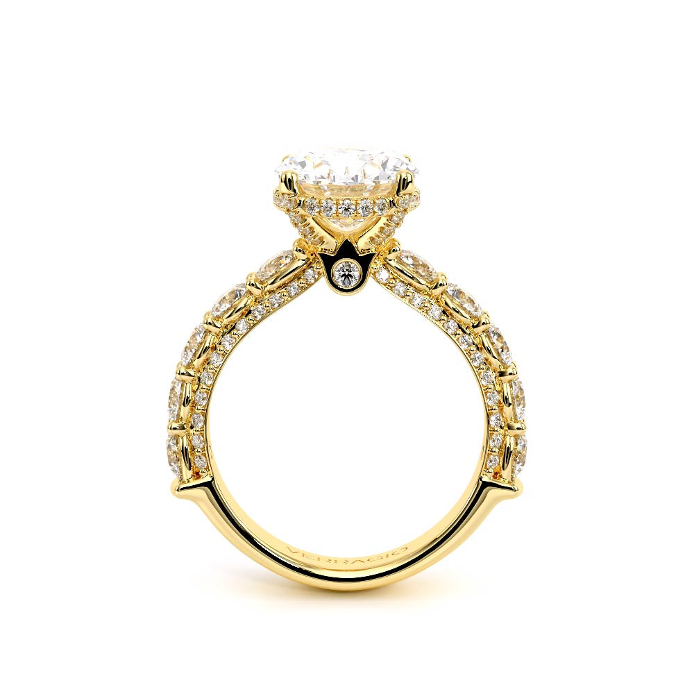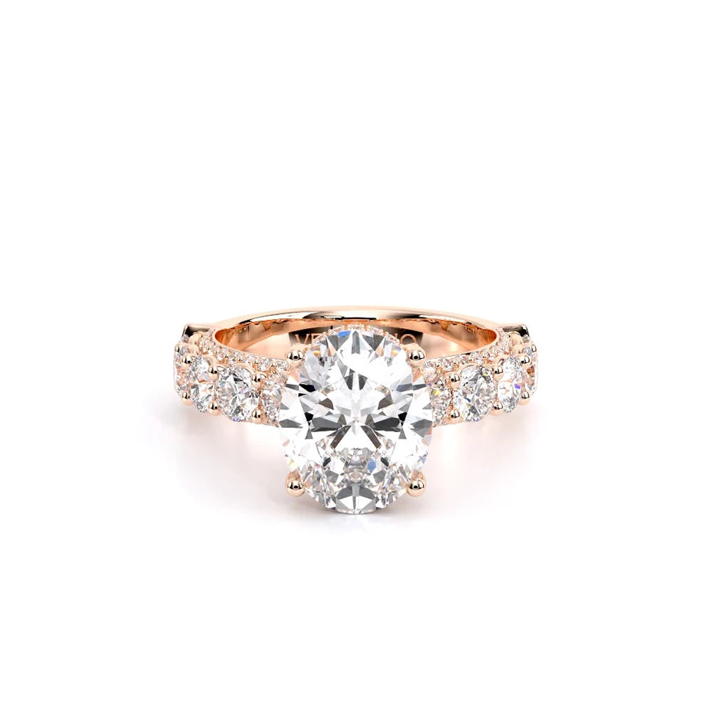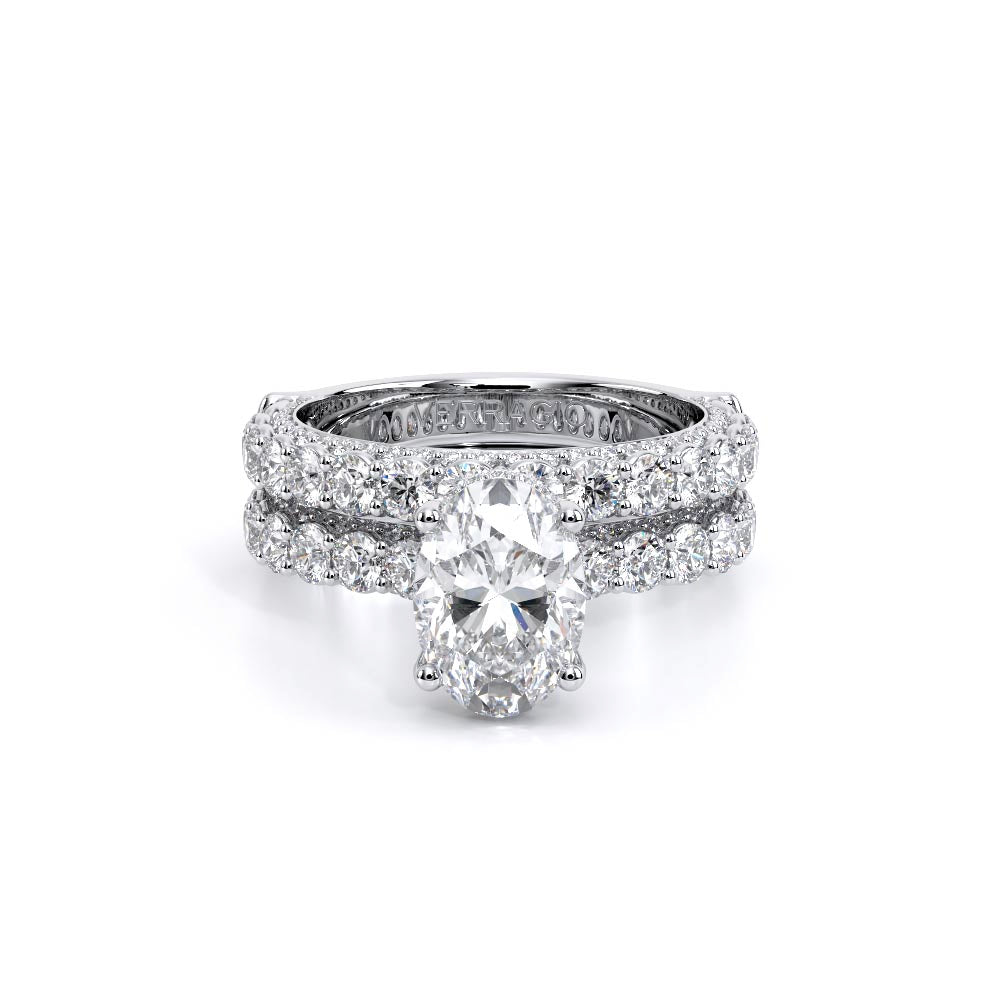 Couture-0489OV-3.0 is an elevated four-prong engagement ring featuring a diamond-bridge head designed to highlight your center stone. Meticulously-set round diamonds in a shared-prong setting wrap the elegant shank, enhanced with a pave-set three-quarter diamond riviera. The Verragio signature crest completes the statement look.
