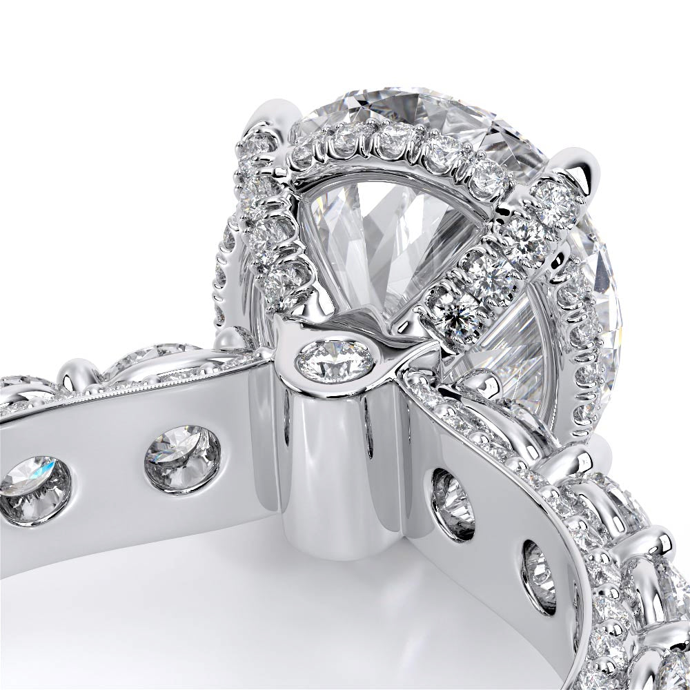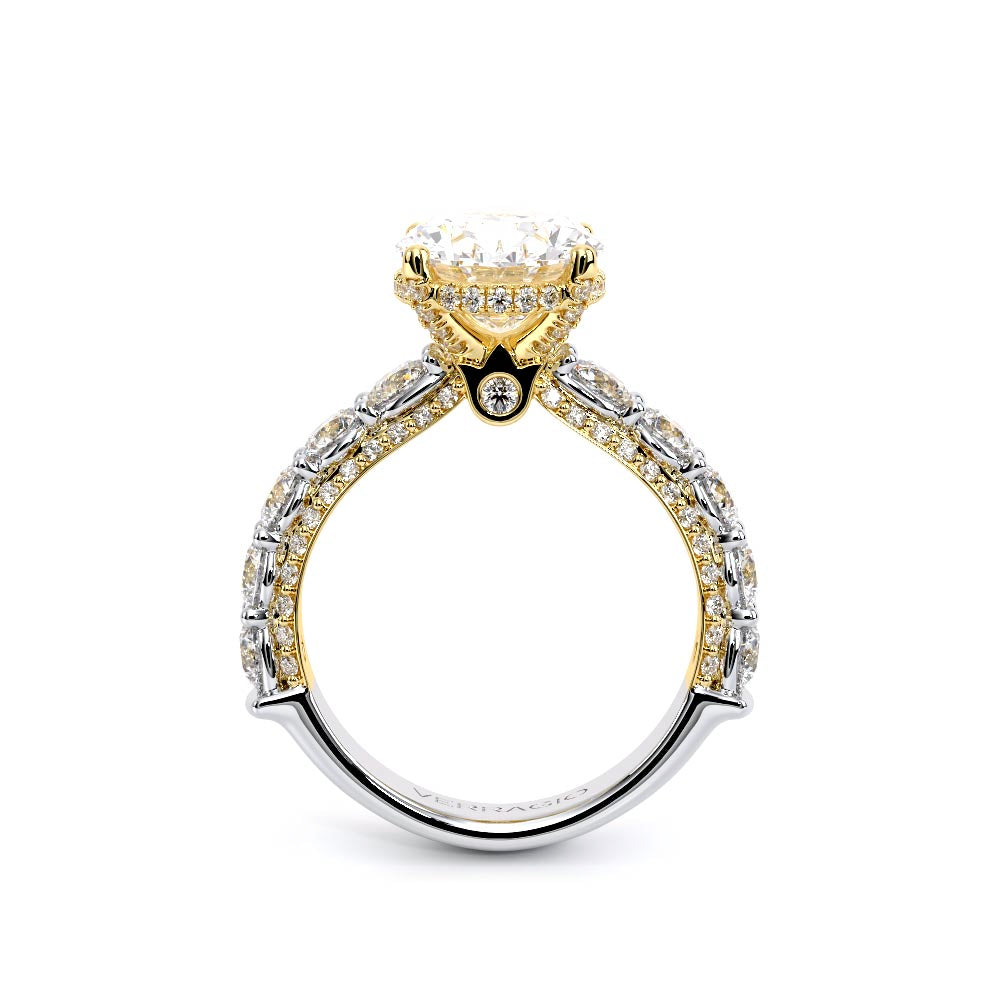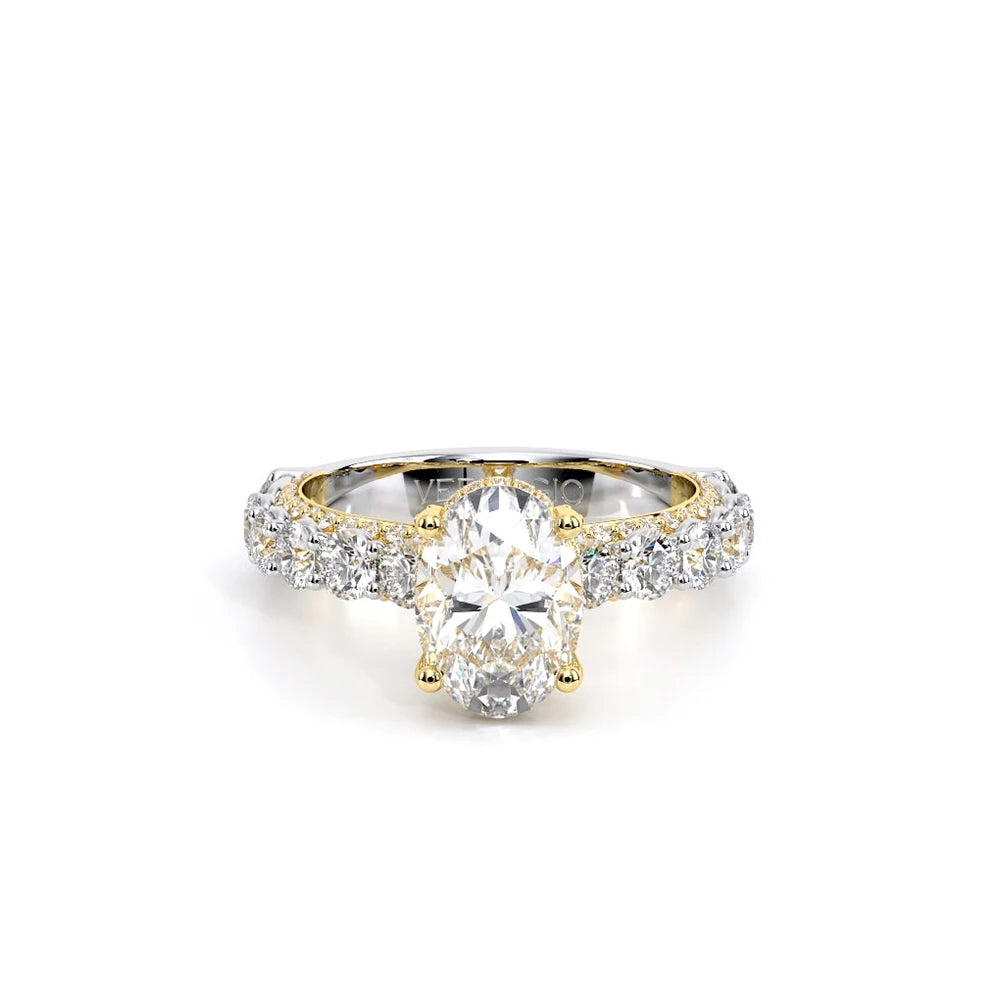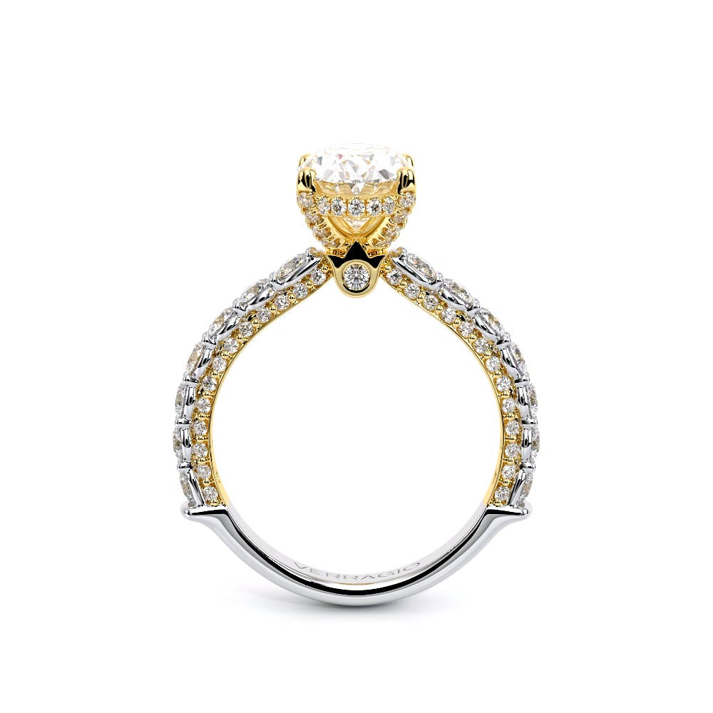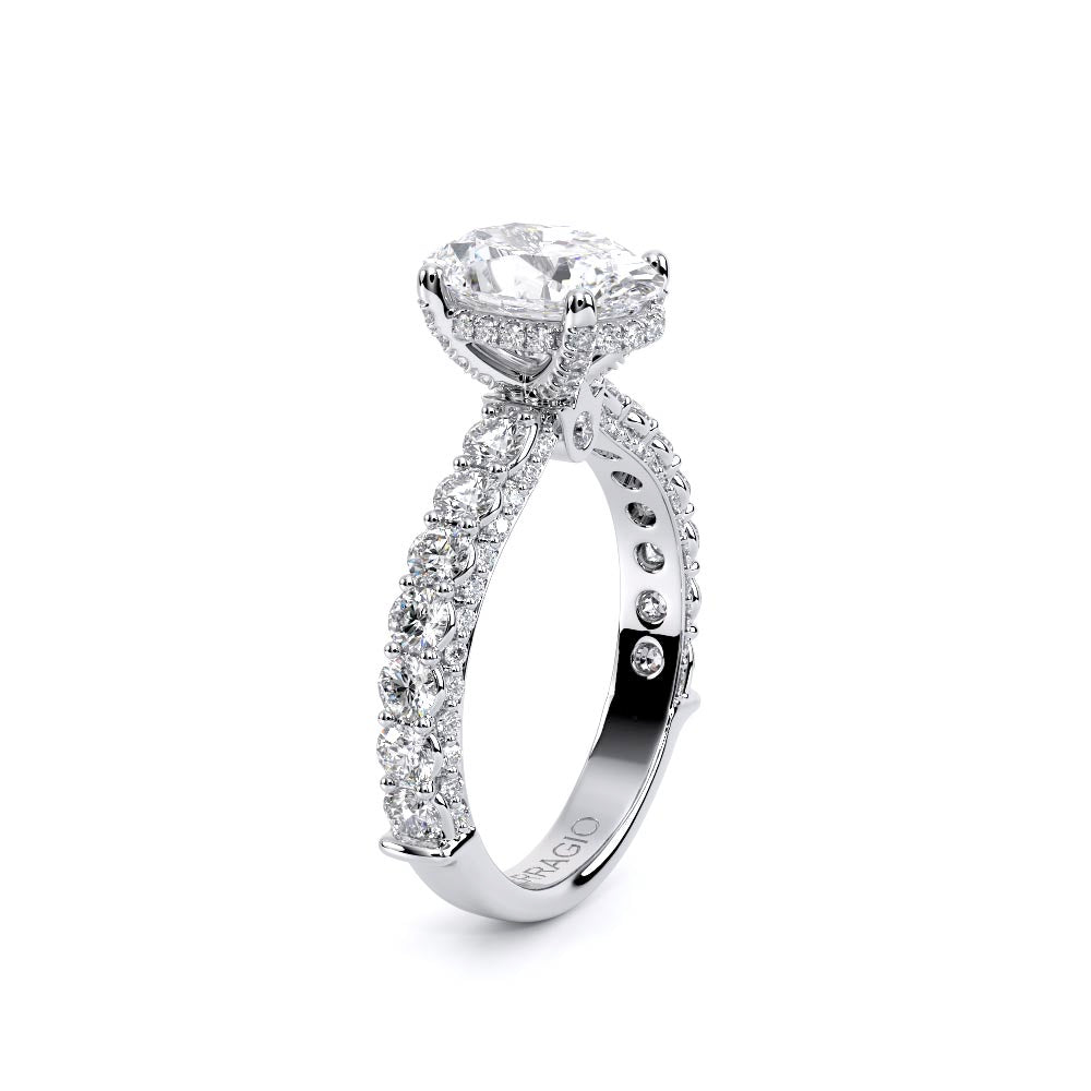 Couture-0489OV-2.5 is an elevated four-prong engagement ring featuring a diamond-bridge head designed to highlight your center stone. Meticulously-set round diamonds in a shared-prong setting wrap the elegant shank, enhanced with a pave-set three-quarter diamond riviera. The Verragio signature crest completes the statement look.