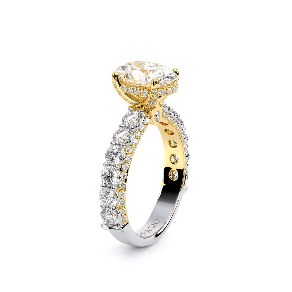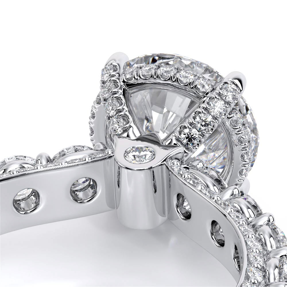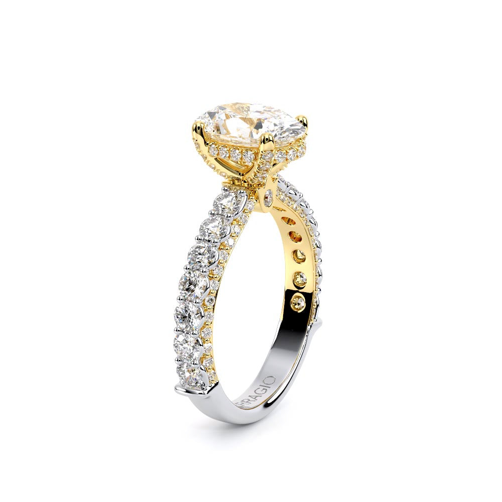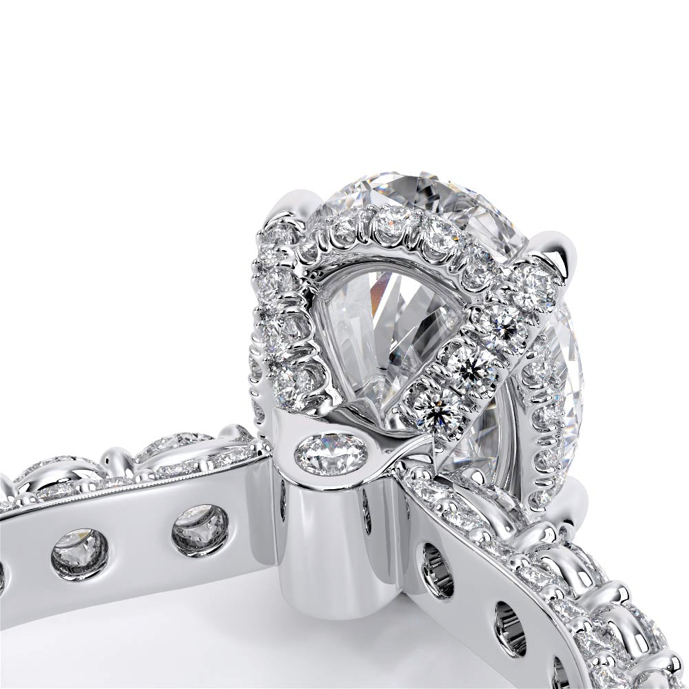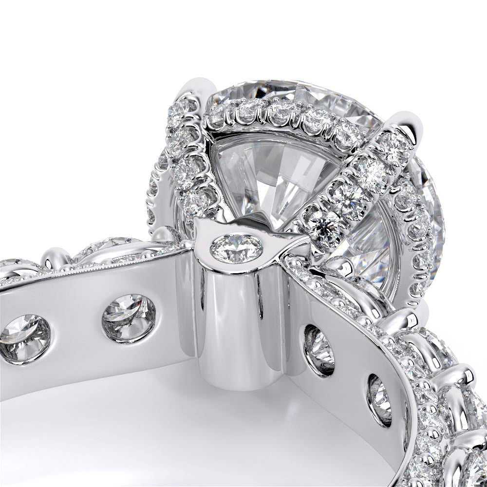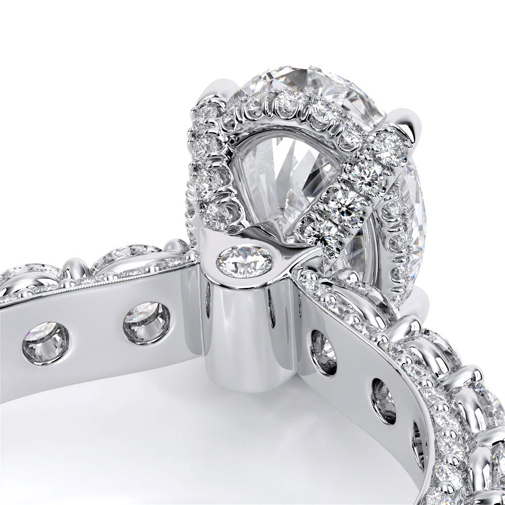 Couture-0489OV-2.5 is an elevated four-prong engagement ring featuring a diamond-bridge head designed to highlight your center stone. Meticulously-set round diamonds in a shared-prong setting wrap the elegant shank, enhanced with a pave-set three-quarter diamond riviera. The Verragio signature crest completes the statement look.